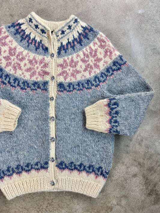 Vintage 1980s Alva Knit Icelandic 100% Wool Blue & Pink Fair Isle Cardigan | Large