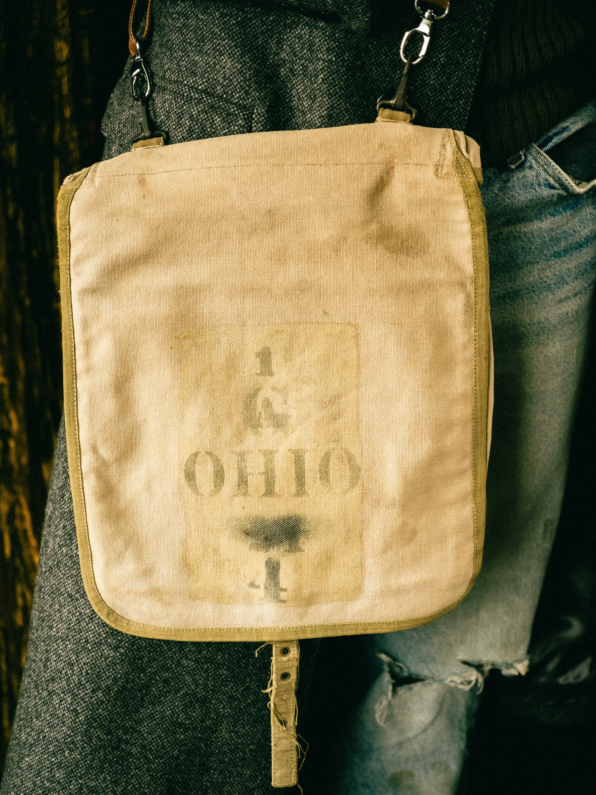 Antique 1900s Military Issue Canvas “OHIO” Haversack Bag. Flapover-style with a buckle closure. Does not come with a strap.