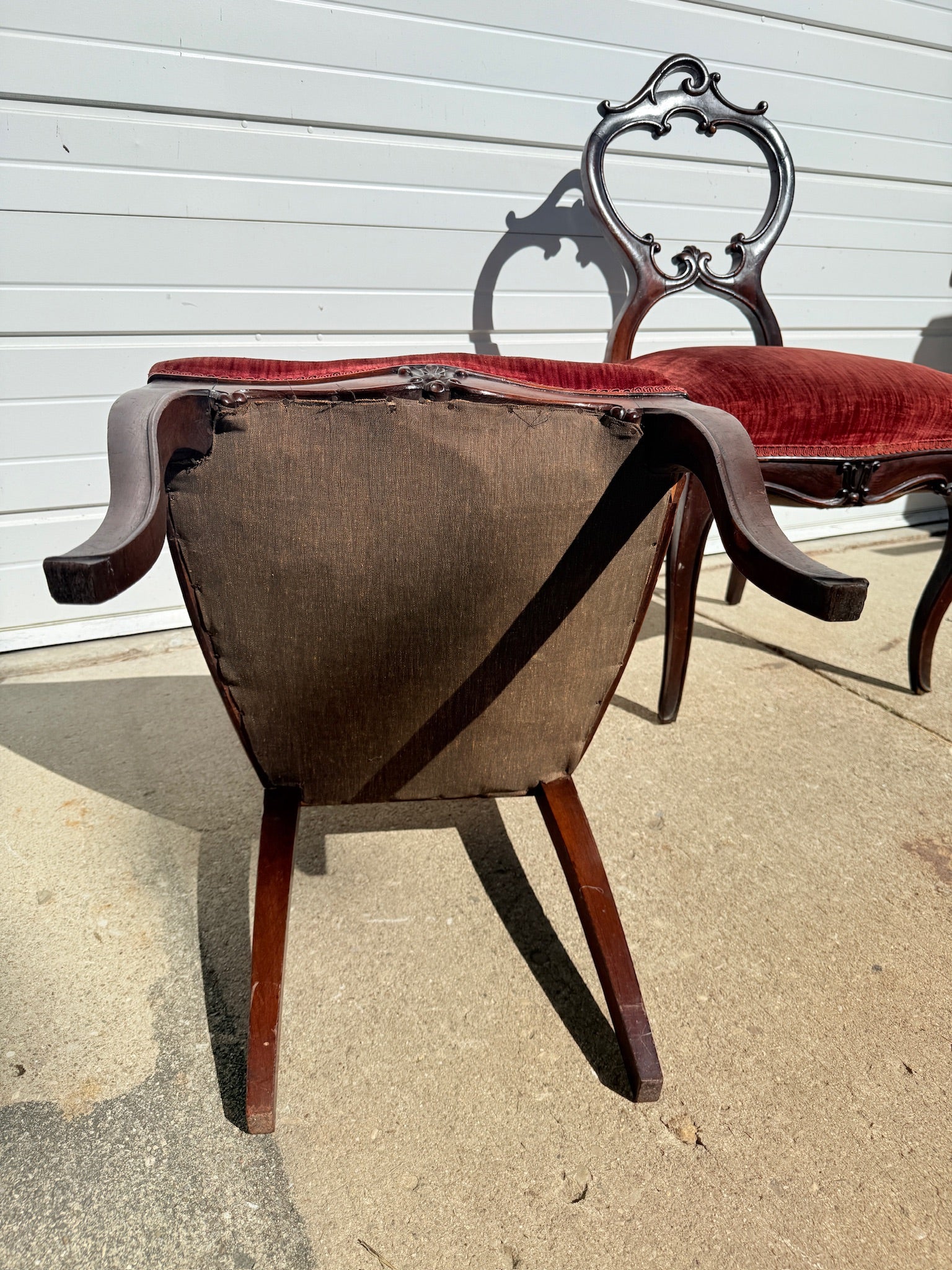 Antique 1900s Red Velvet Carved Rosewood Balloon Back Chair Set (2).