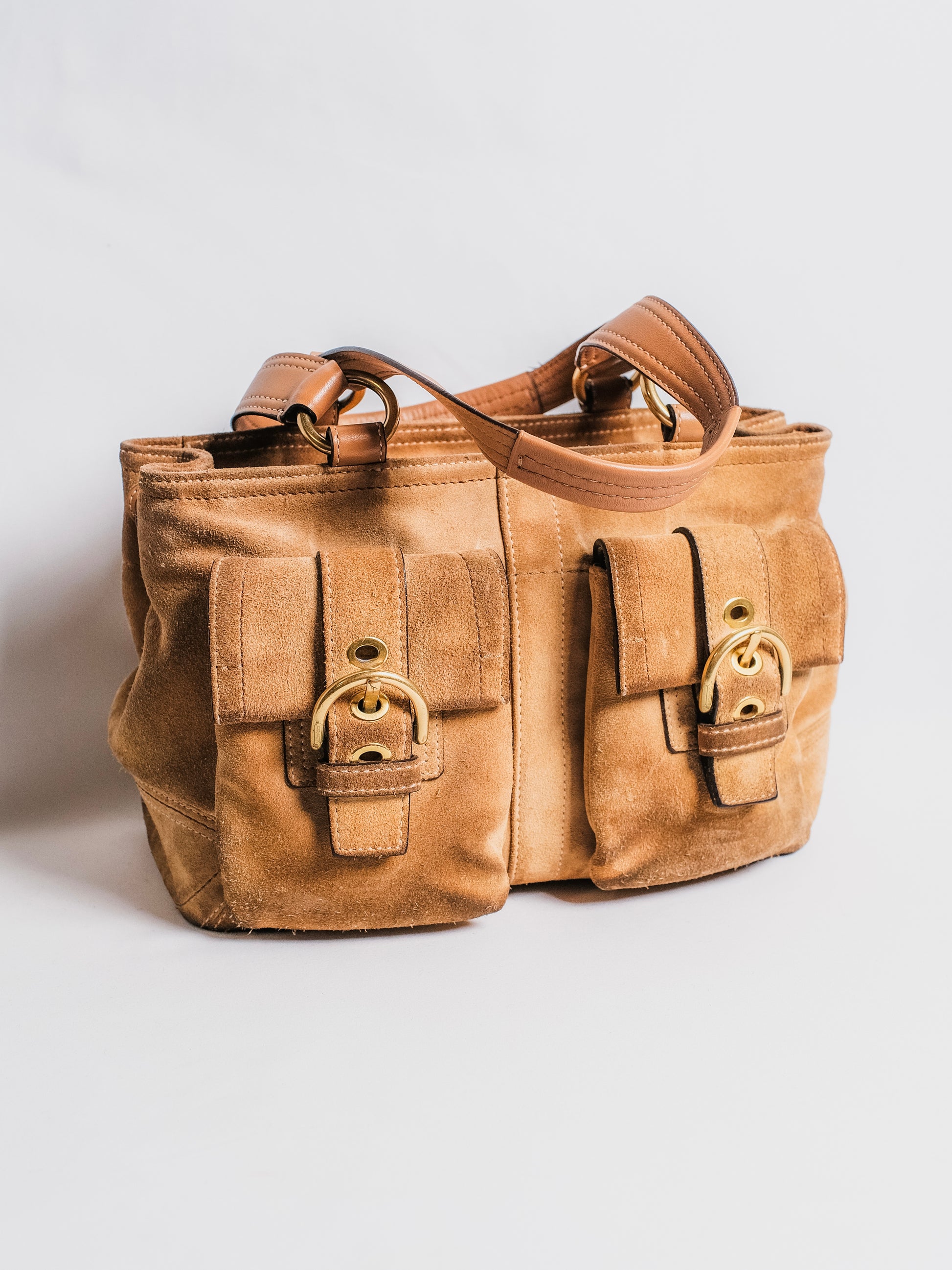 Y2K Coach Soho Tan Suede Leather Shoulder Bag w/ Buckle Pockets.