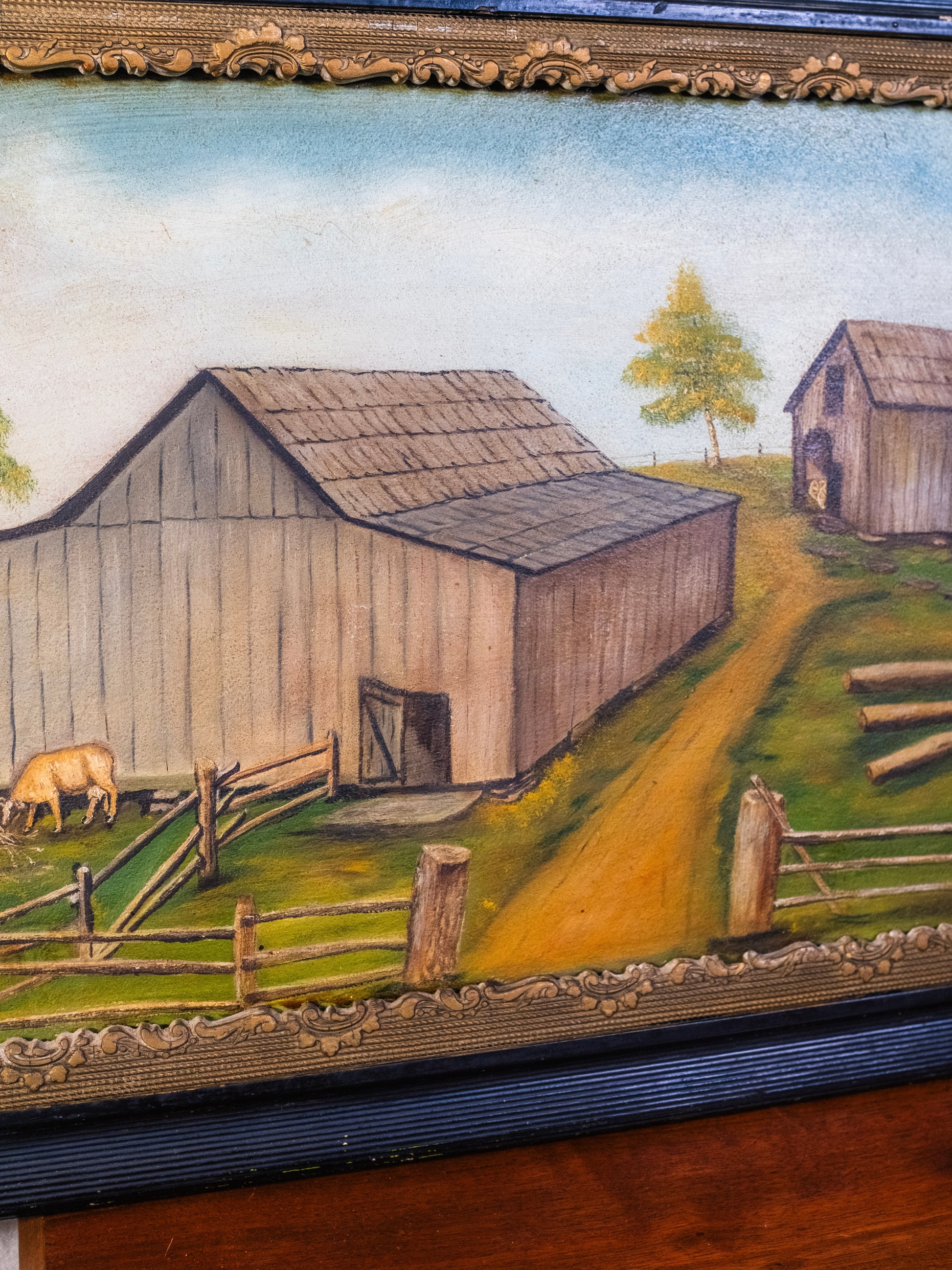 Vintage 1940s Framed Rustic Folk Art Farm Landscape Oil on Board Painting