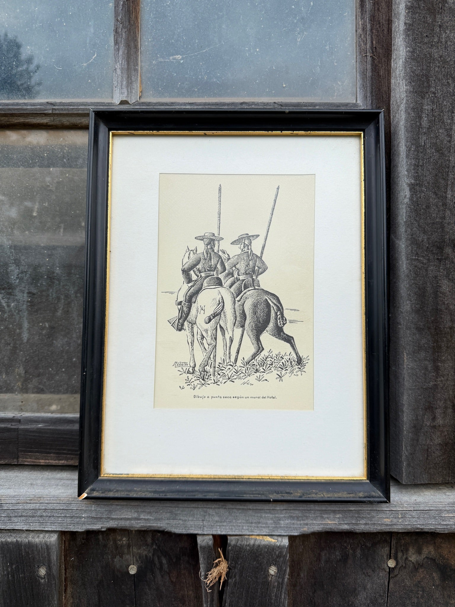 Vintage 1960s Framed “Men on Horses” Muñoz Cebrian Mexican Print Artwork.