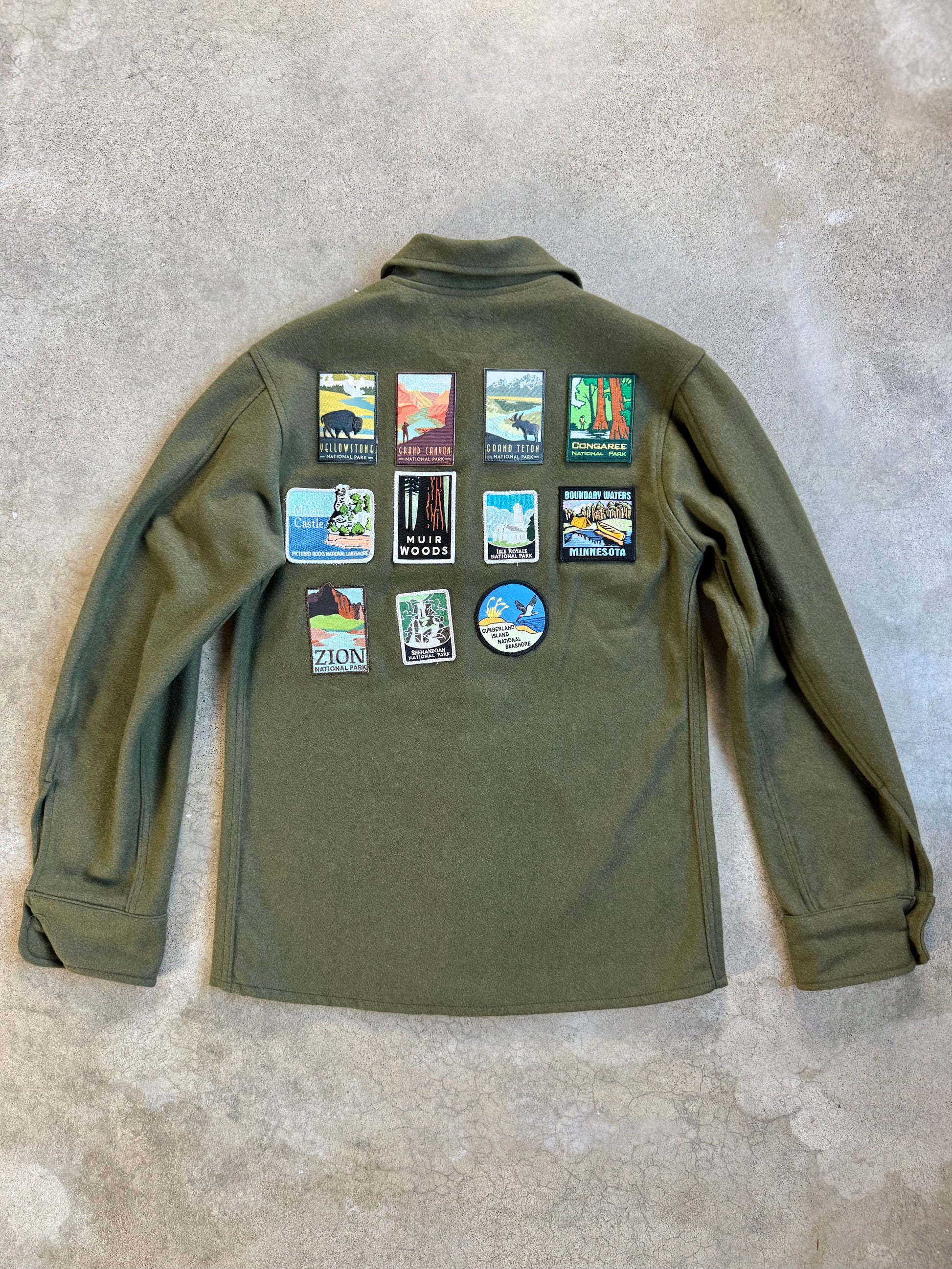 Vintage 1980s Military Issue Green Felted Wool Shirt Jacket w/ National Park Patches (Front & Back).