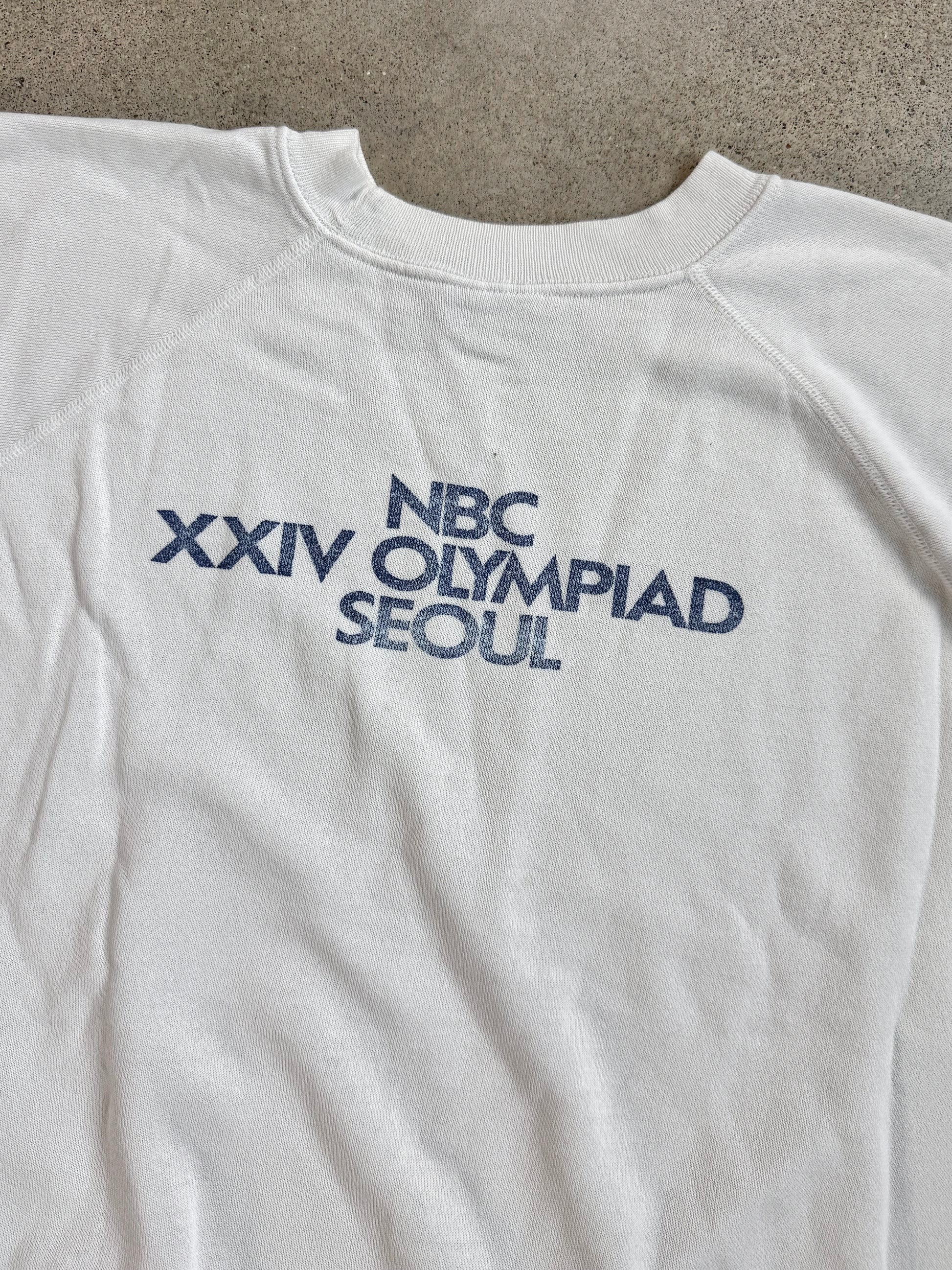 Vintage 1988 NBC Seoul Korea Olympics Two-Sided Graphic Raglan Sweatshirt.
