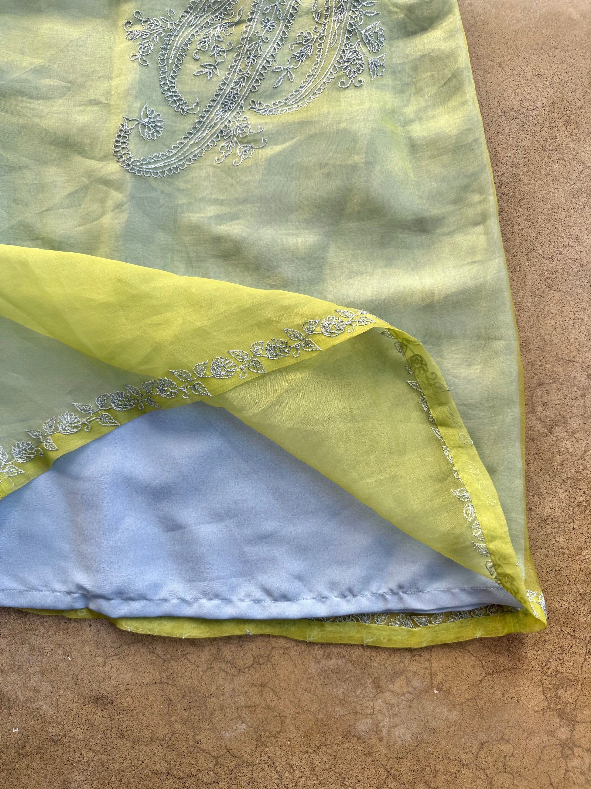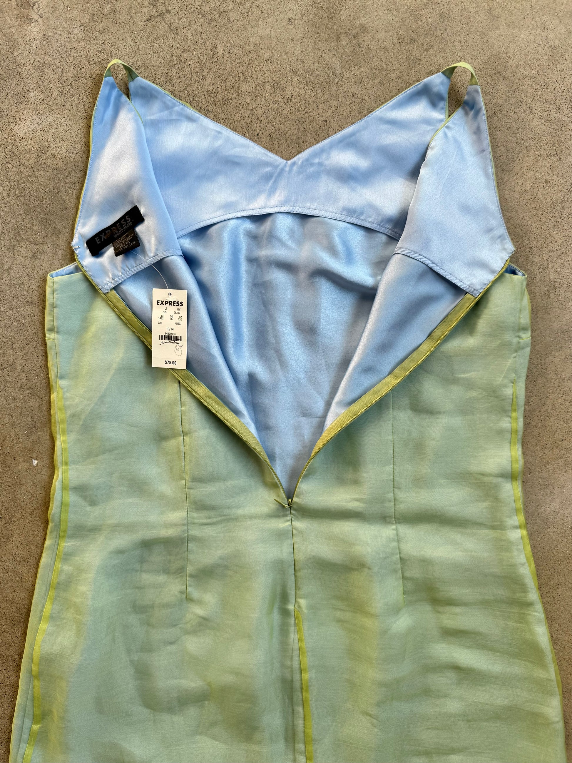 Vintage 1990s Express Green & Blue Paisley Embroidered Silk Mini Dress. 100% silk chiffon green overlay w/ blue slip lining. Features a zipper closure at back. Original tags attached.