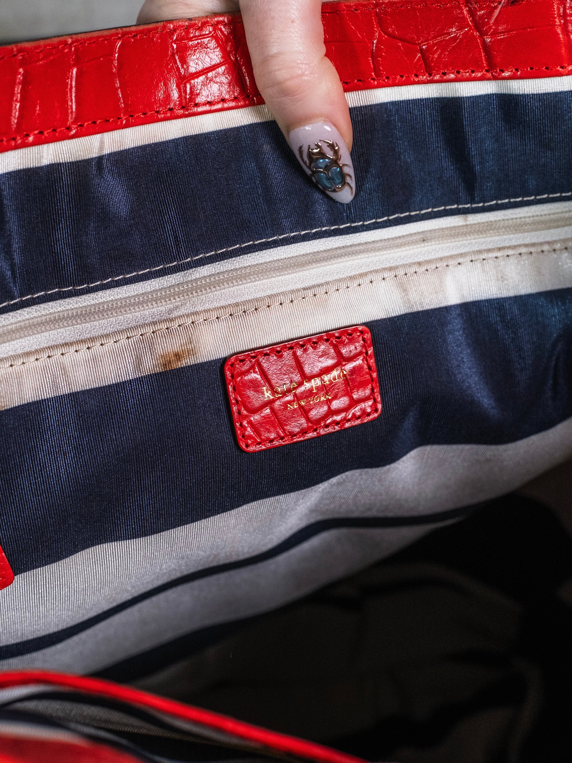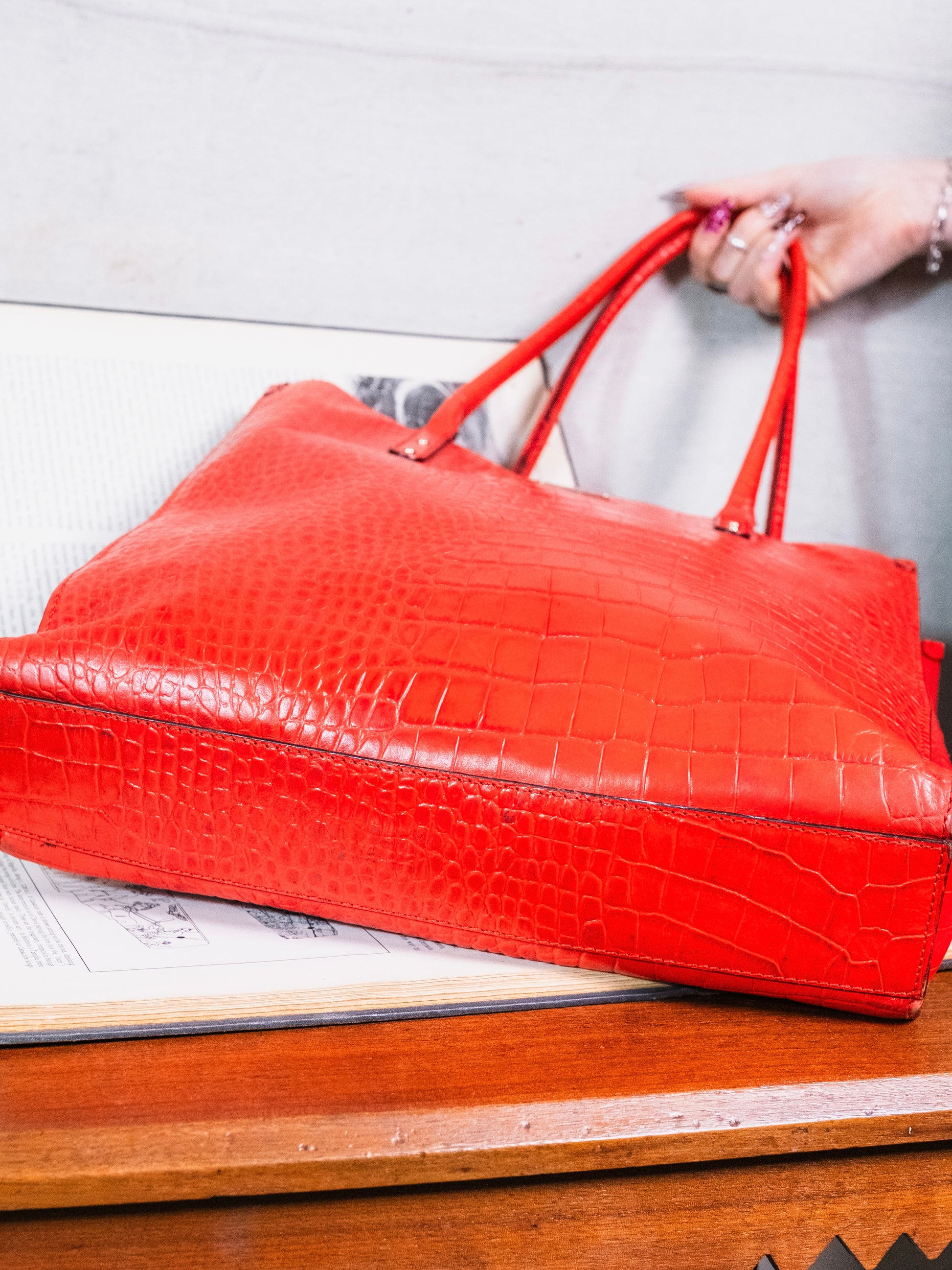 2000s Kate Spade Red Croc-Embossed Leather Tote-Style Top Handle Bag.