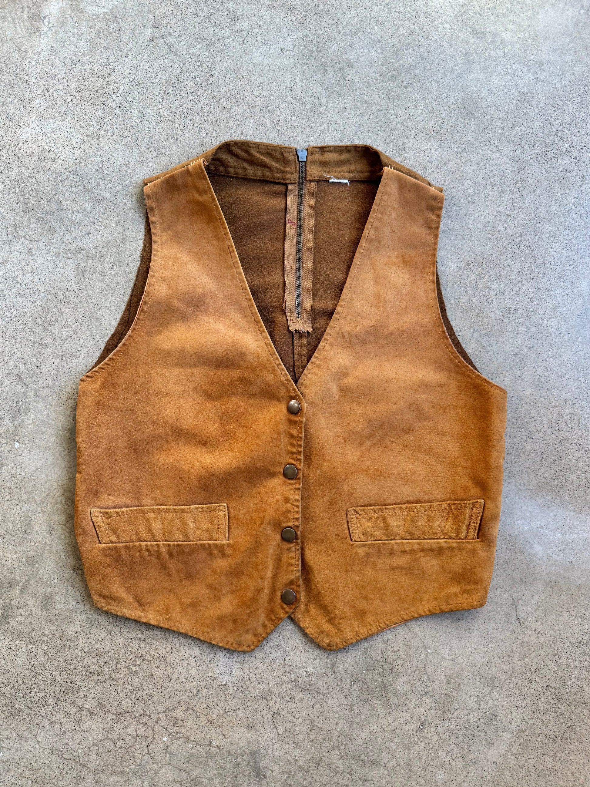 Vintage Handmade Tan Suede Leather Vest. Features front snap buttons & a zipper at back.