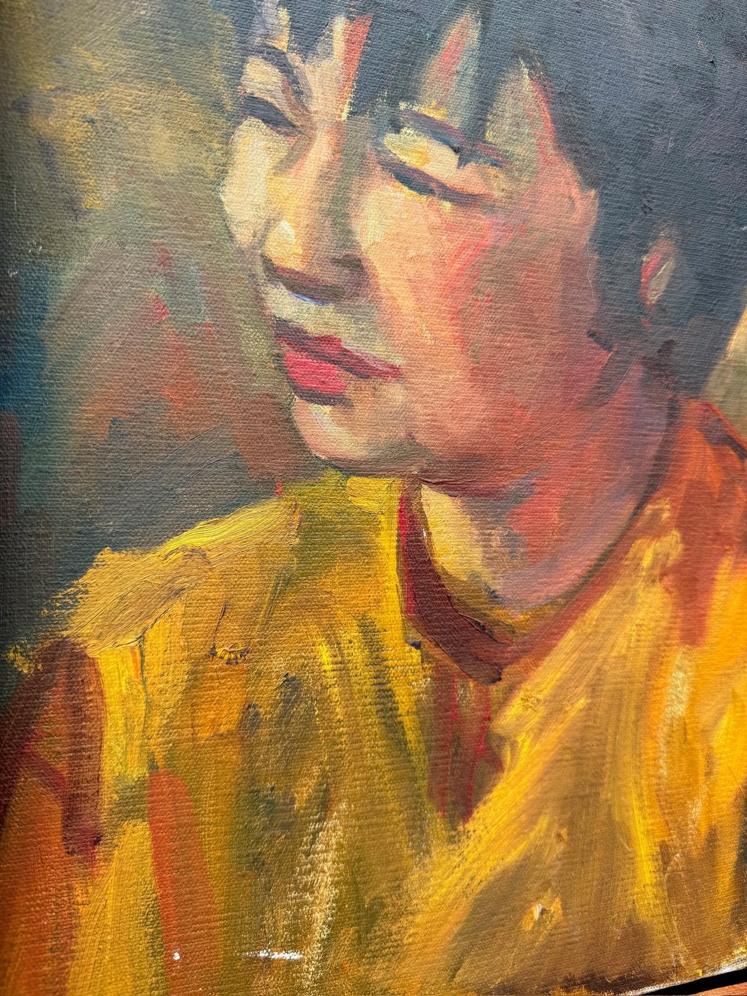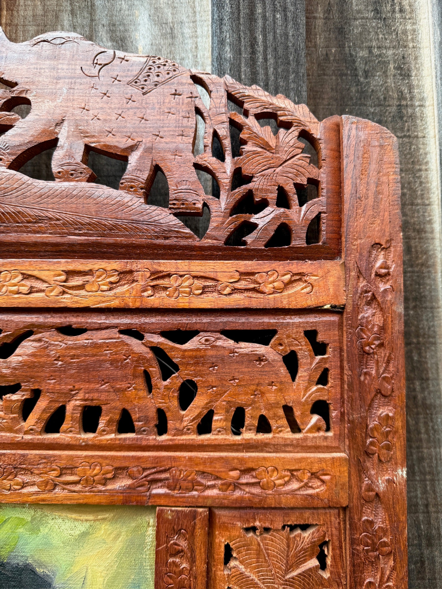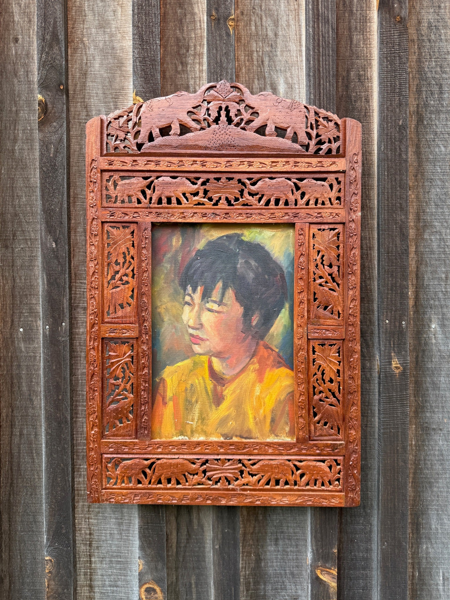 Vintage 1940s Carved Teakwood Elephant Frame “Village Girl” Oil Painting on Canvas.