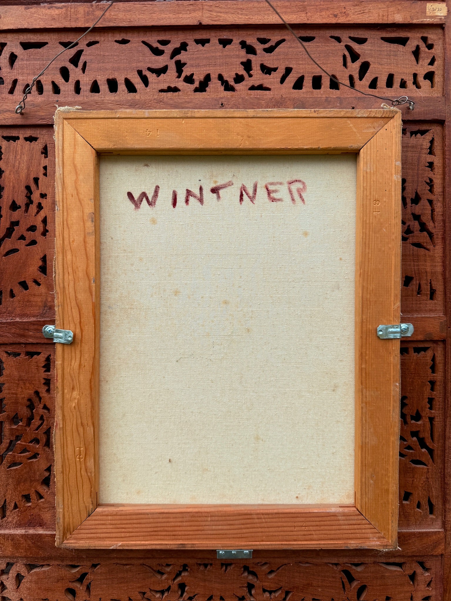Vintage 1940s Carved Teakwood Elephant Frame "Village Girl" Oil on Canvas Painting