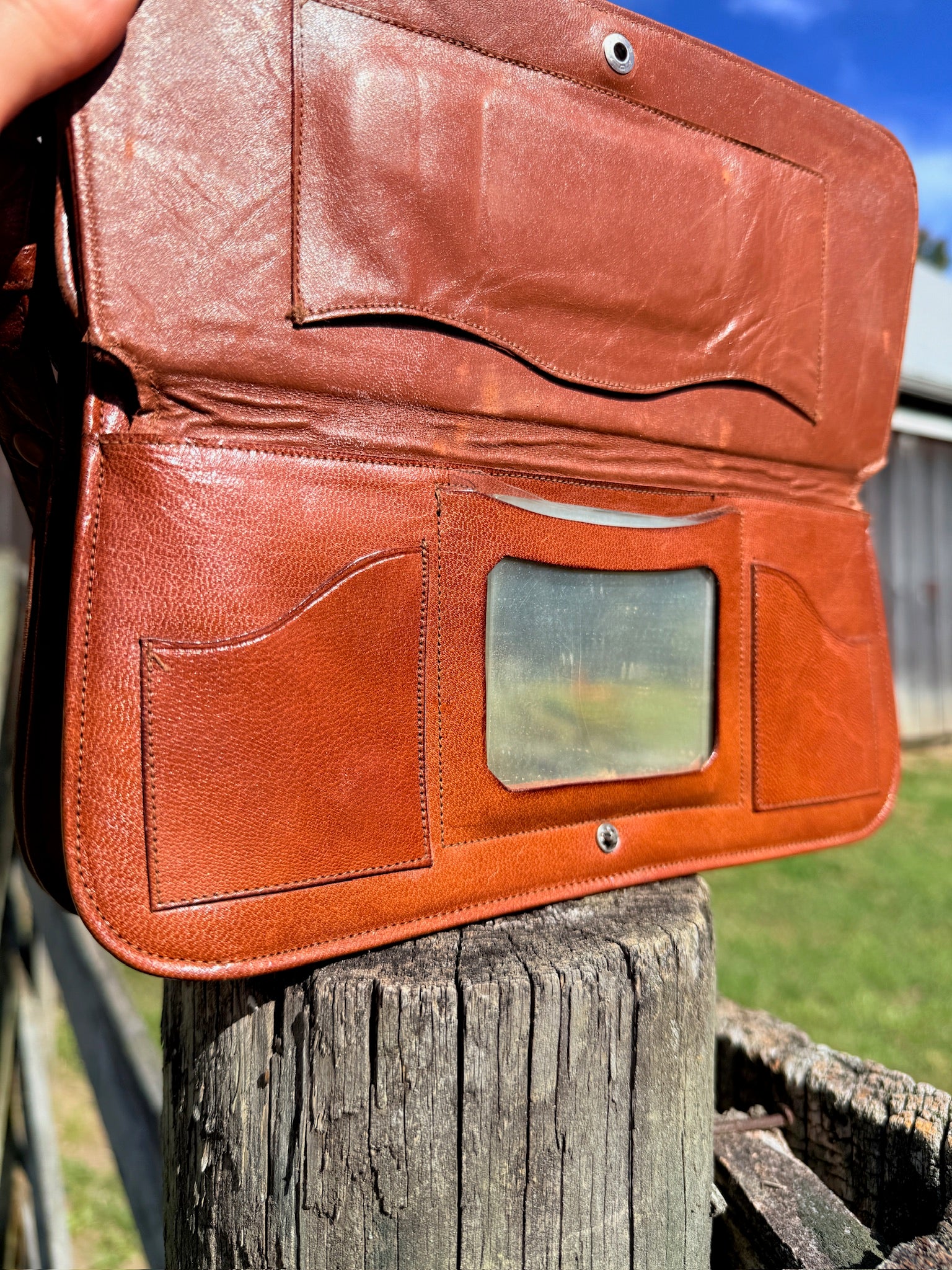 Vintage 1940s Brown Hand-Tooled Floral Leather Handbag / Shoulder Bag. Features a turnlock closure with accordion-style inner compartment. Outside of bag also has a smaller wallet-like compartment on both sides with flap-over snap button closure.