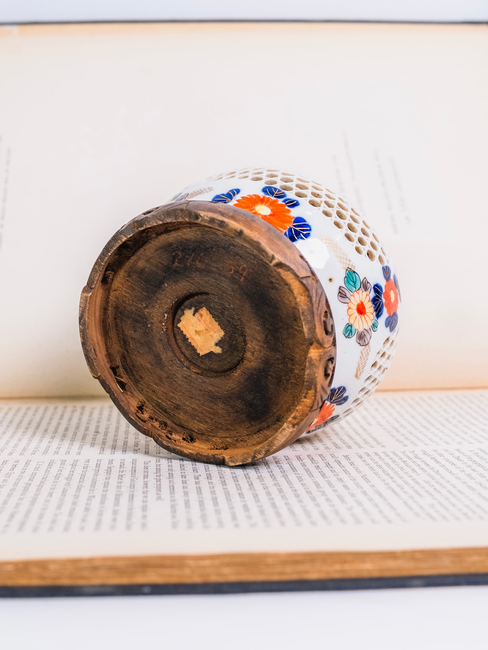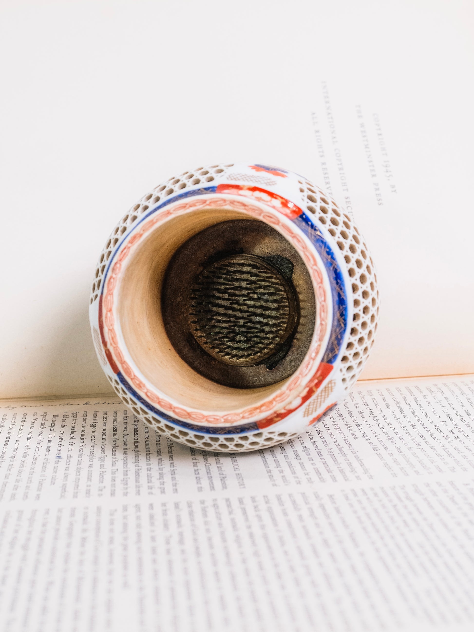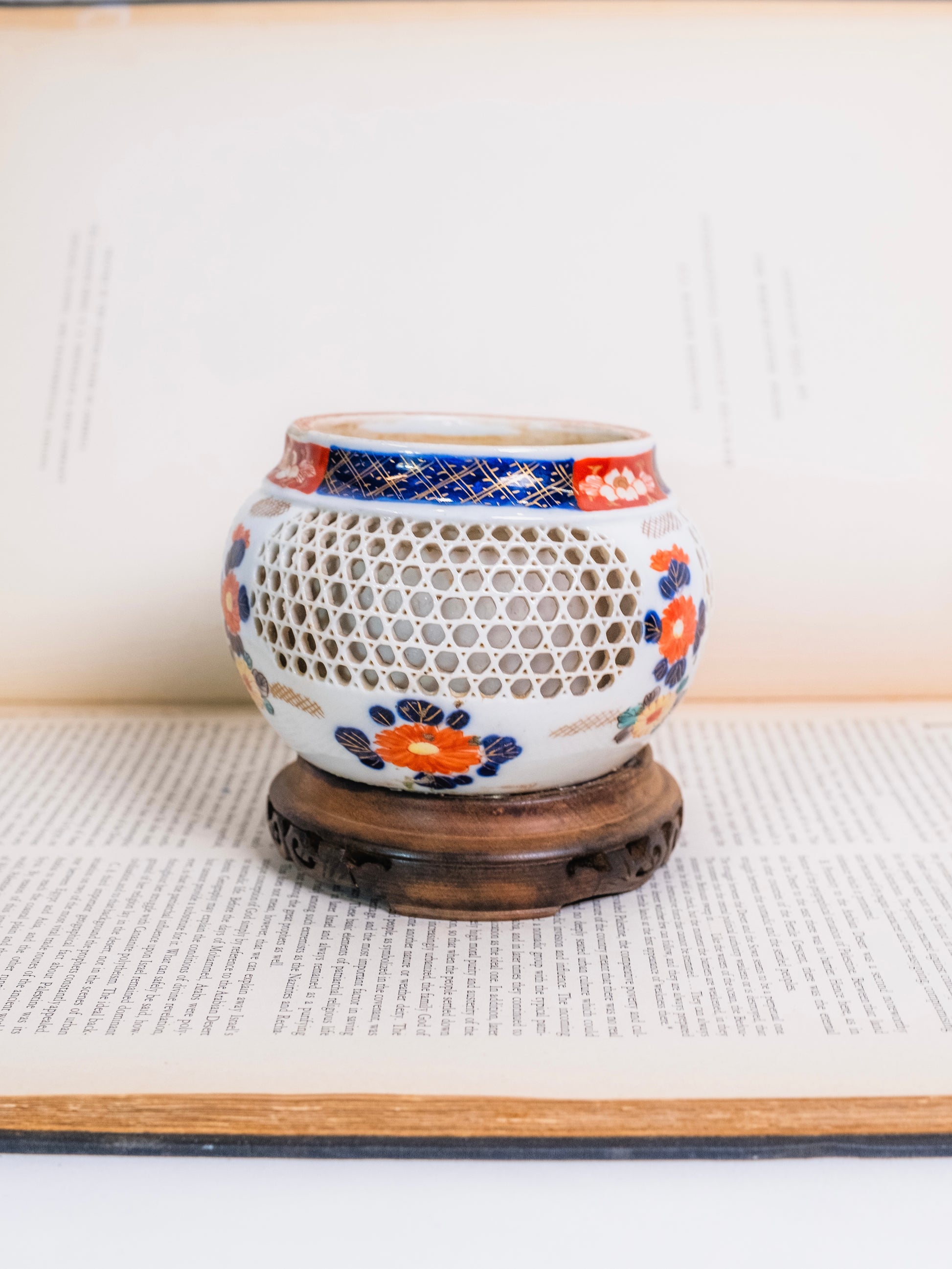 Vintage 1940s/50s Double Wall Porcelain Japanese Imari Reticulated Flower Frog Vase.