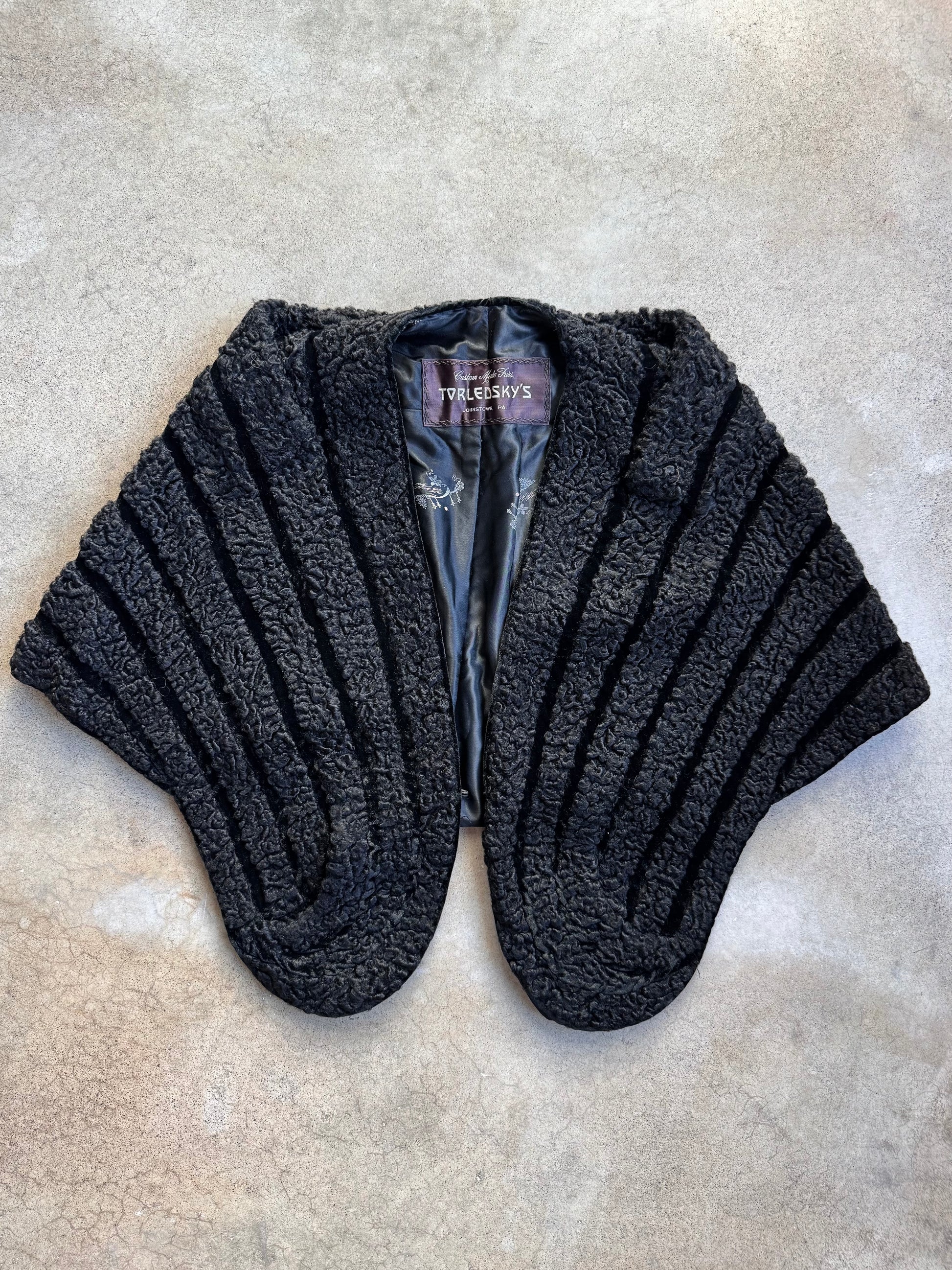 Vintage 1940s Torledsky’s Black Persian Curly Lambswool Stole