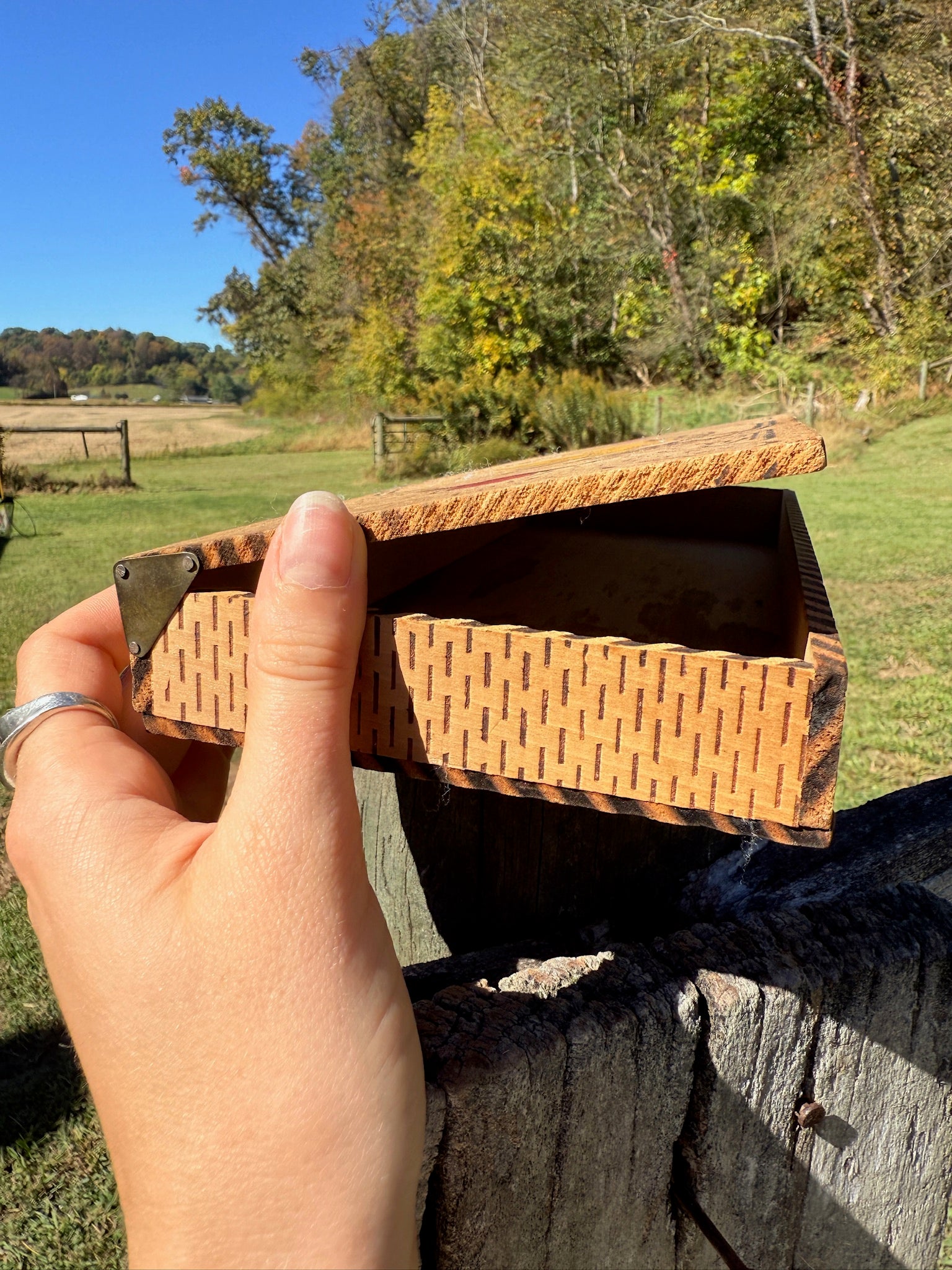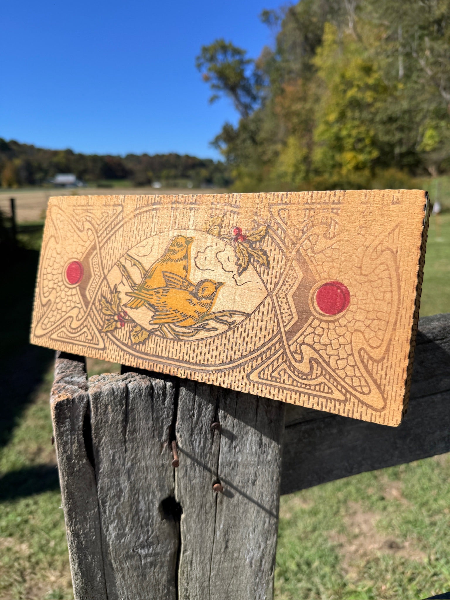 Vintage 1940s Wooden Bird Pattern Pyrography Box.
