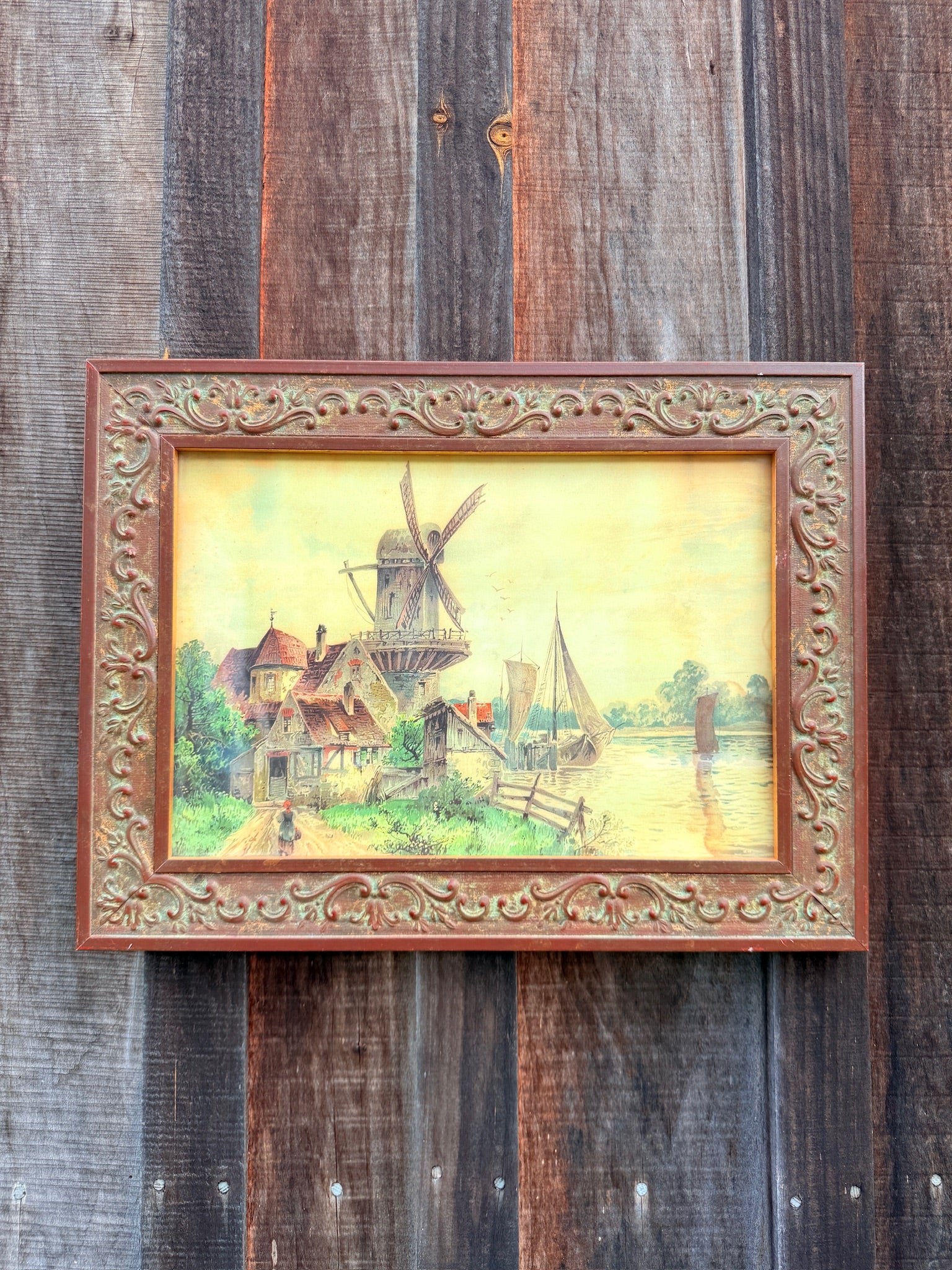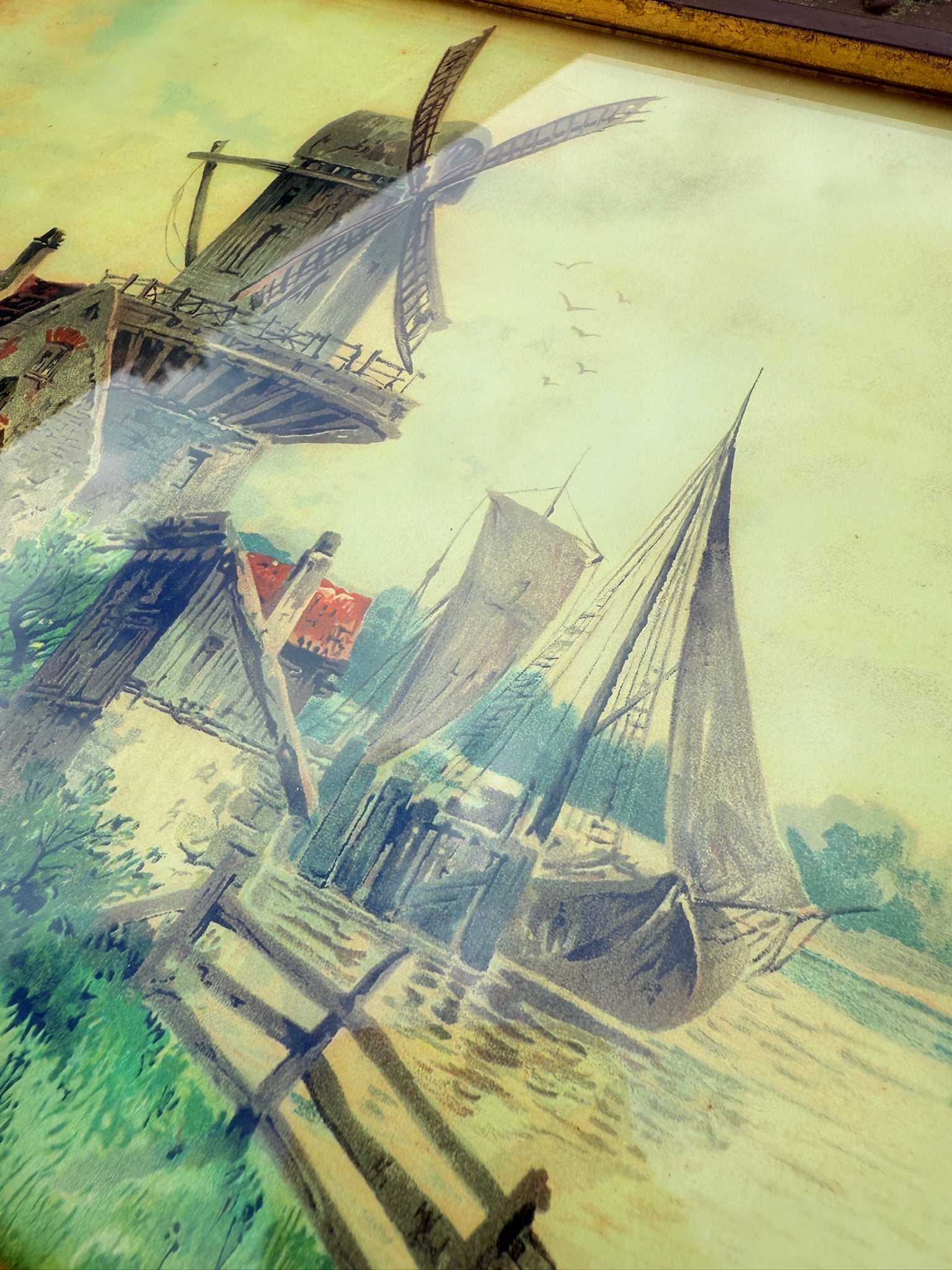Vintage 1950s Framed Dutch Windmill Landscape Print Art.