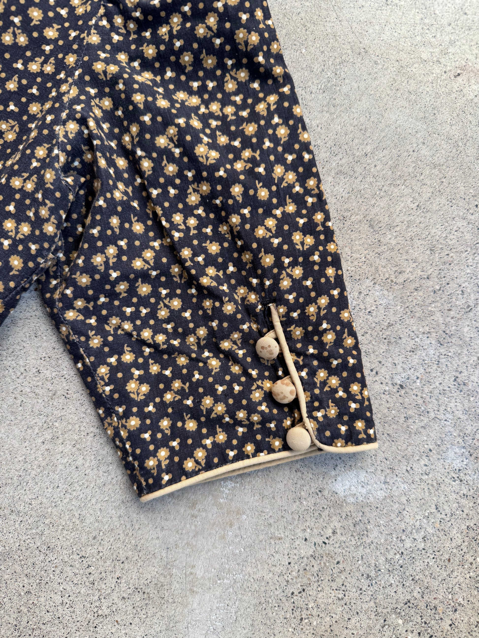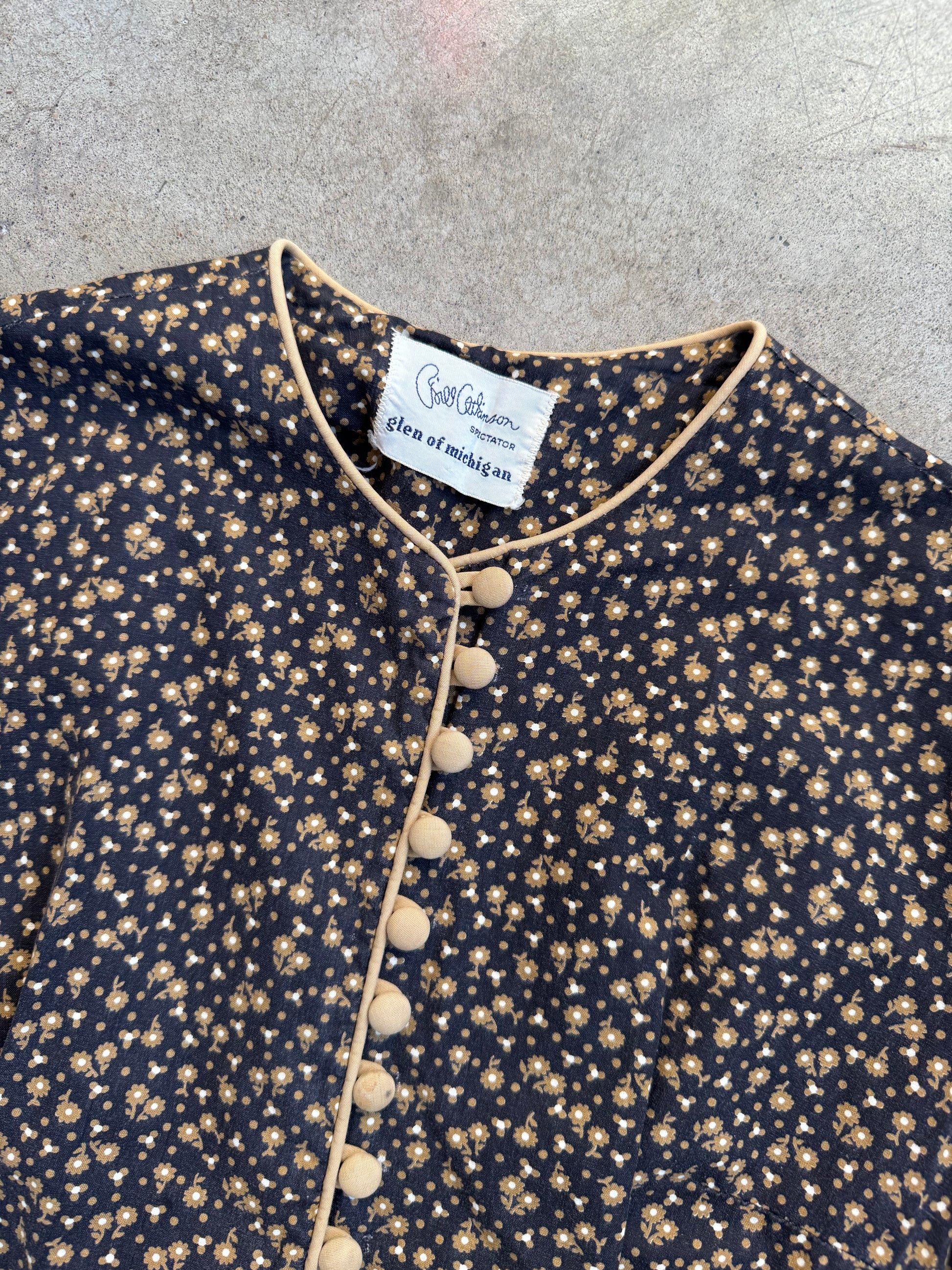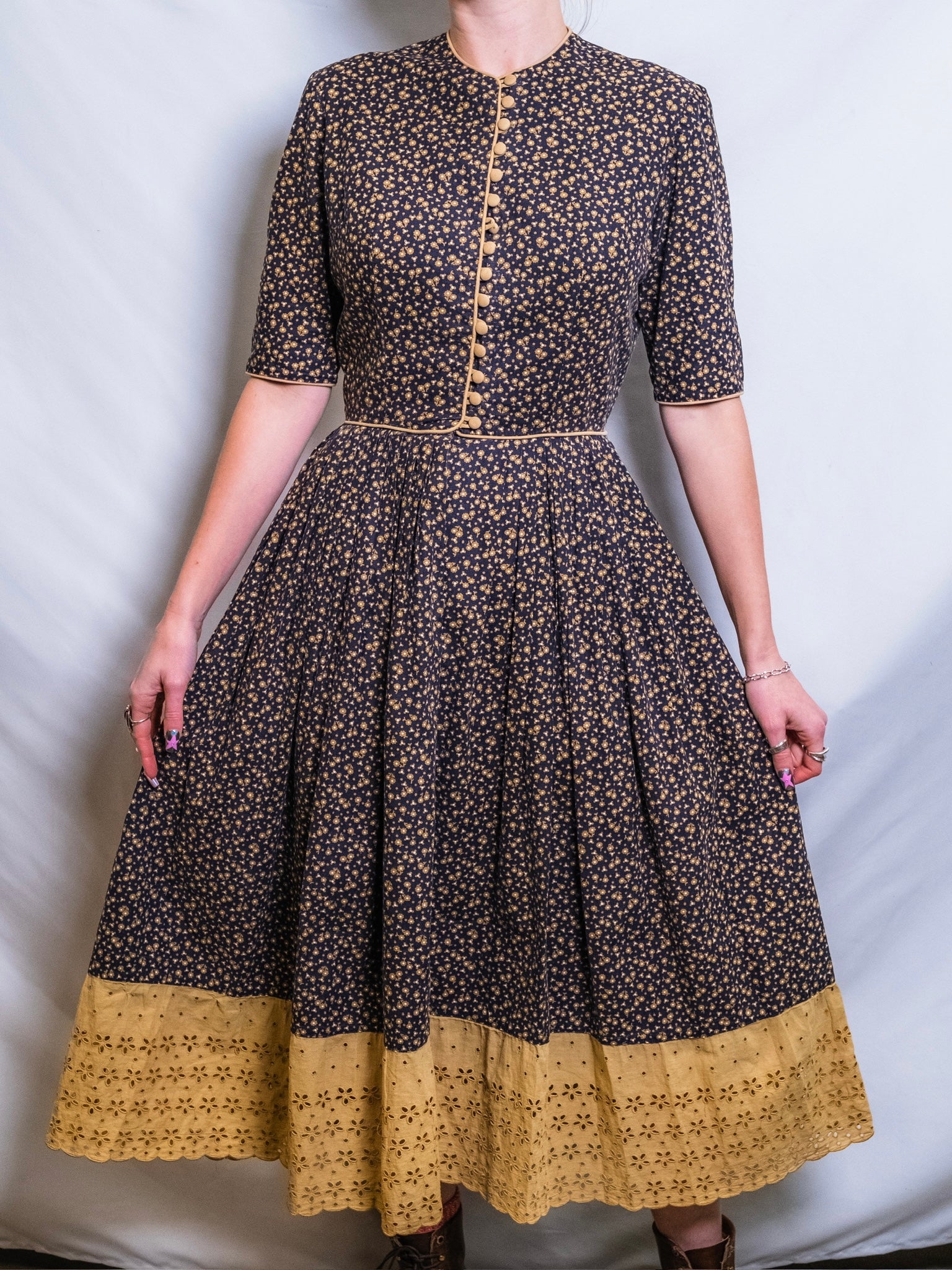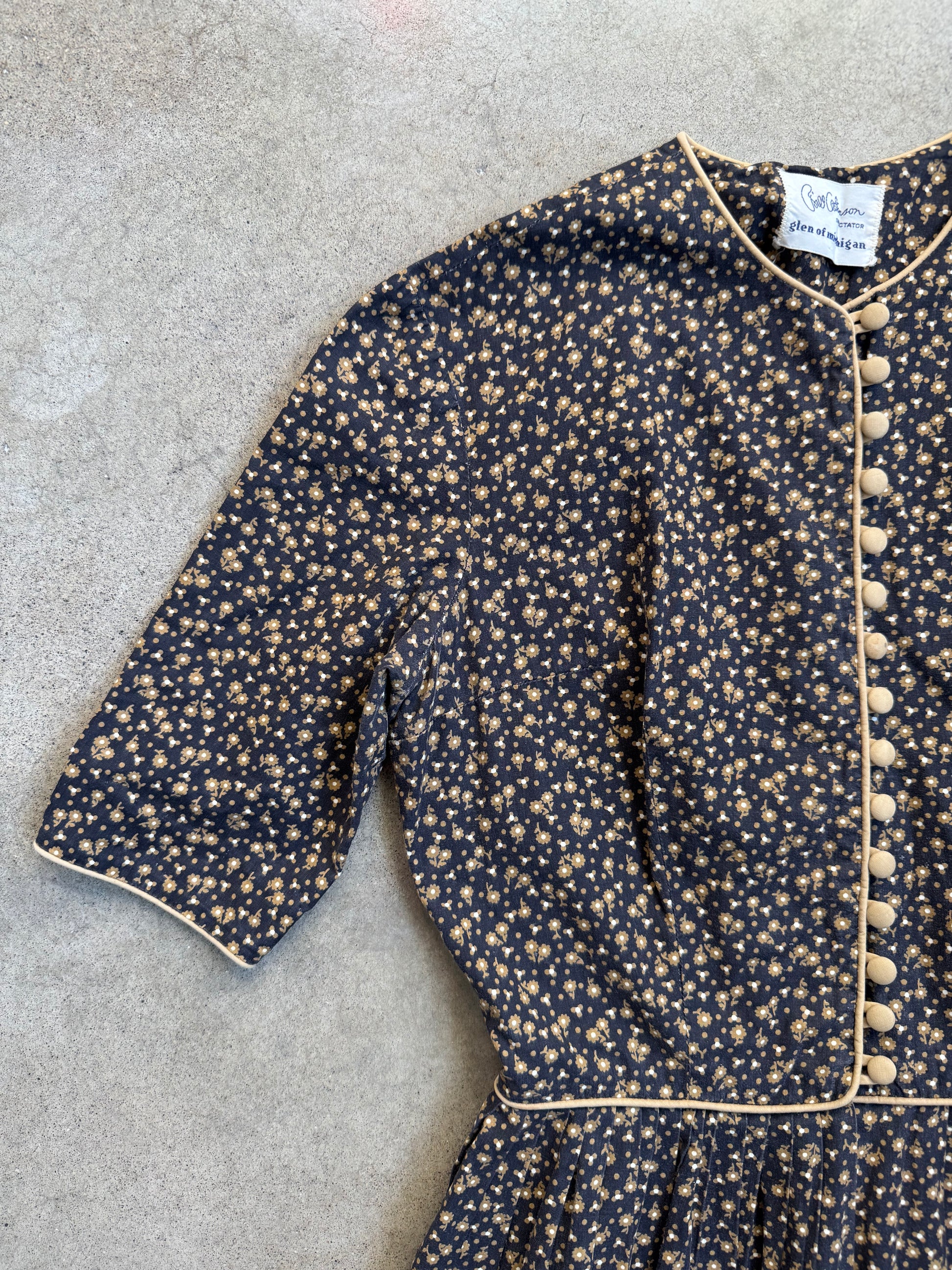 Vintage 1950s Bill Atkinson Glen of Michigan Black & Gold/Tan Floral Pattern Short Sleeve Button-Front Pleated Dress w/ Eyelet Trim.