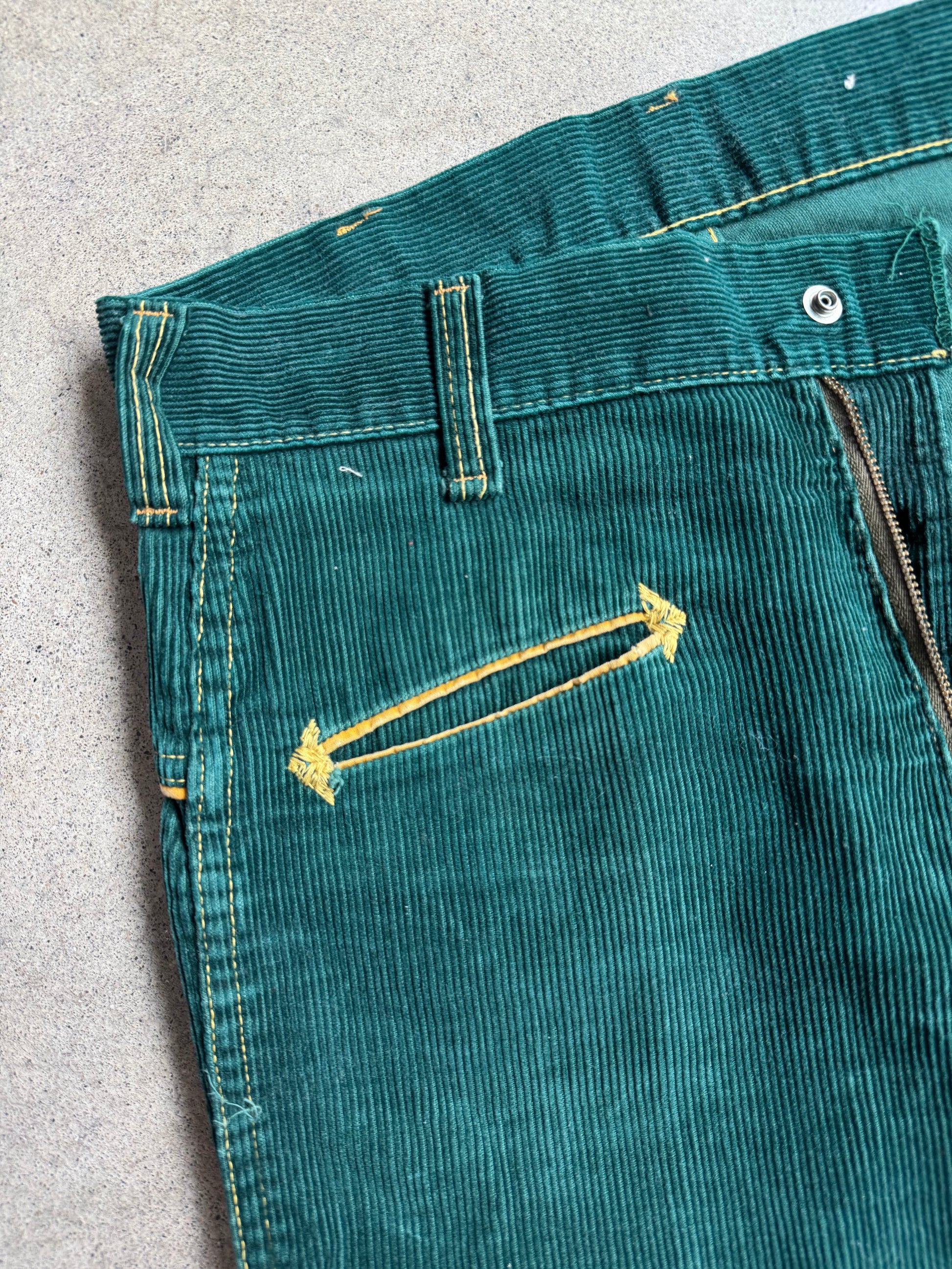 Vintage 1960s Western-Style Green Corduroy Flared Pants. Features a zipper fly & snap button closure.