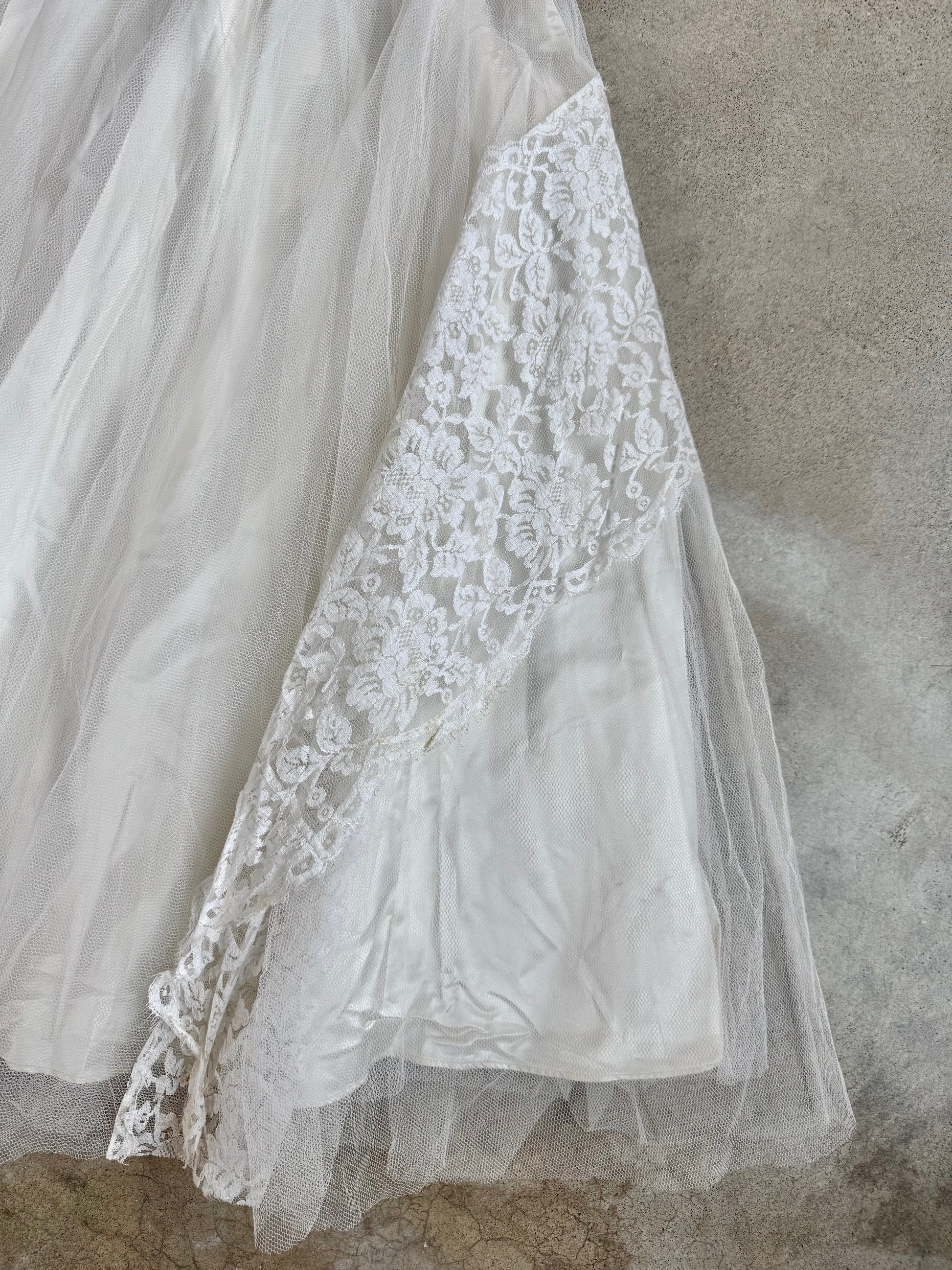 Vintage 1950s Handmade White Lace Tea-Length Tulle Skirt Strapless Wedding Gown. Features a boned bodice with zipper closure at side. Satin slip/lining, double layered tulle & lace overlay.