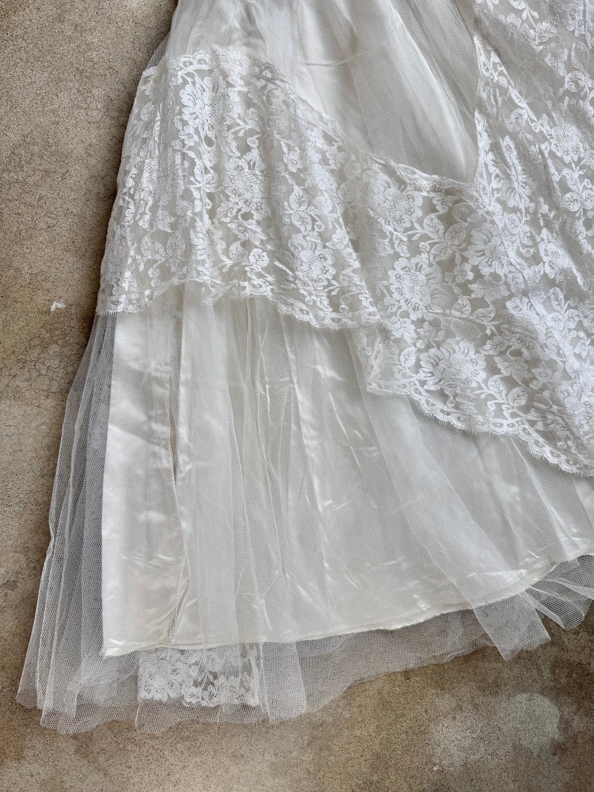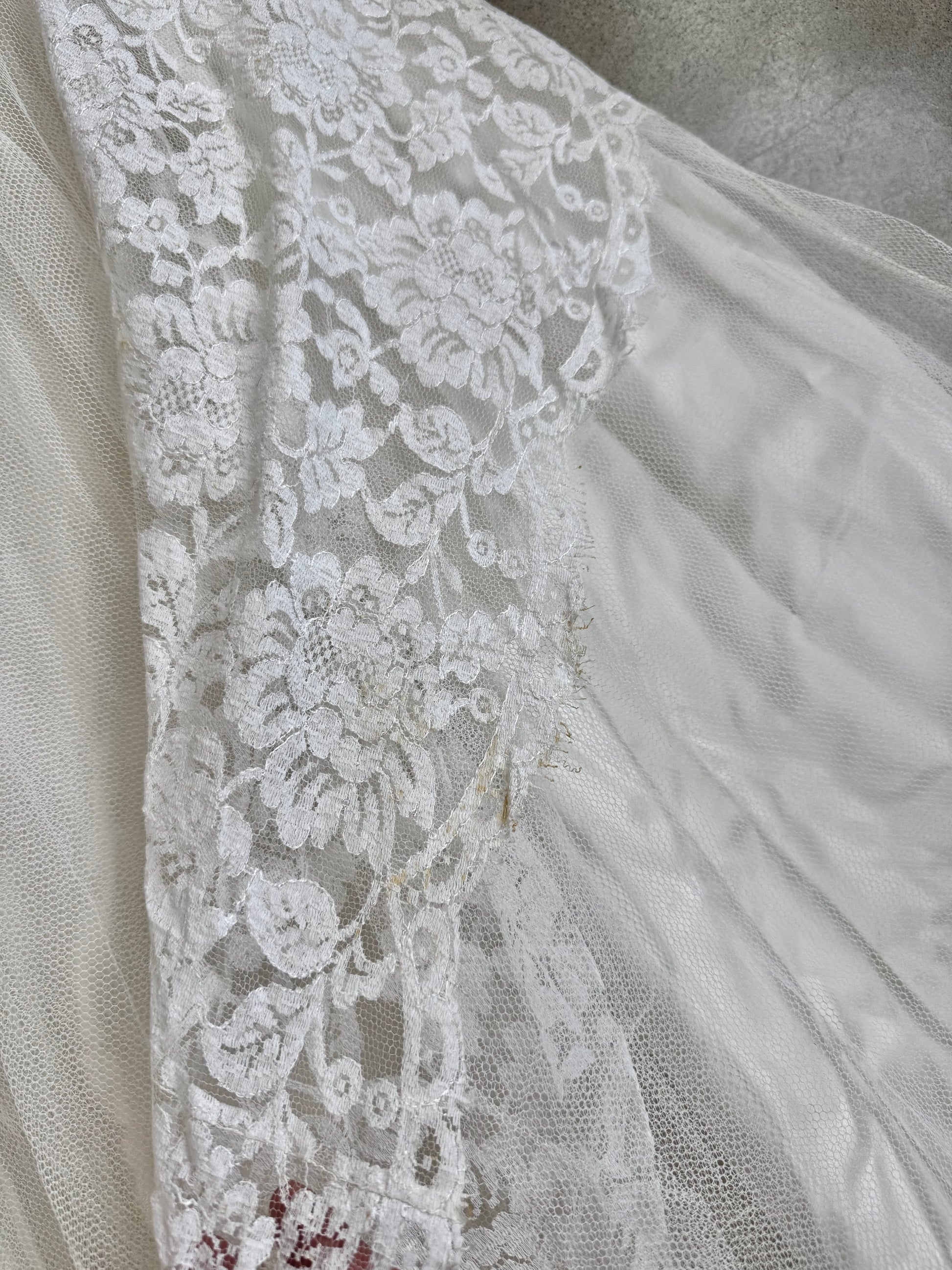 Vintage 1950s Handmade White Lace Tea-Length Tulle Skirt Wedding Gown | XS