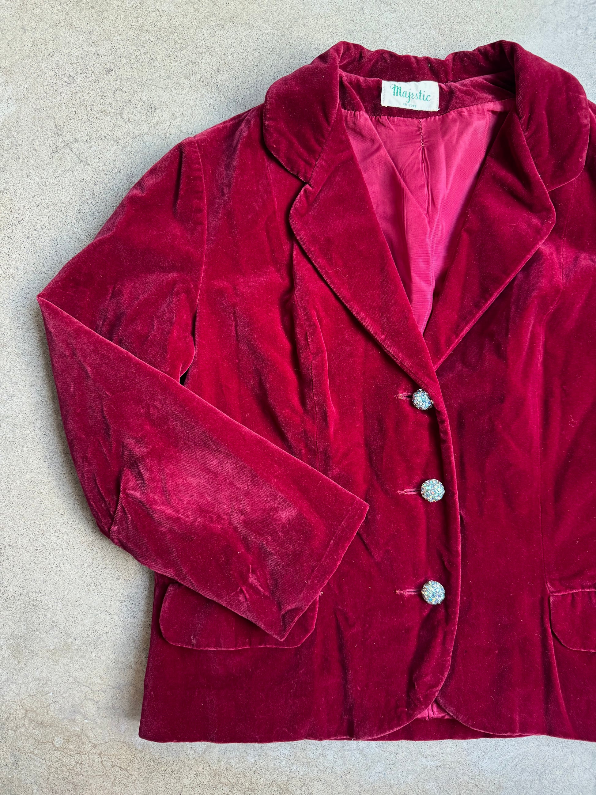 Vintage 1950s Majestic Burgundy Red Velvet Blazer Jacket w/ Rhinestone Button Detailing.