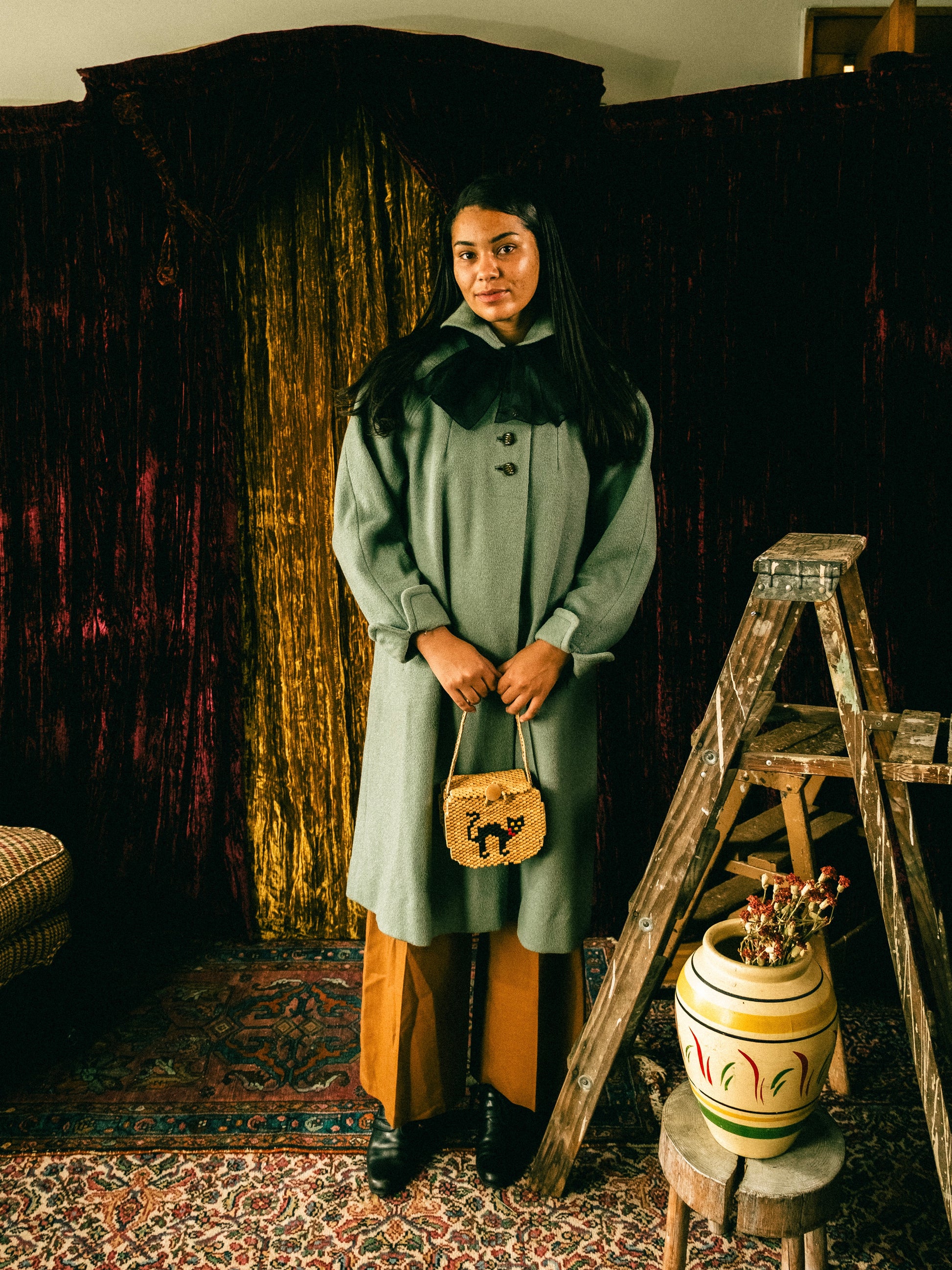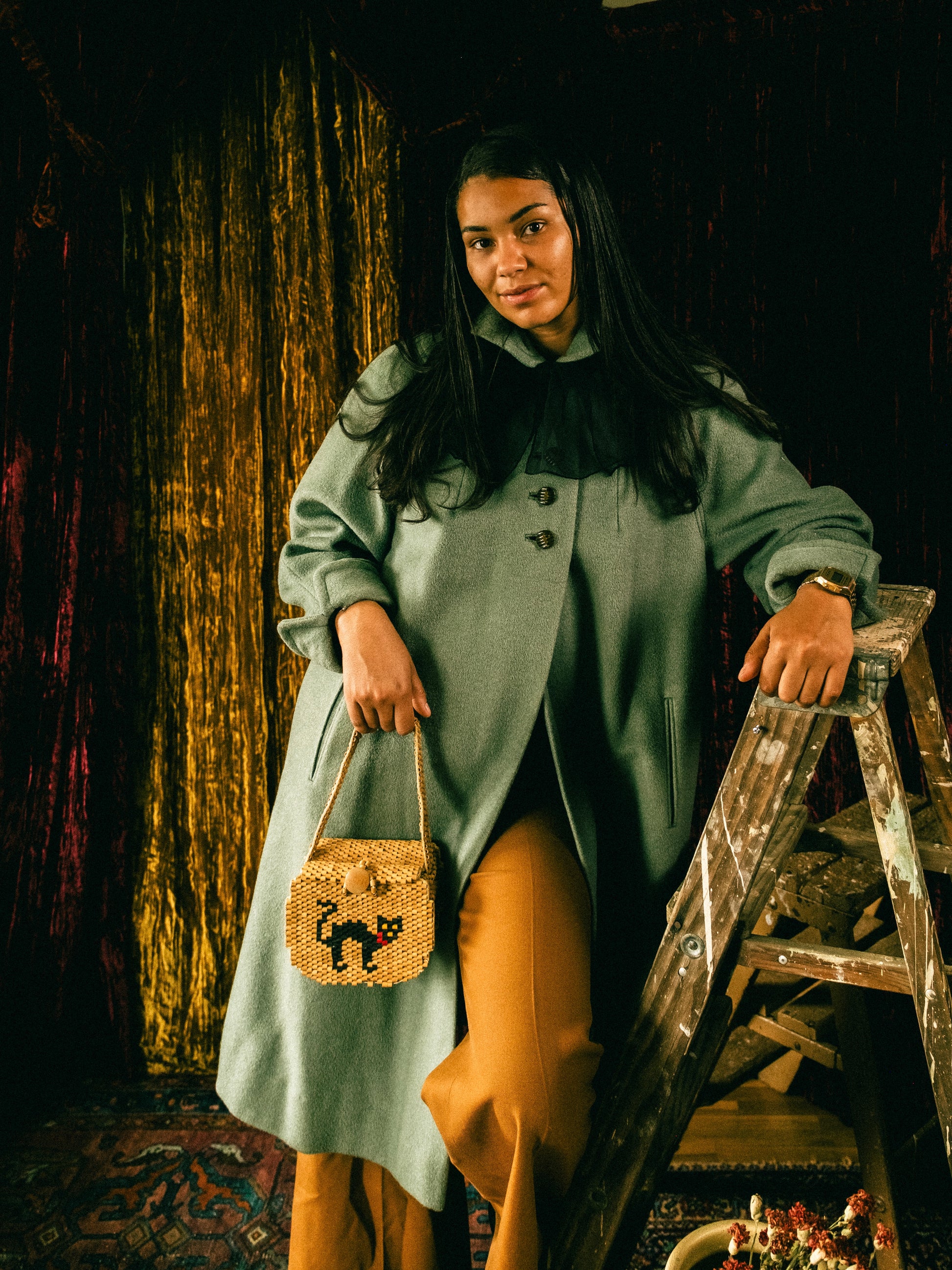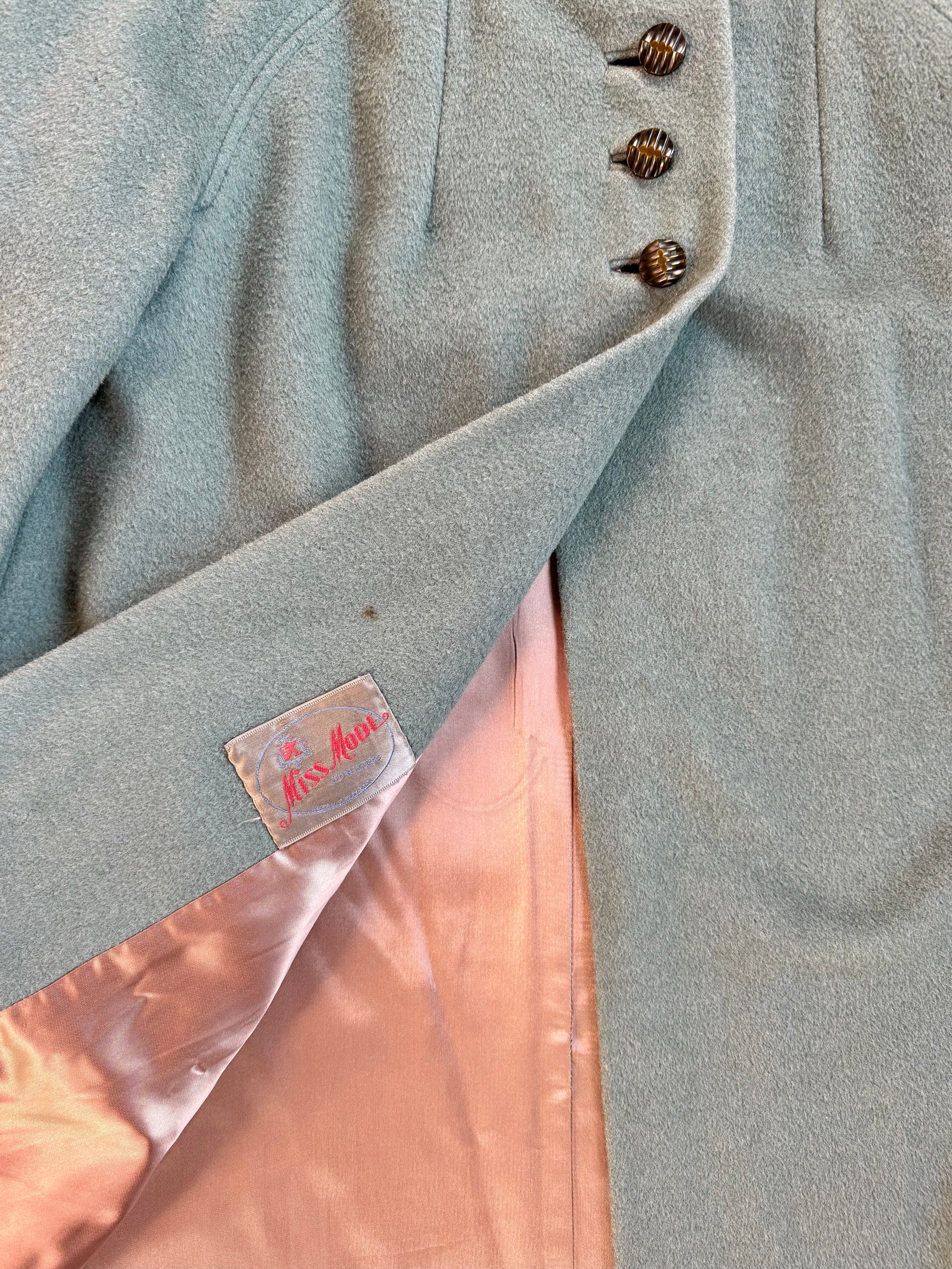 Vintage 1940s Miss Mode Juniors Mint Green Wool Swing Coat / Overcoat. Features a rounded collar & high-neck front buttons. Satin lined.