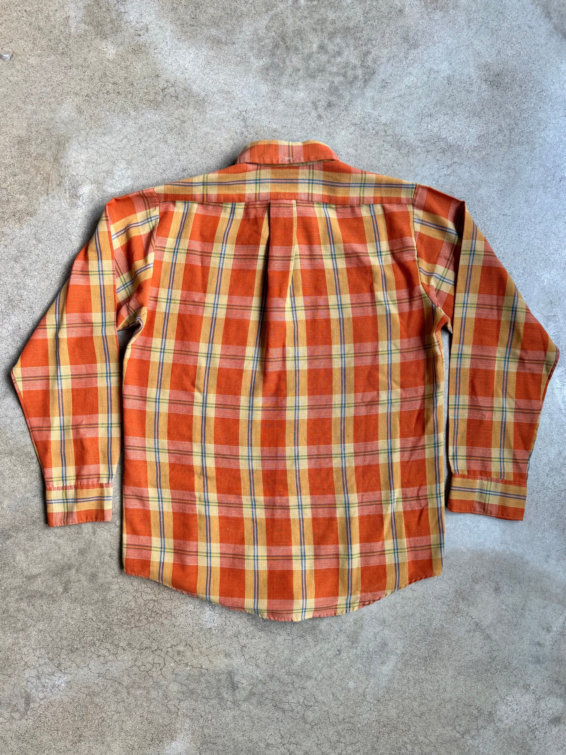 Vintage 1950s Sears “Premiere Collection” Perma-Prest Orange Plaid Button-Down Shirt. Lightweight cotton-poly fabric.