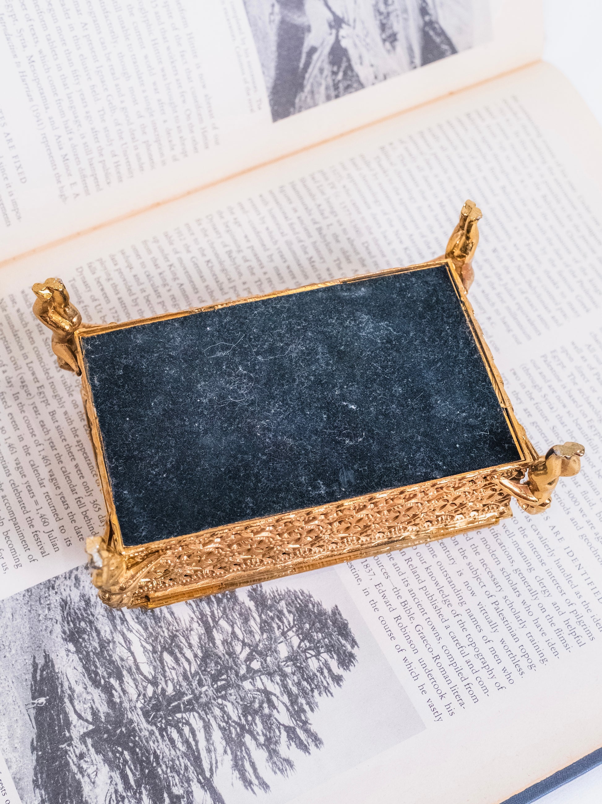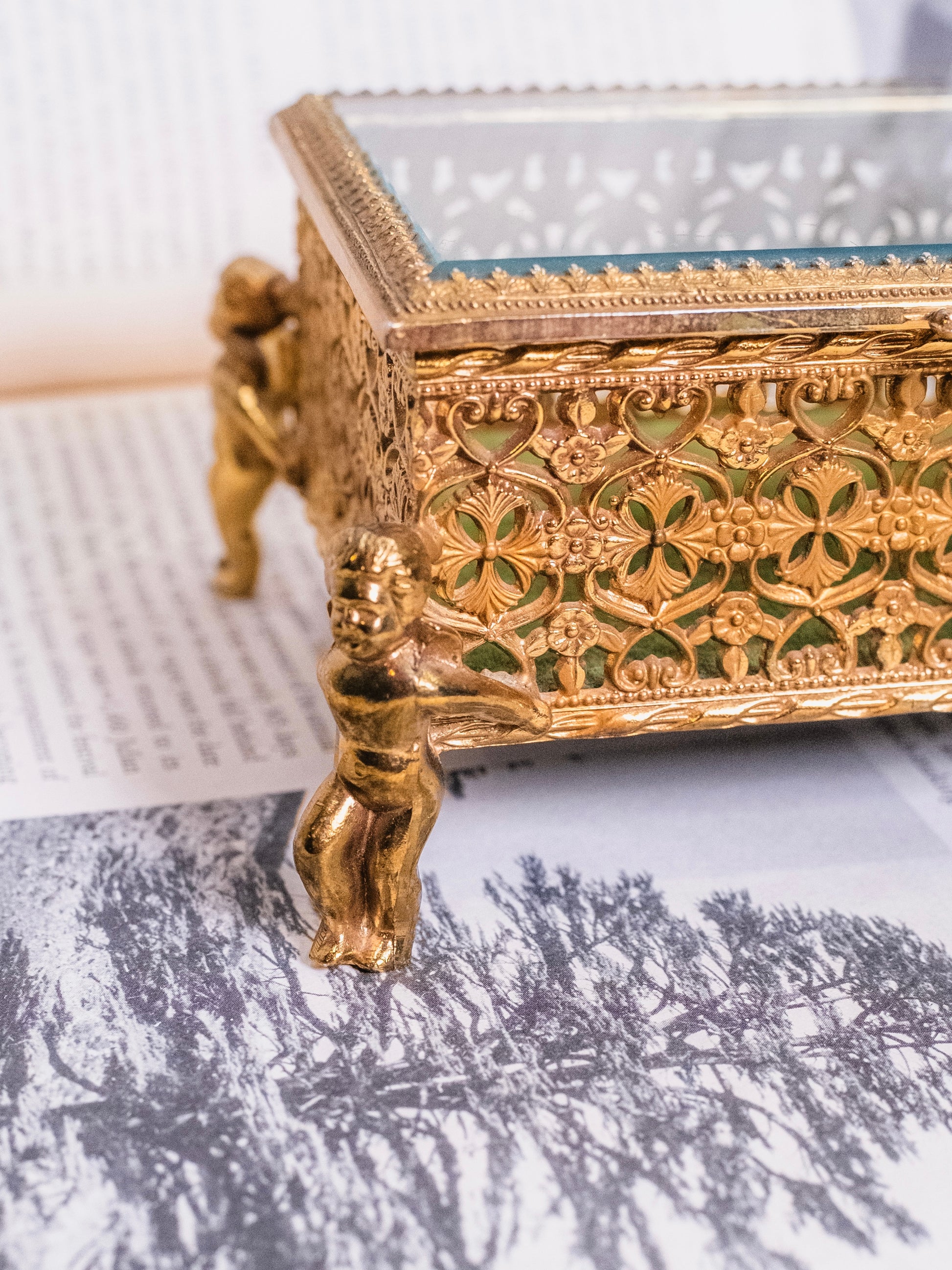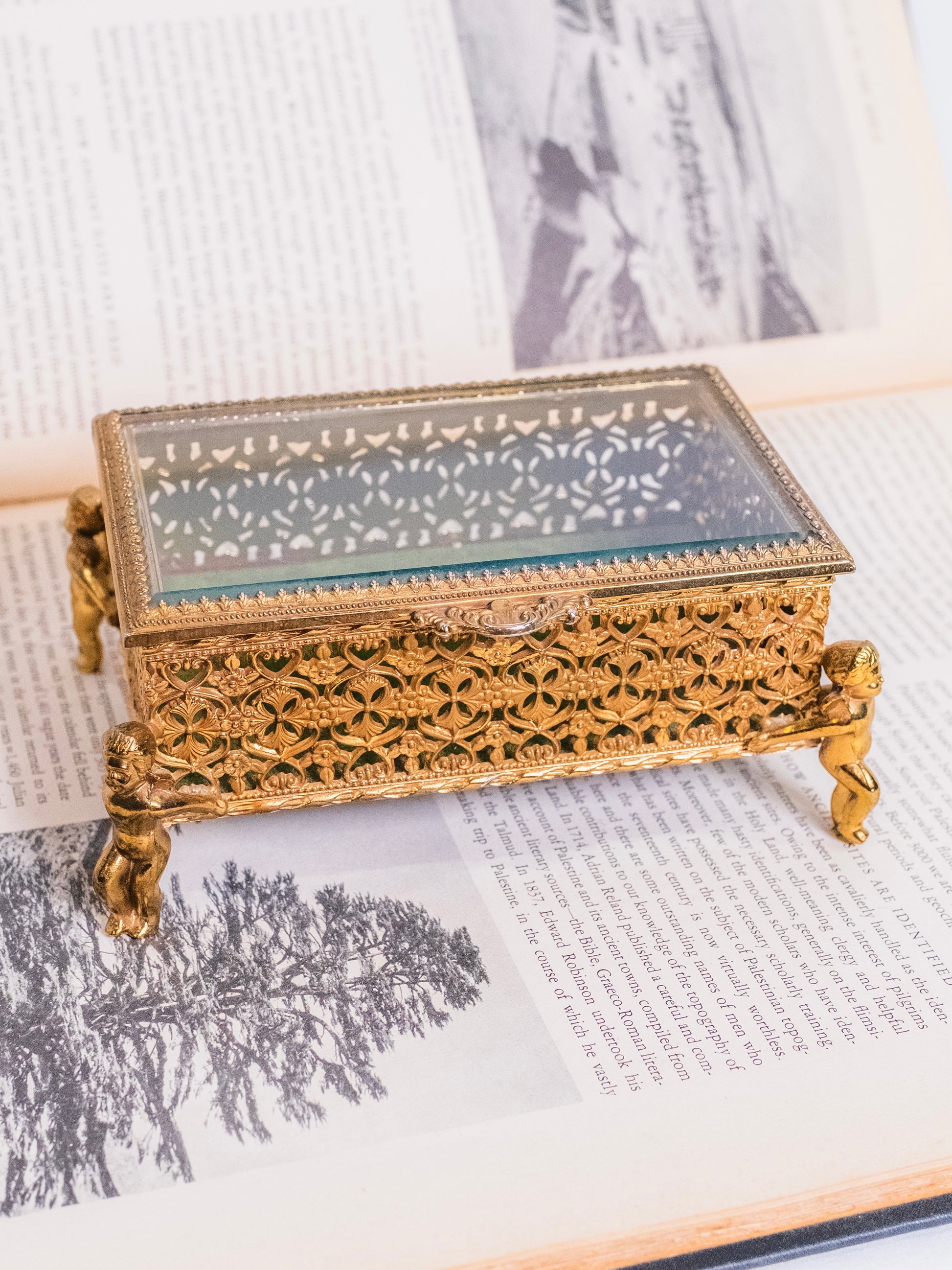Vintage 1950s Brass Ormolu Filigree Cupid Footed Jewelry Box