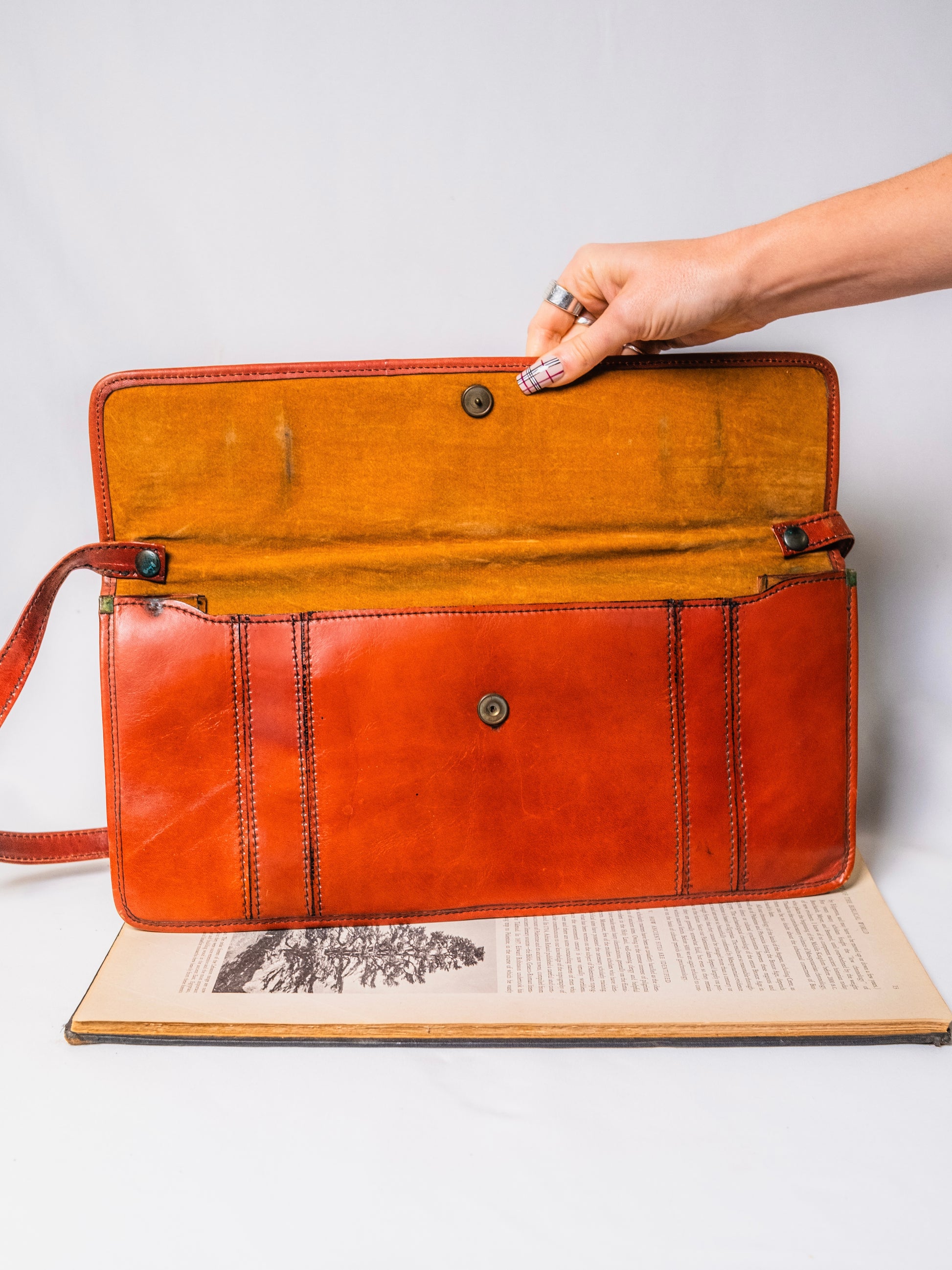 Vintage 1960s Brown/Burnt Red Leather Skinny Messenger-Style Shoulder Bag. Features a flap-over snap button closure with gold buckle hardware detailing & tan velvet inside lining.