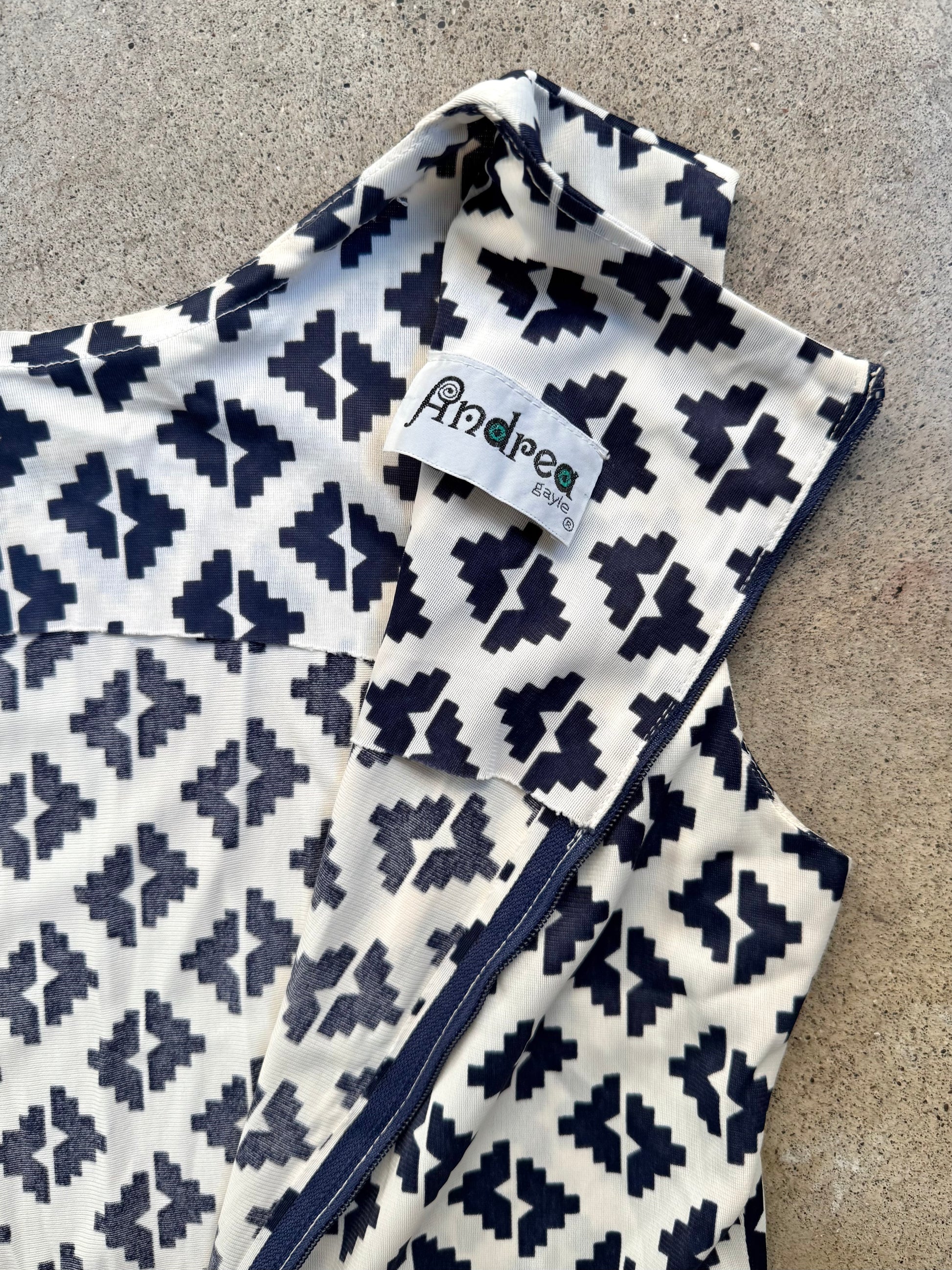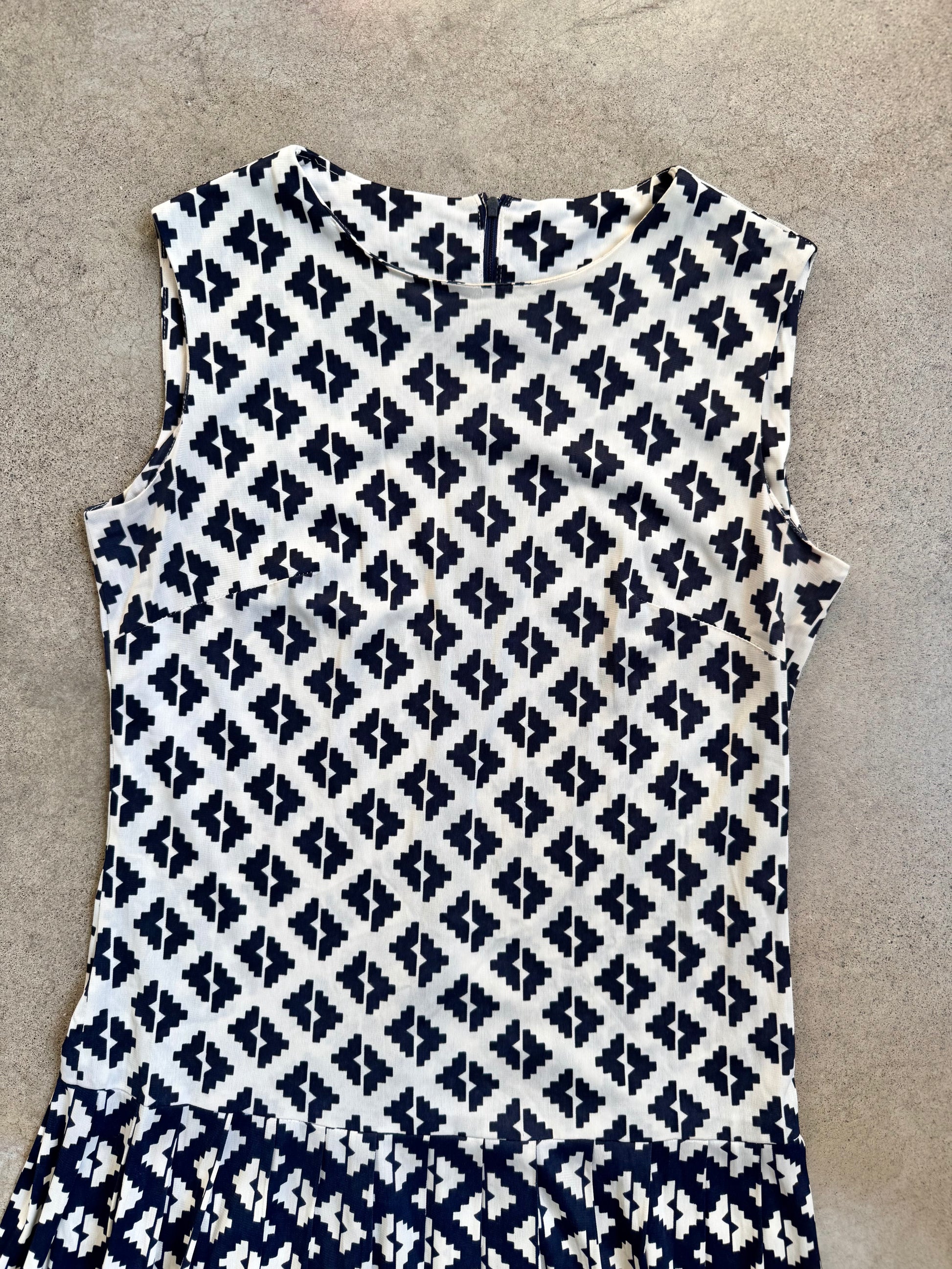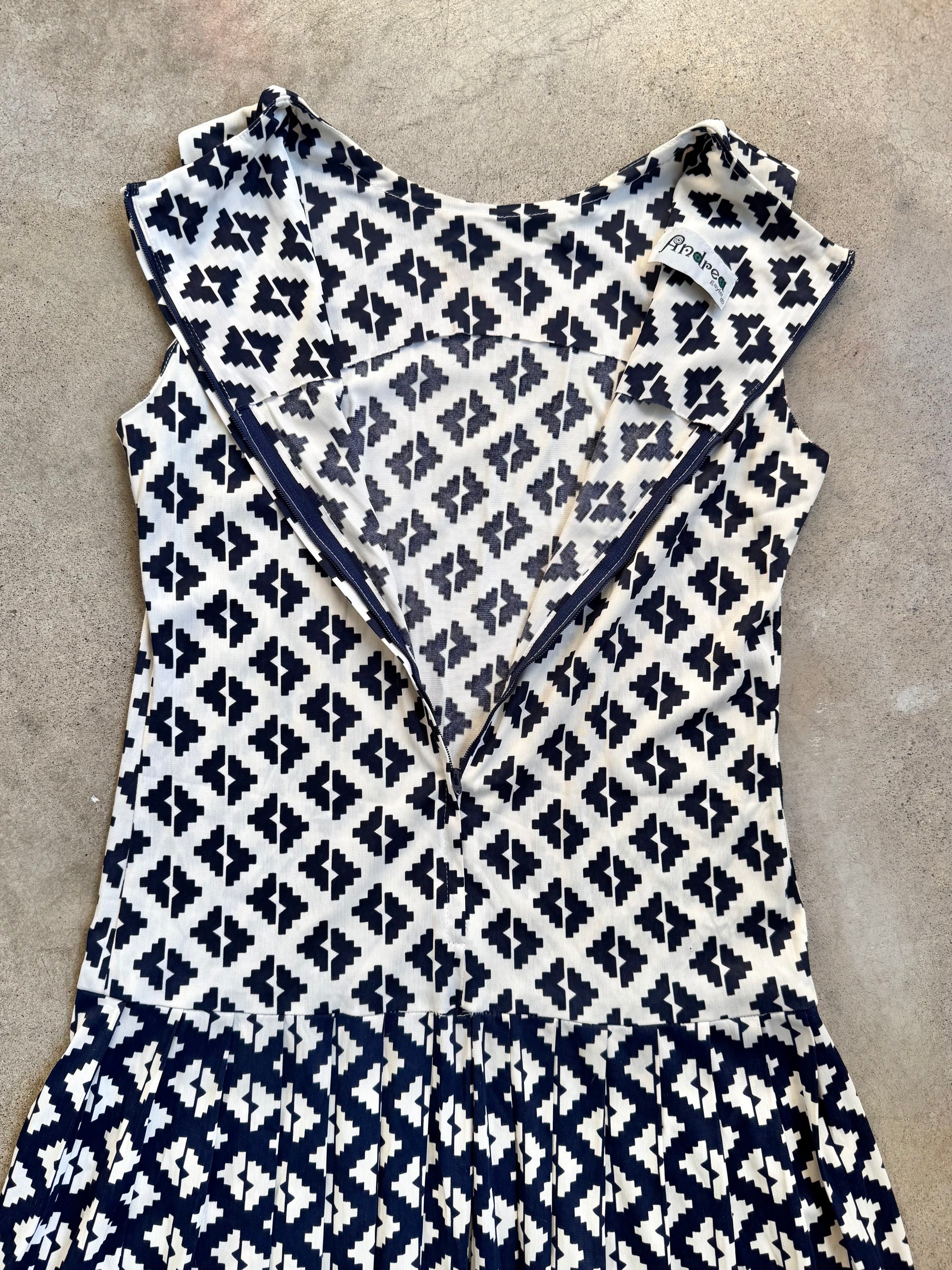 Vintage 1960s Andrea Gayle Blue & White Geometric Pattern Drop-Waist Pleated Skirt Sleeveless Dress. Features a zipper closure at back. Lightweight silky fabric.