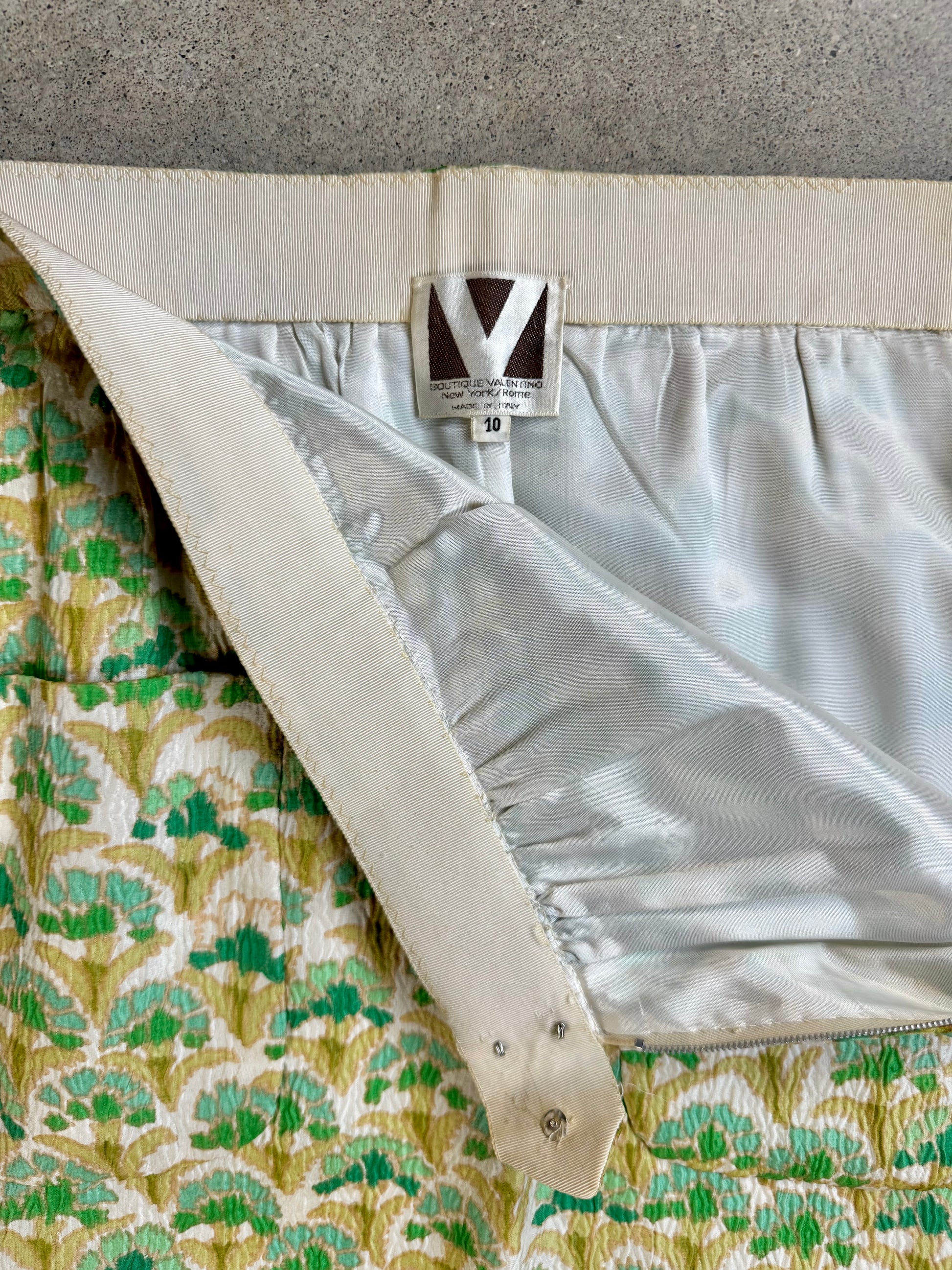 Vintage 1960s Boutique Valentino Green & Gold Floral Silk Side-Slit Maxi Skirt. Features a zipper & button closure at side of waist. 100% pure silk fabric - has a puckered texture.