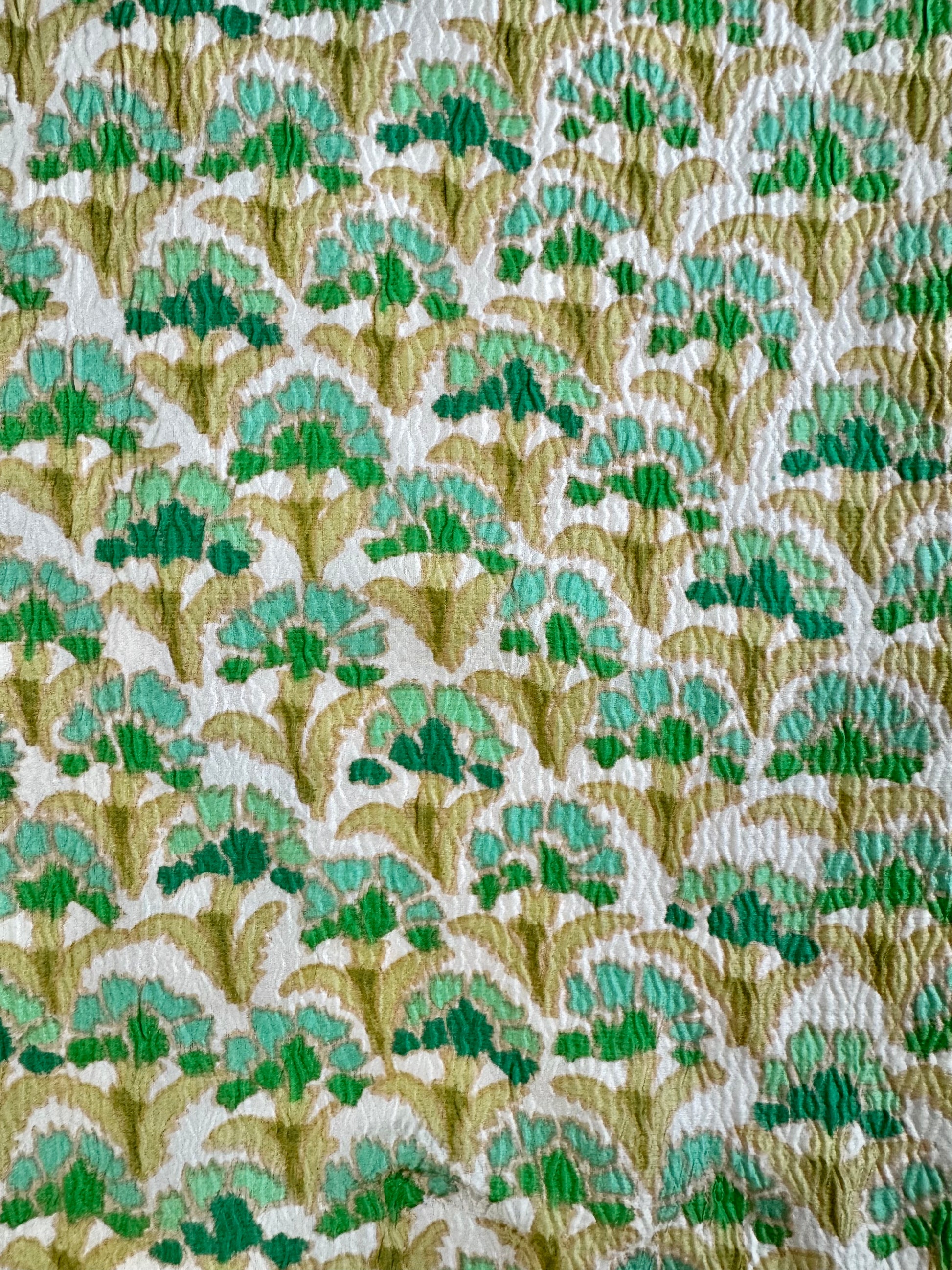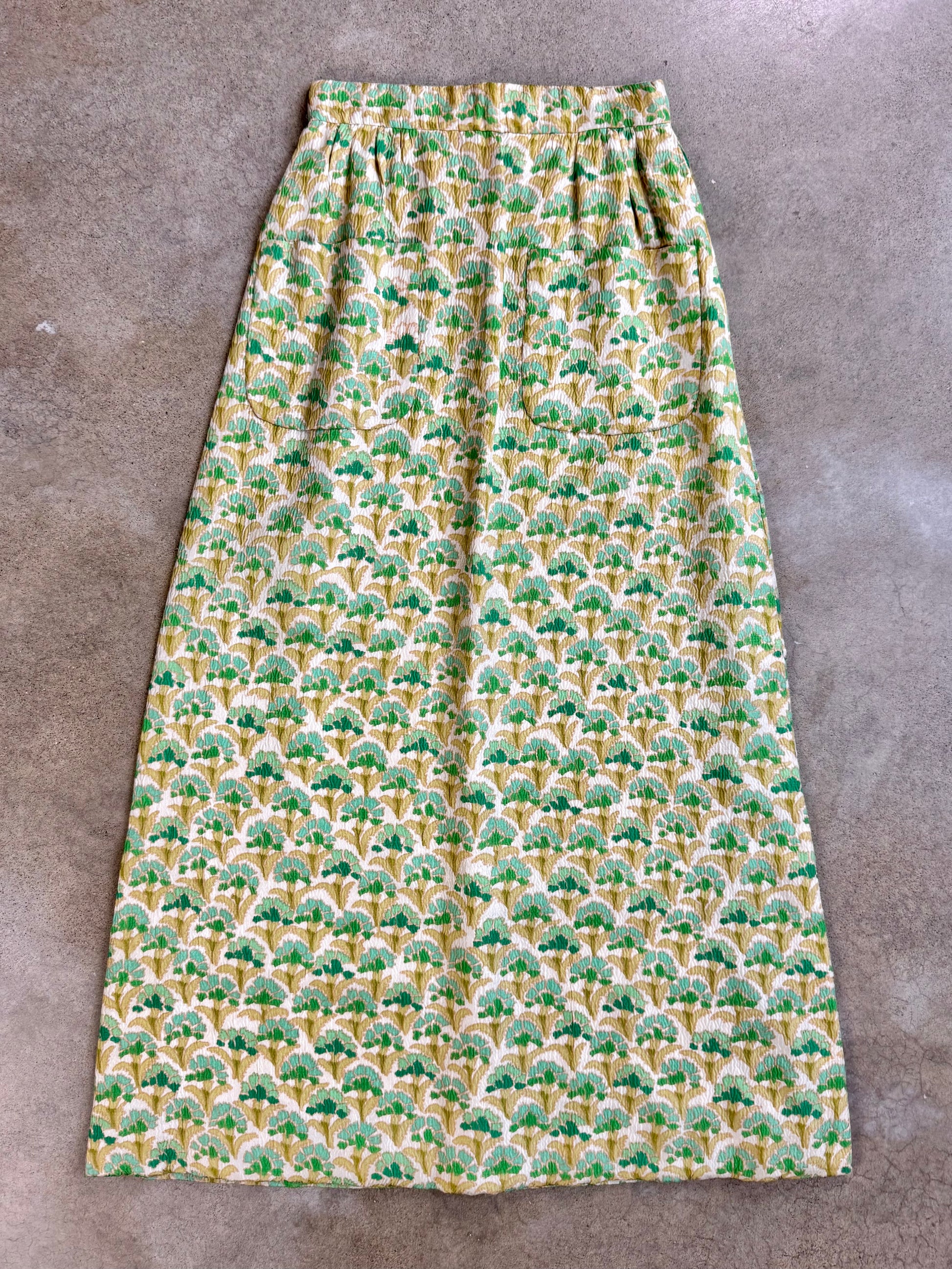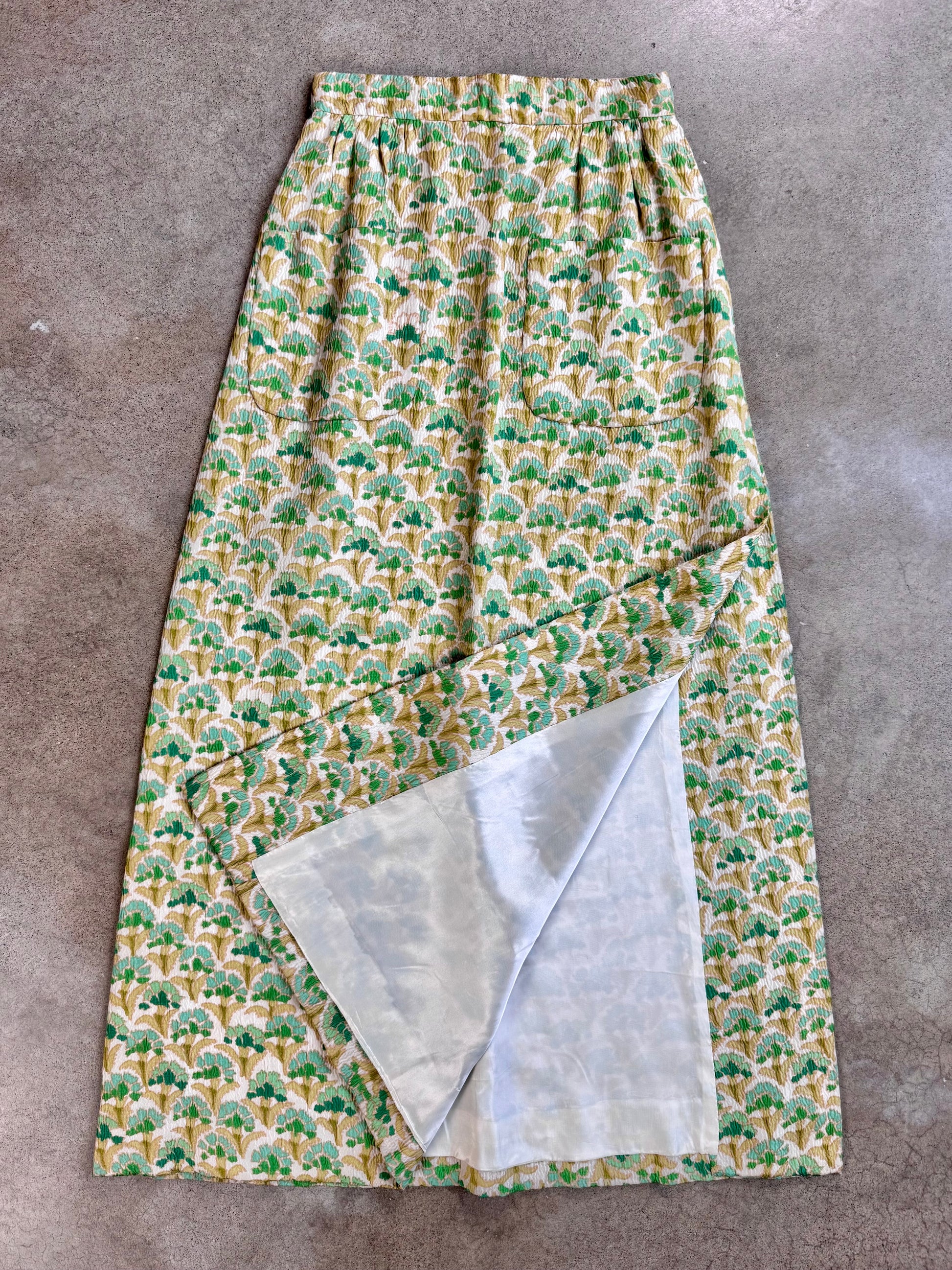 Vintage 1960s Boutique Valentino Green & Gold Floral Silk Maxi Skirt | Waist 26”
