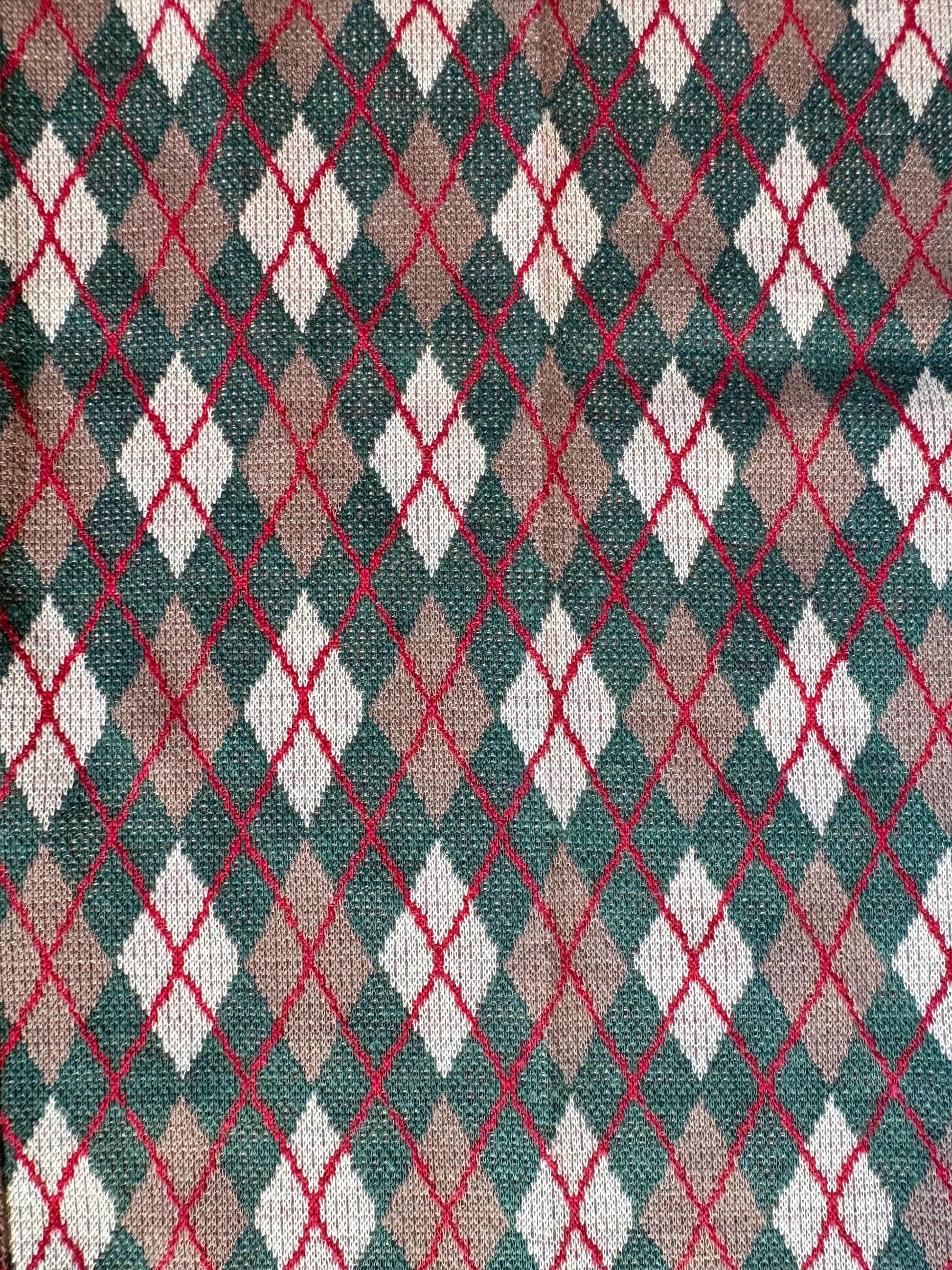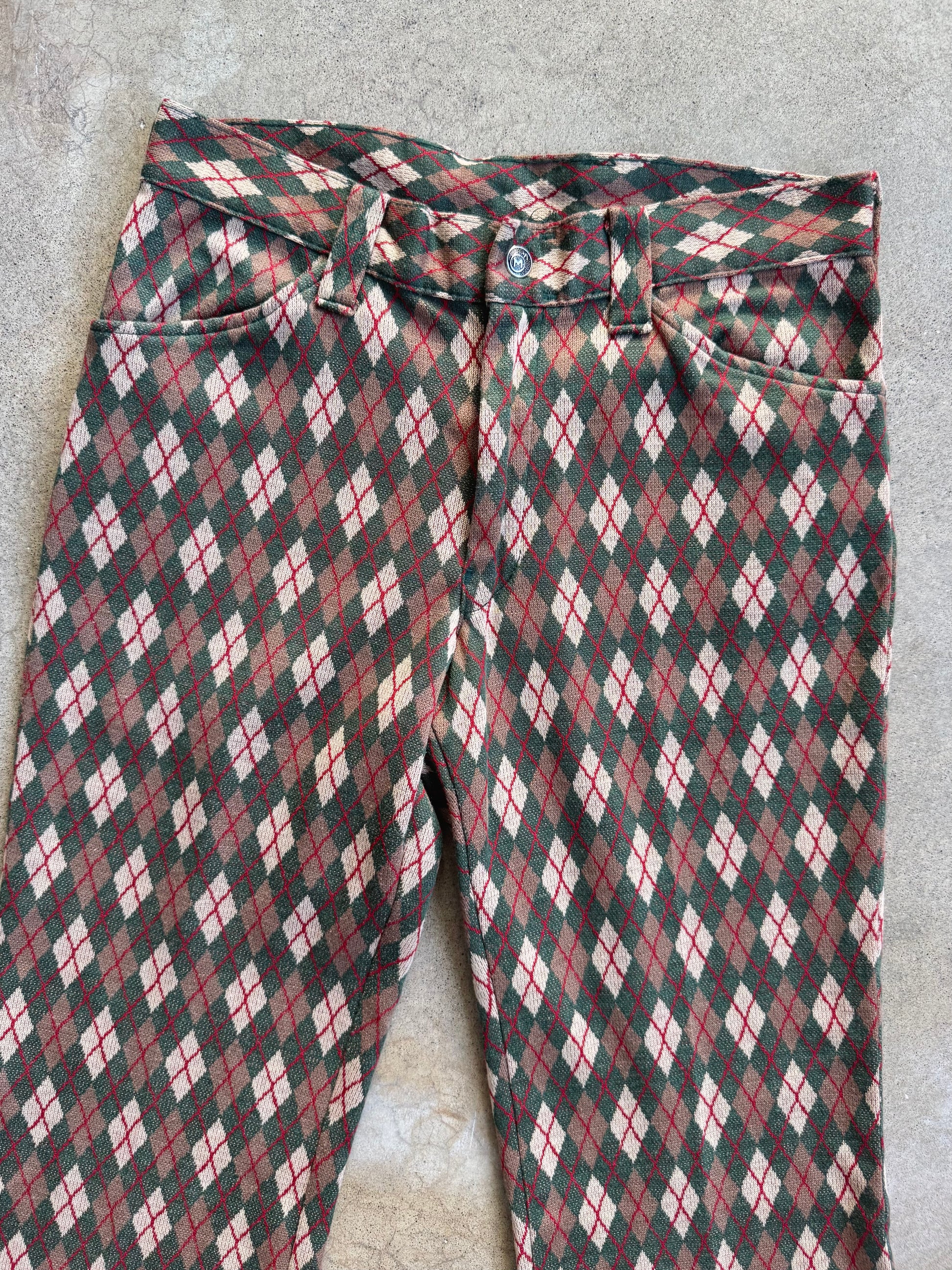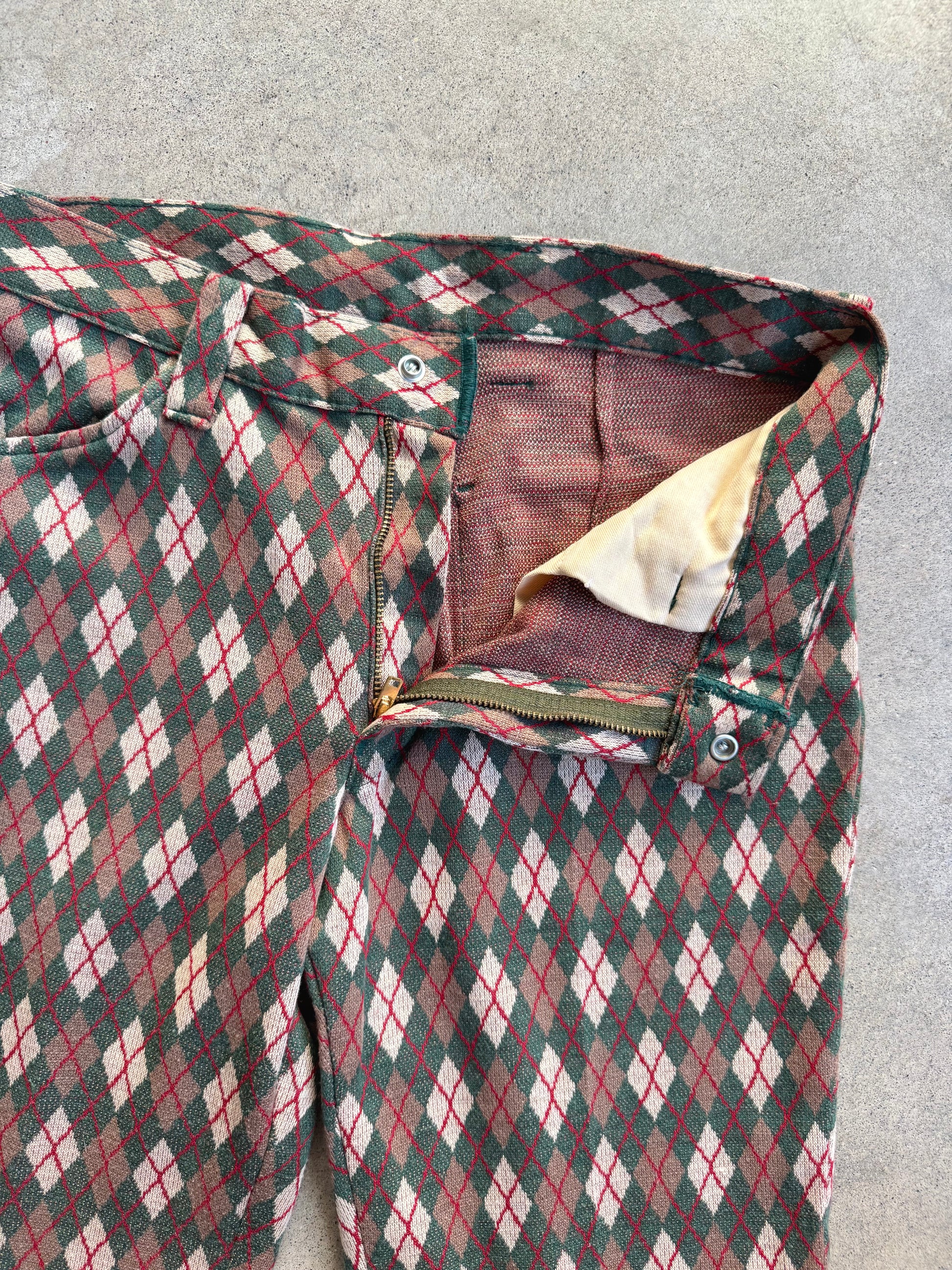 Vintage 1960s Brown, Green & Red Argyle Pattern Knit Mid-Rise Cuffed Flare Trousers. Features a zipper fly & snap button closure. Polyester knit fabric.