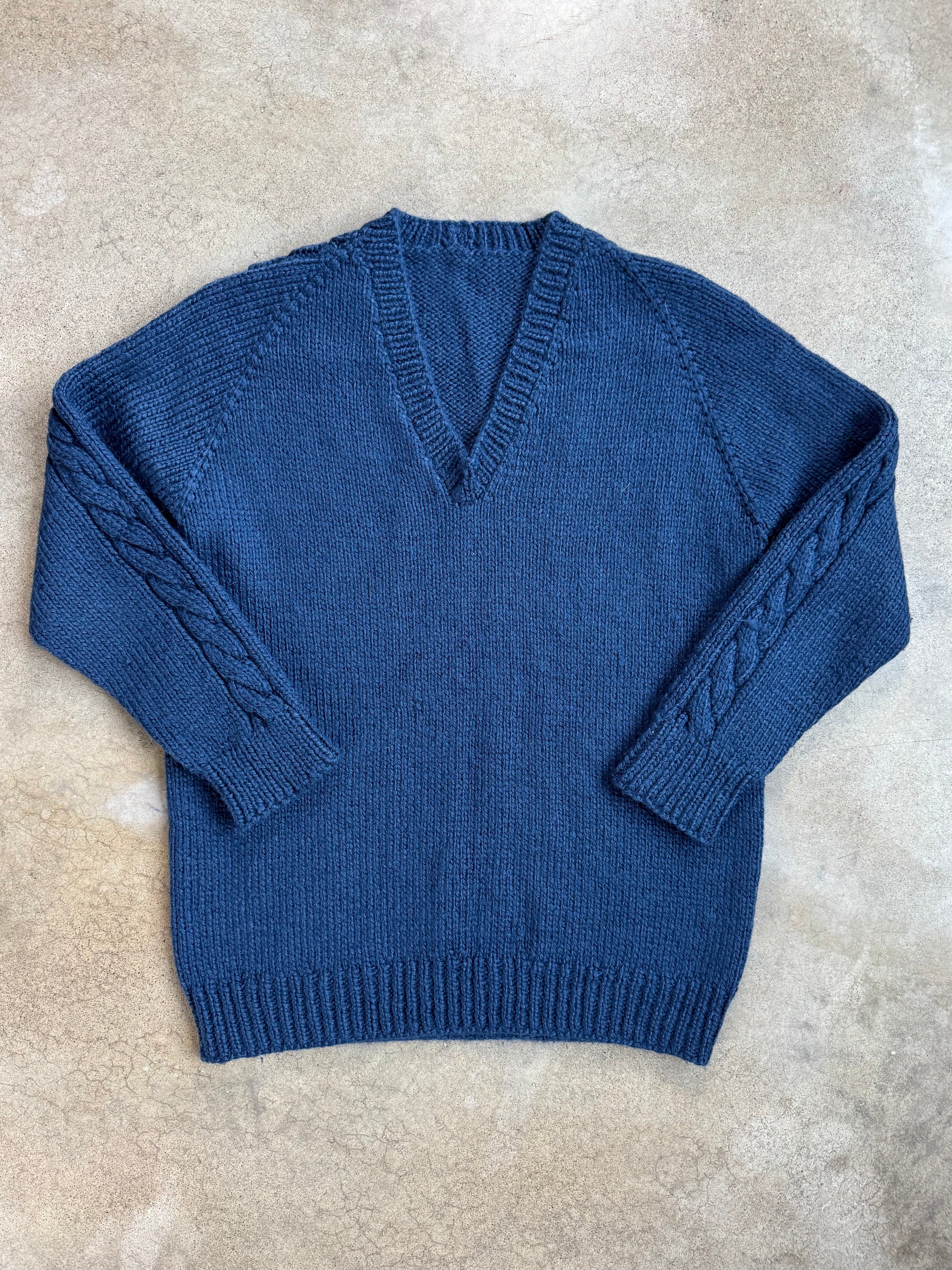 Vintage 1960s Hand-Knit Blue V-Neck Sweater. Thick, chunky knit fabric with cable knit detailing on sleeves.