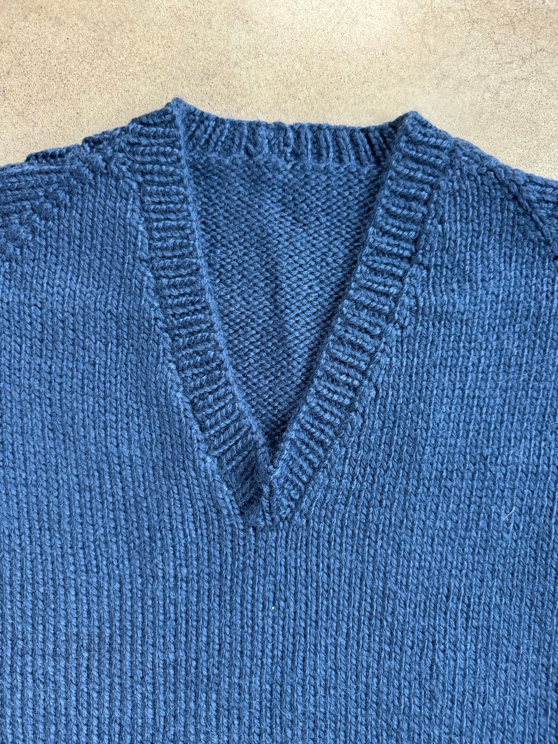 Vintage 1960s Hand-Knit Blue V-Neck Sweater | L/XL