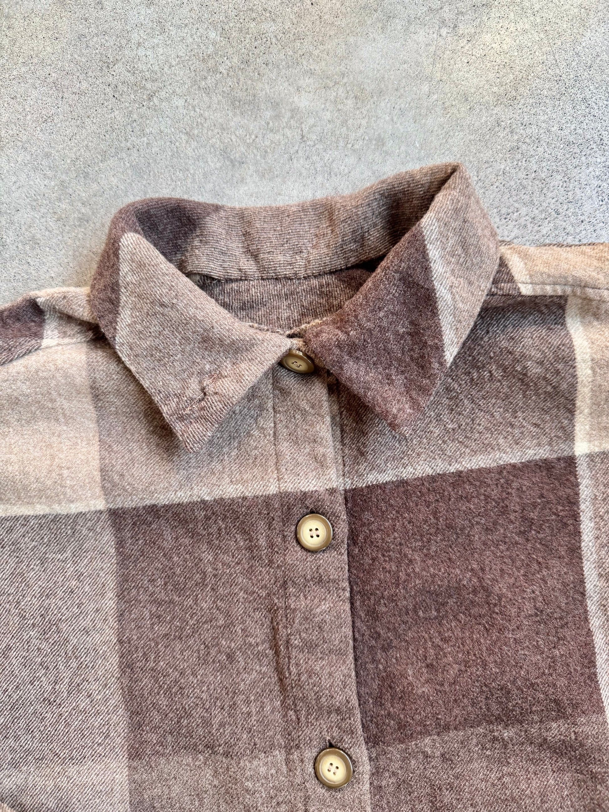 Vintage 1960s Handmade Brown-Tone Plaid Shirt Dress. Features front button closures on bodice and batwing-style 3/4 length sleeves. Lighter weight wool fabric.