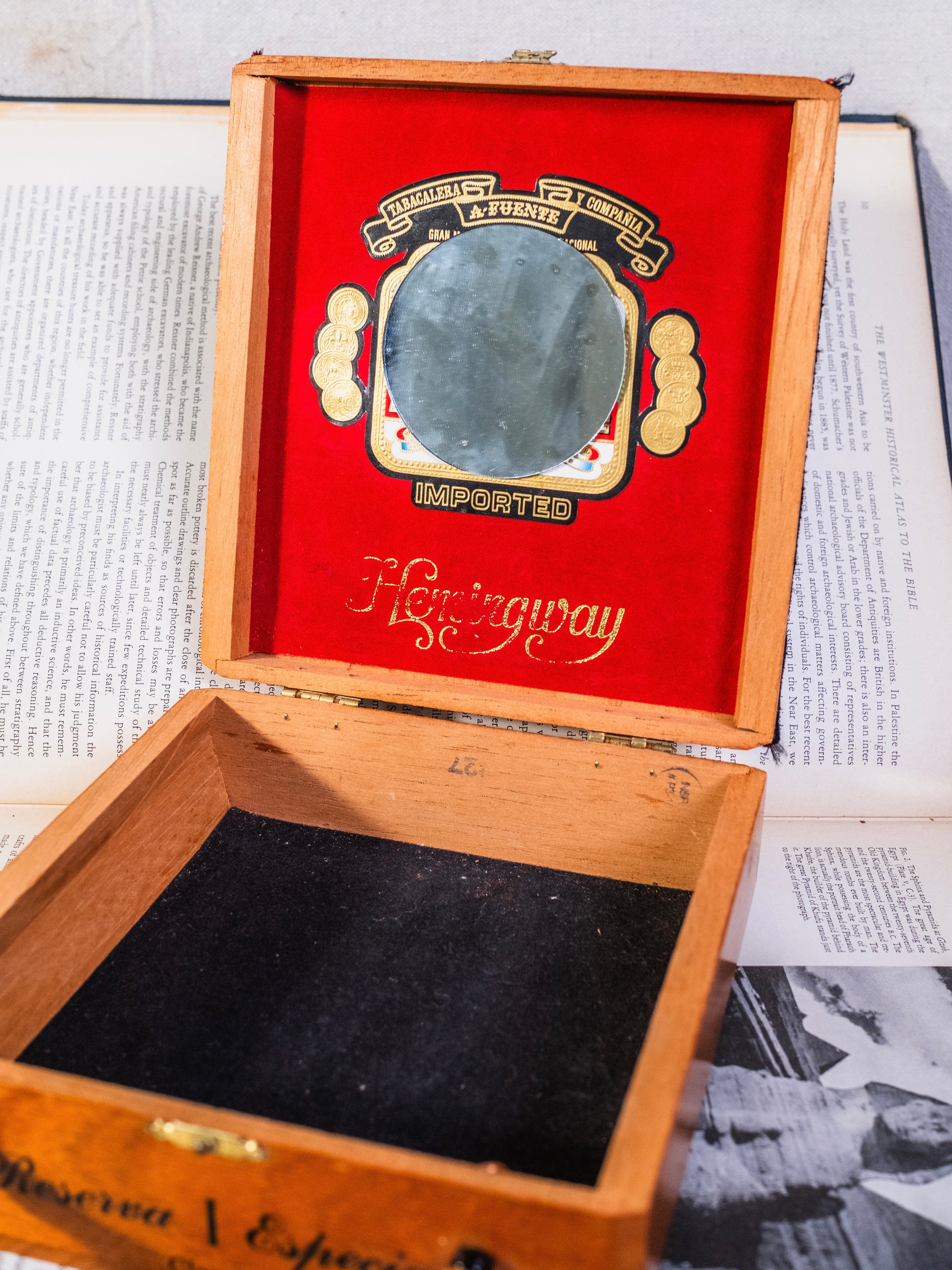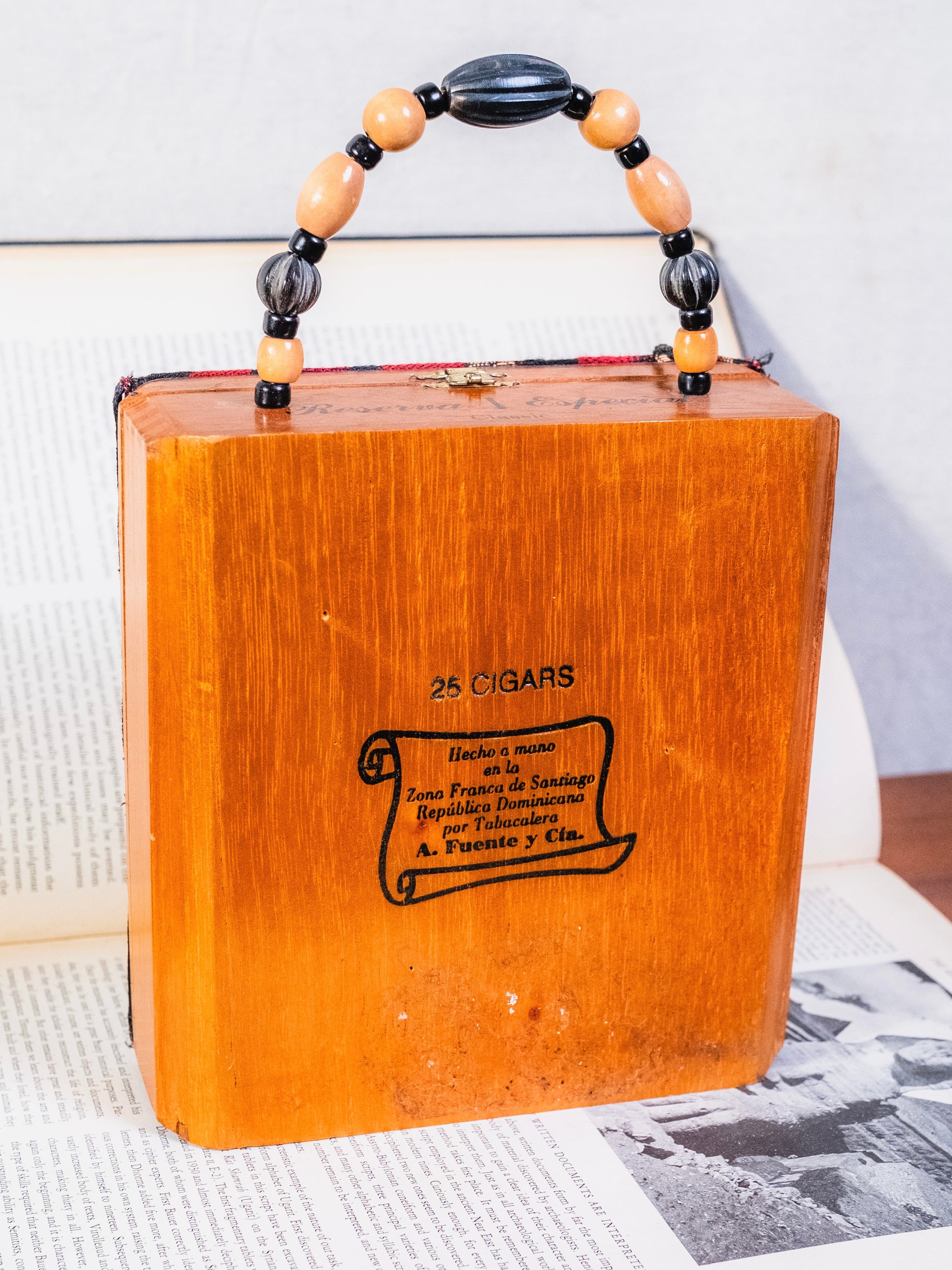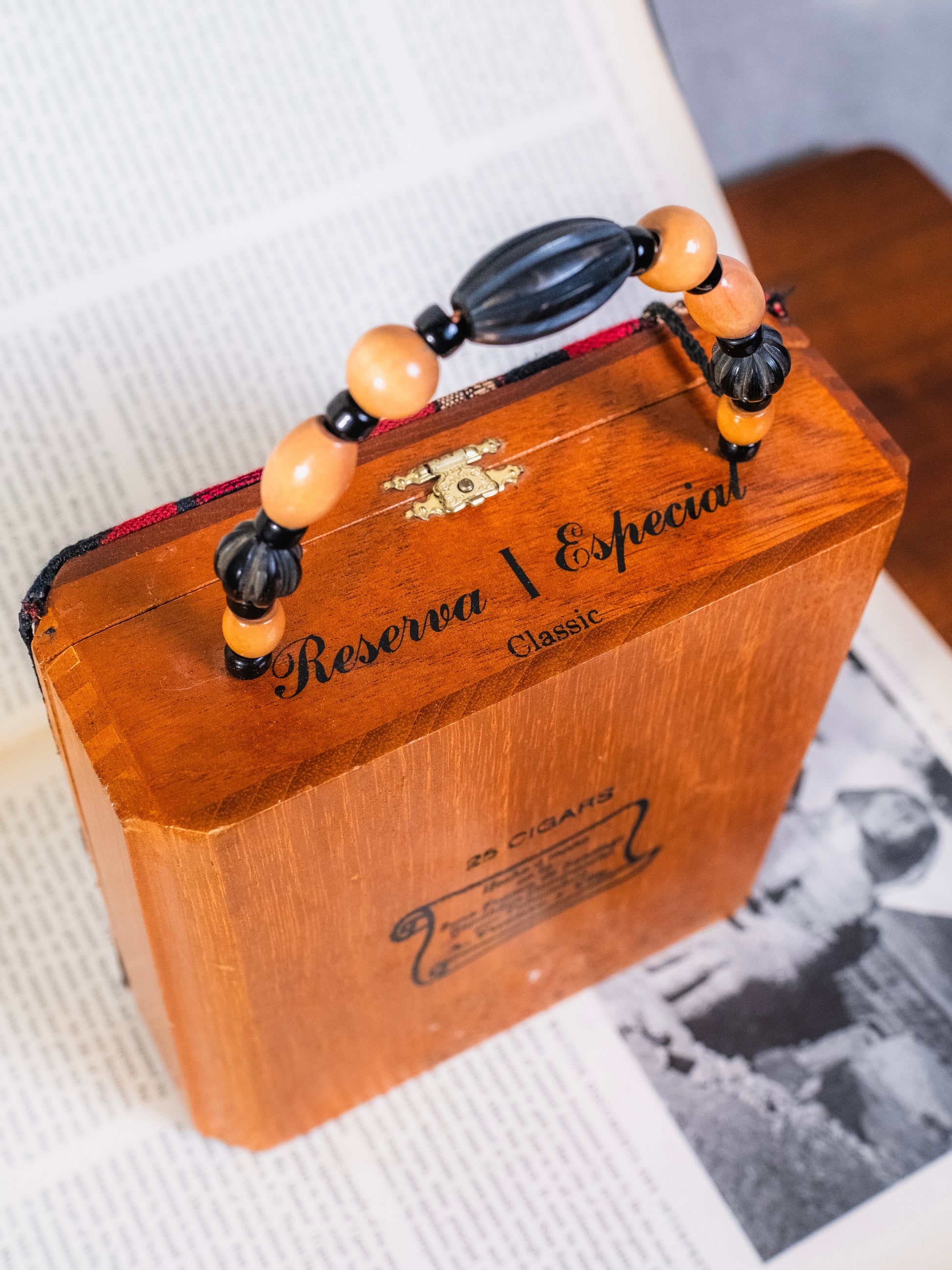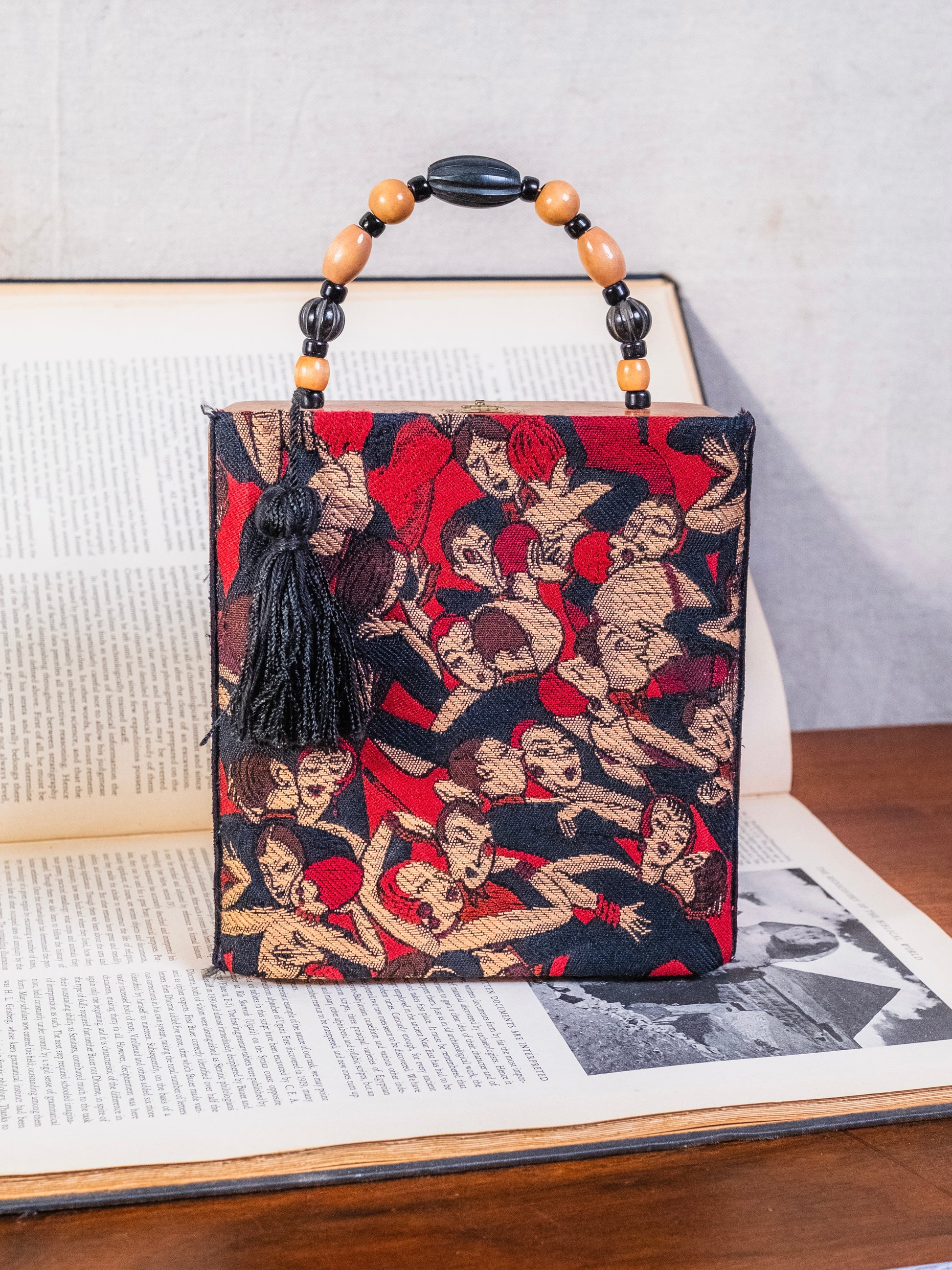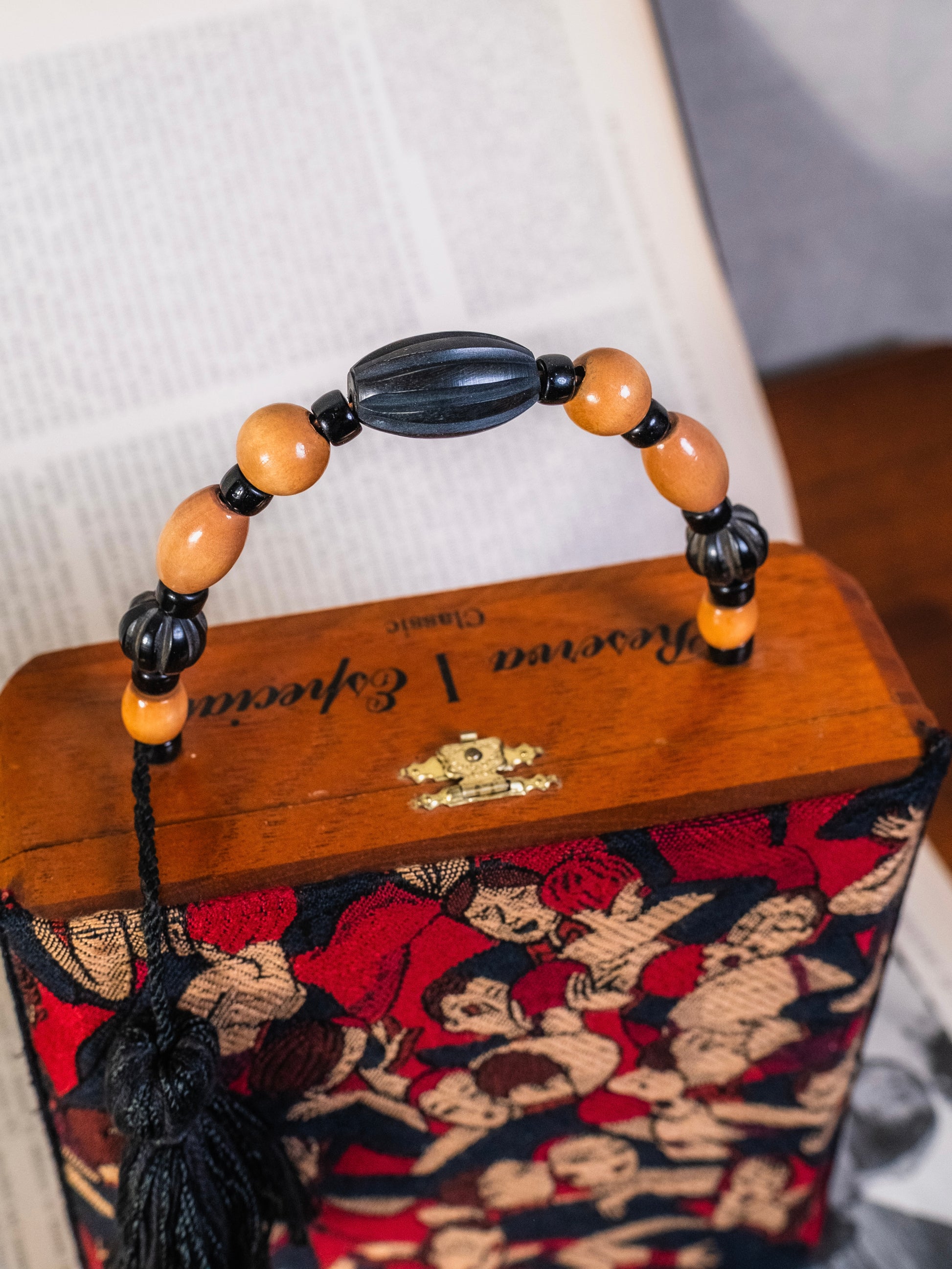 Vintage 1960s Handmade Cigar Box Purse w/ “Gatsby Party” Fabric Front & Beaded Top Handle.