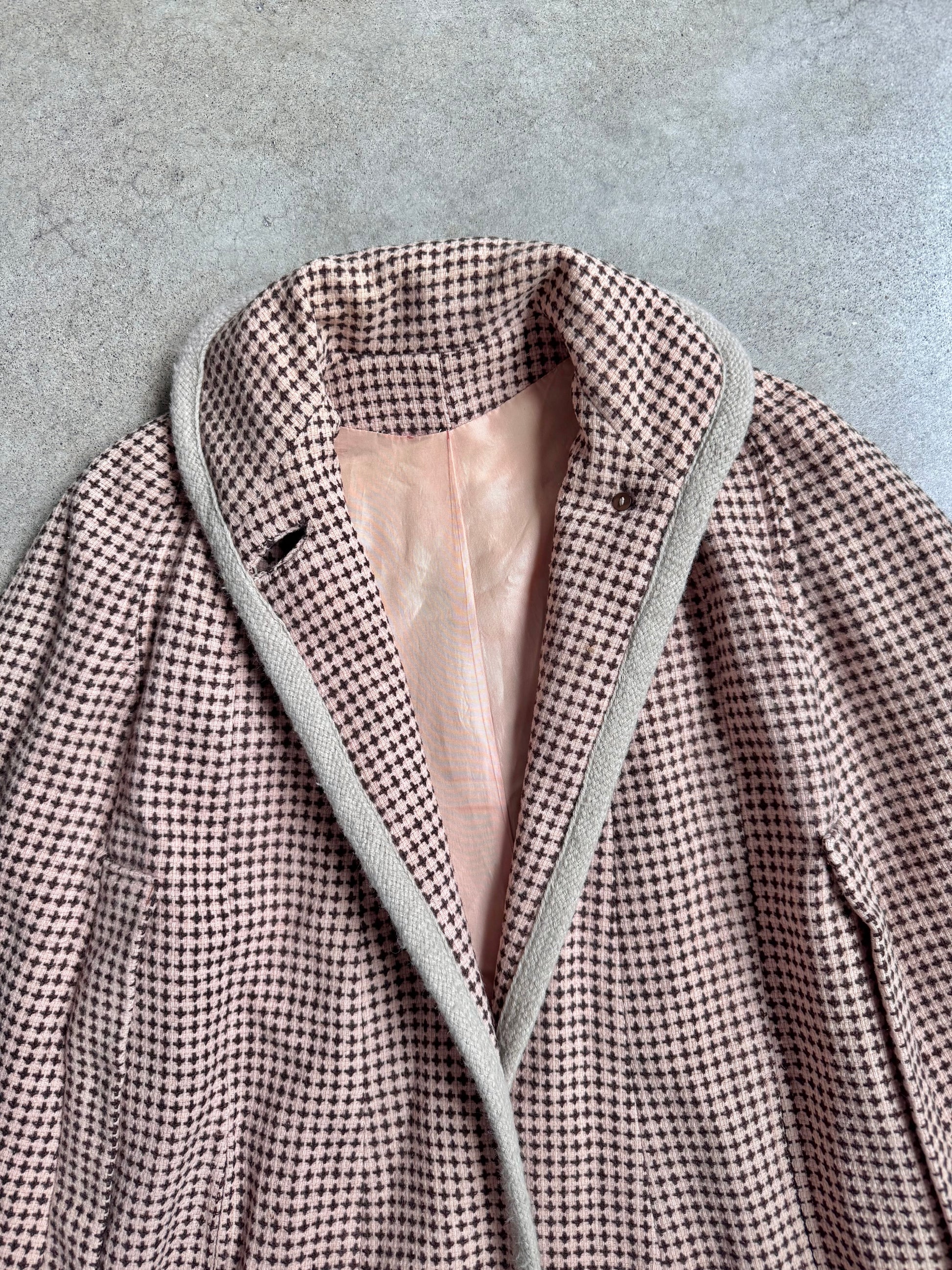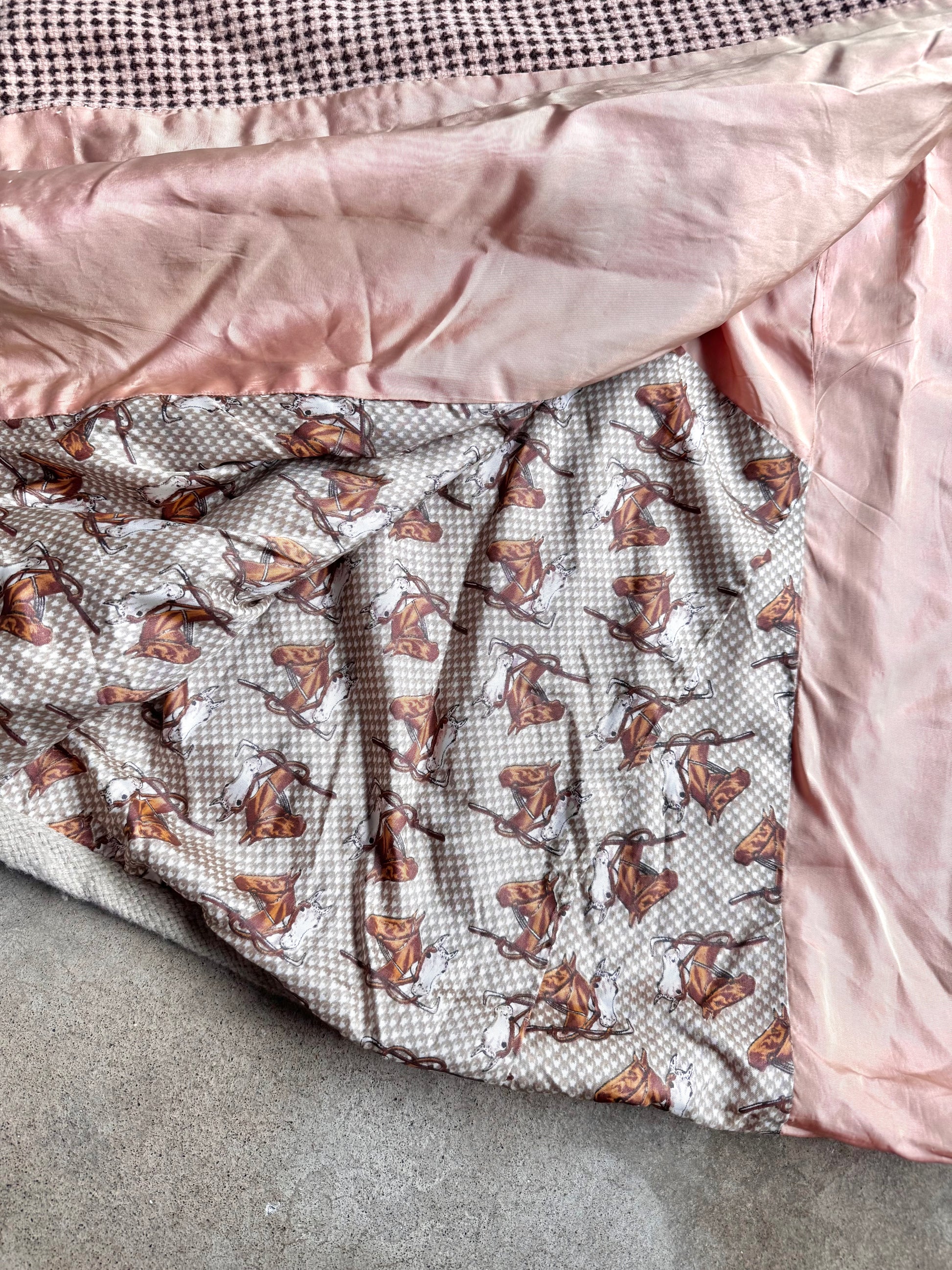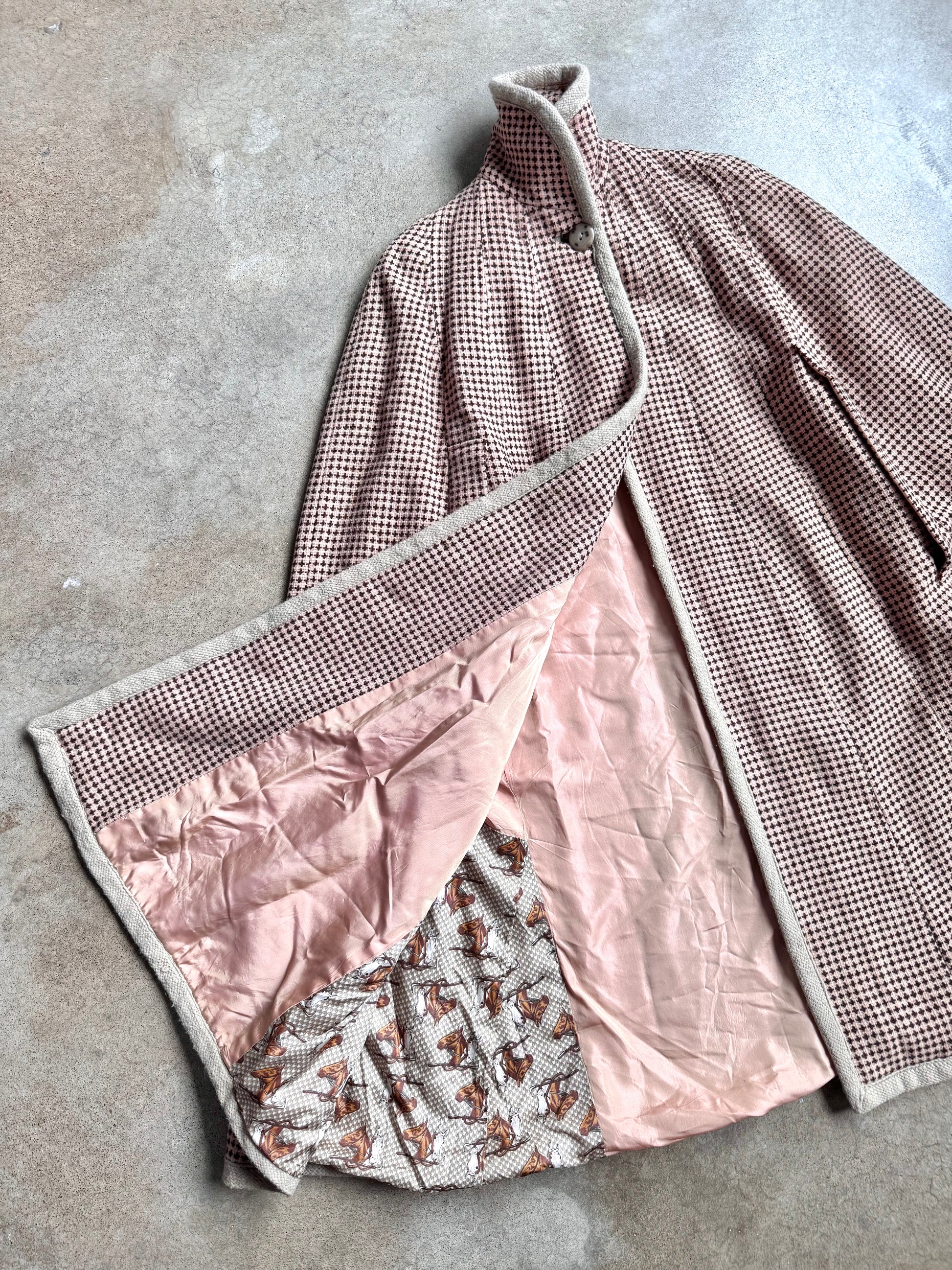 Vintage 1960s Handmade Muted Pink, Cream & Brown Wool Tweed High-Neck Buttoned Cape. Fully lined with equestrian printed detailing.