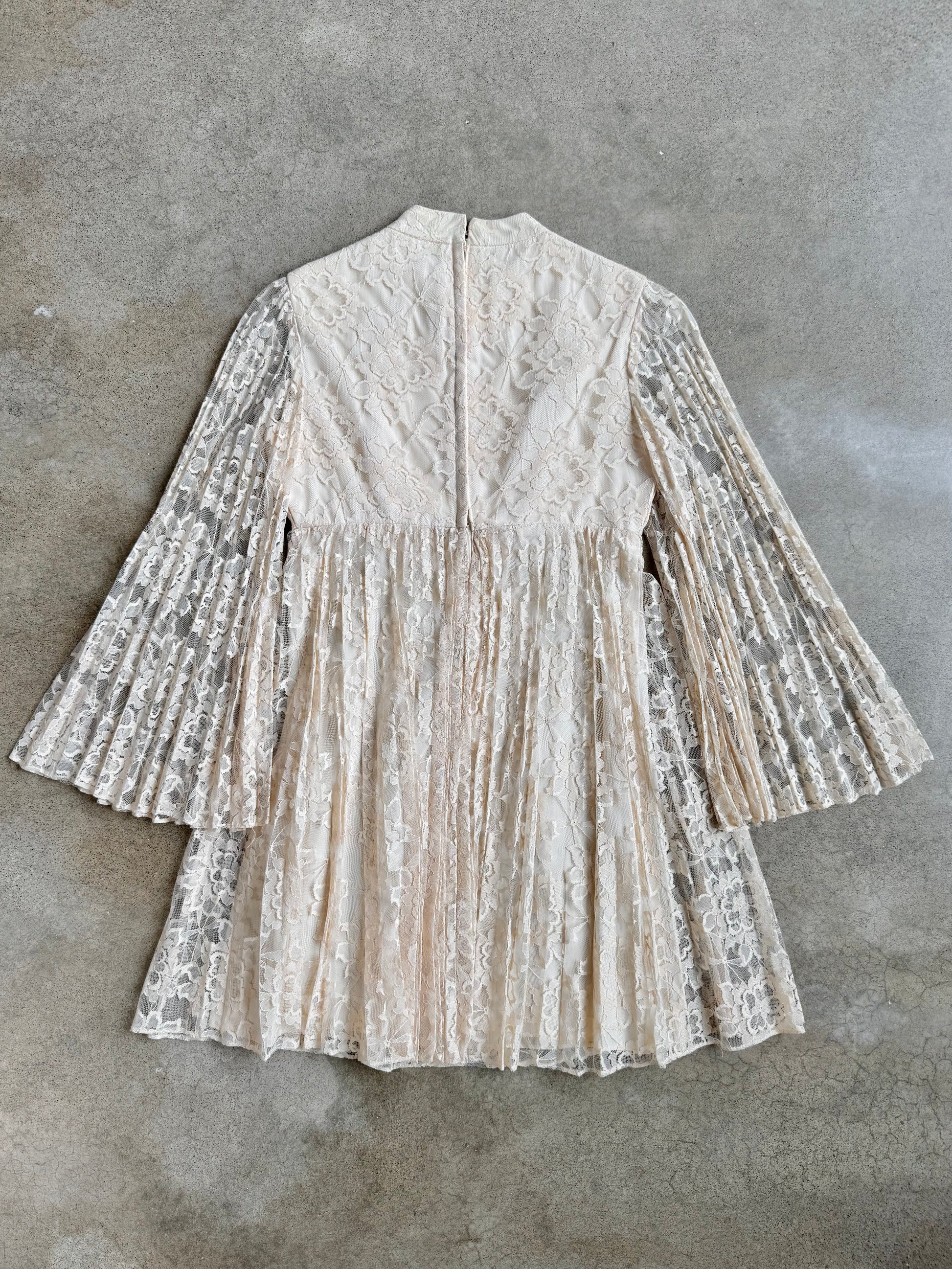 Vintage 1960s Ivory Lace Pleated Bell Sleeve Babydoll Mini Dress | XS
