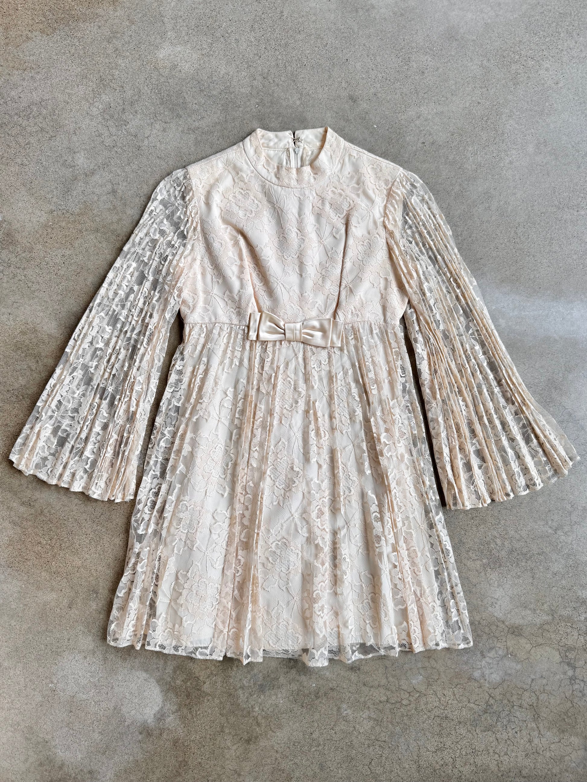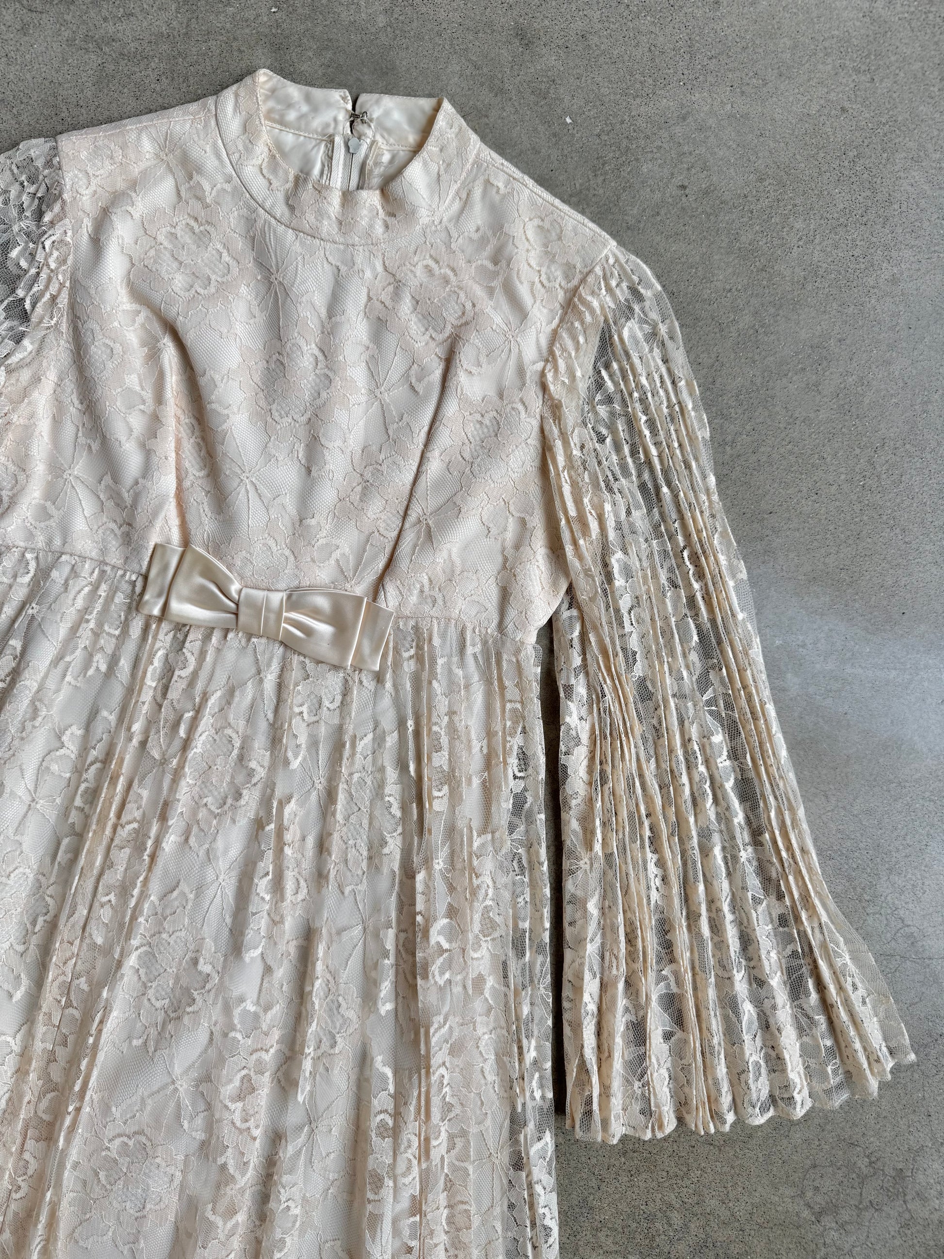 Vintage 1960s Ivory/Cream Lace Pleated Bell Sleeve High-Neck Babydoll-Style Mini Dress. Features an empire waist with satin bow detailing, zipper closure at back. Bodice & skirt are lined, sheer sleeves.