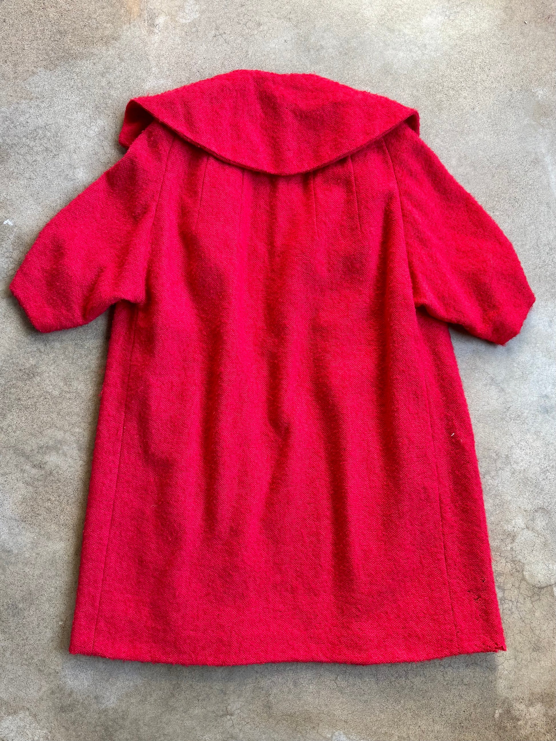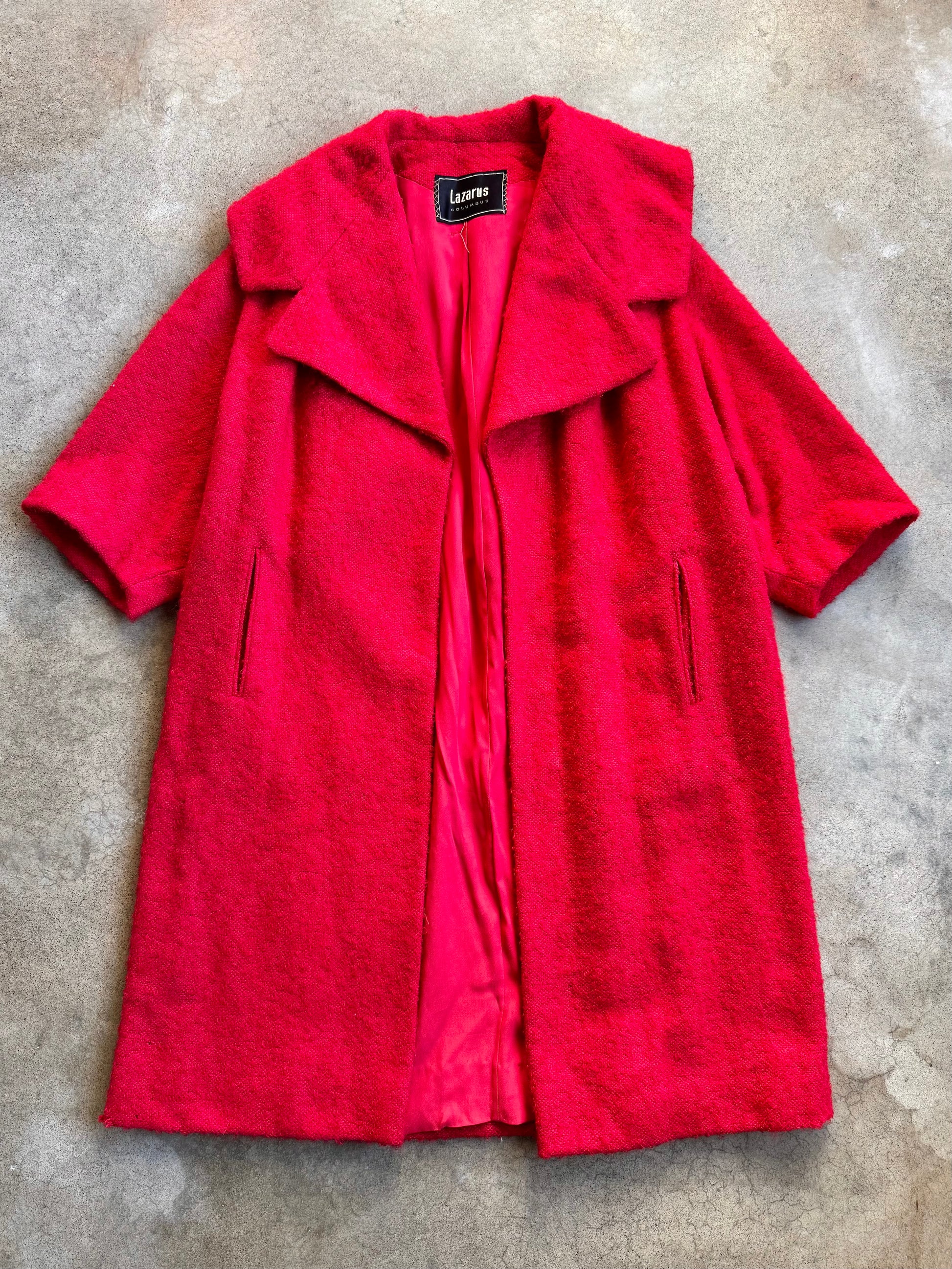 Vintage 1960s Lazarus Red Wool-Blend Open Swing Coat. Features an oversized lapel collar & short wide sleeves. Fully lined.