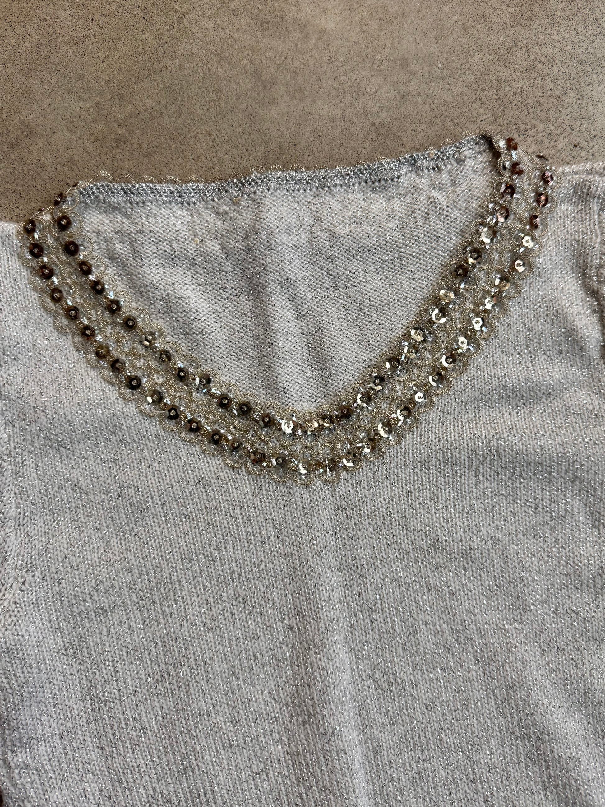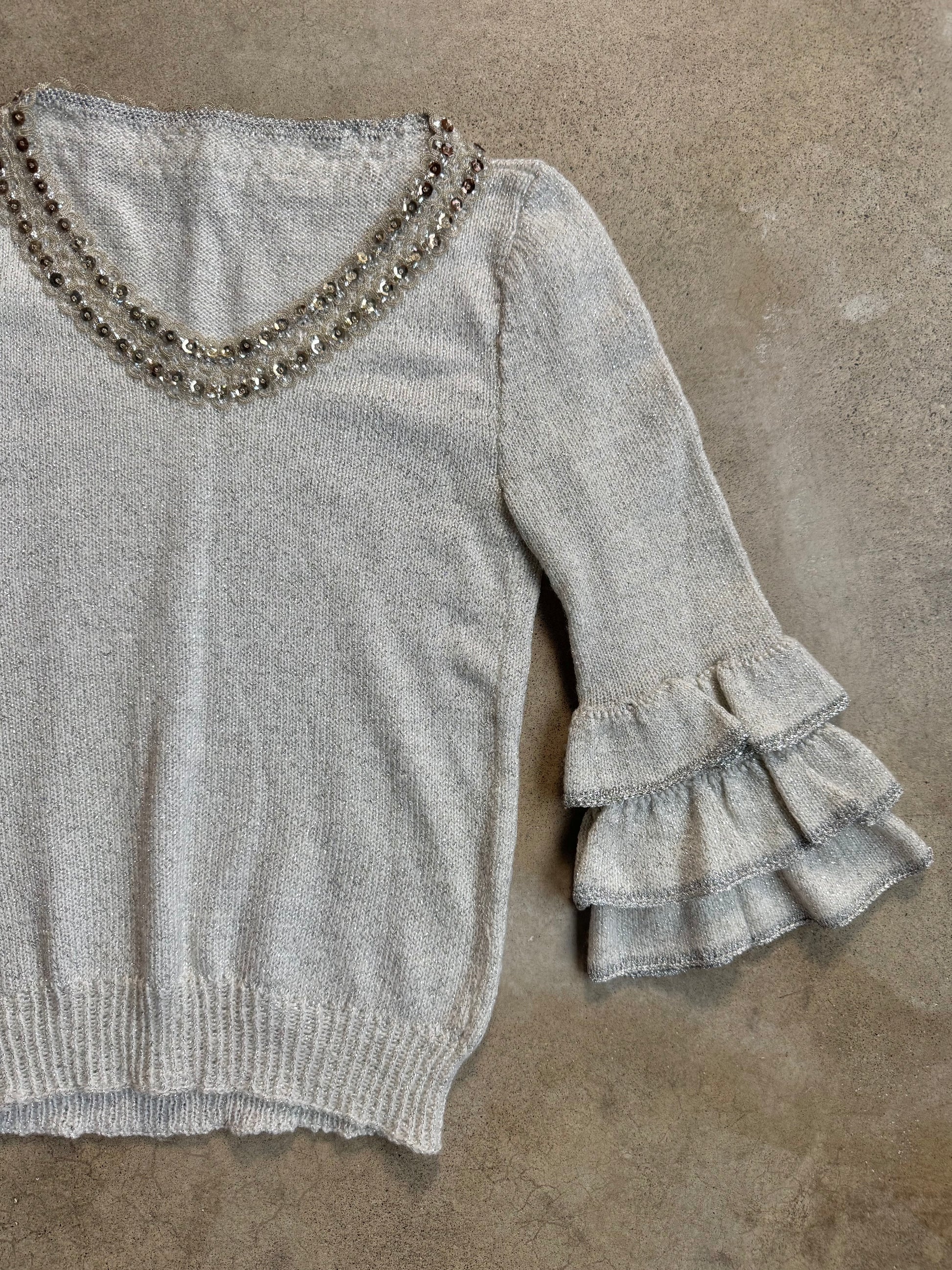 Vintage 1960s Silver Metallic Knit Ruffled Bell Sleeve Sweater w/ Sequin Trim Detailing.