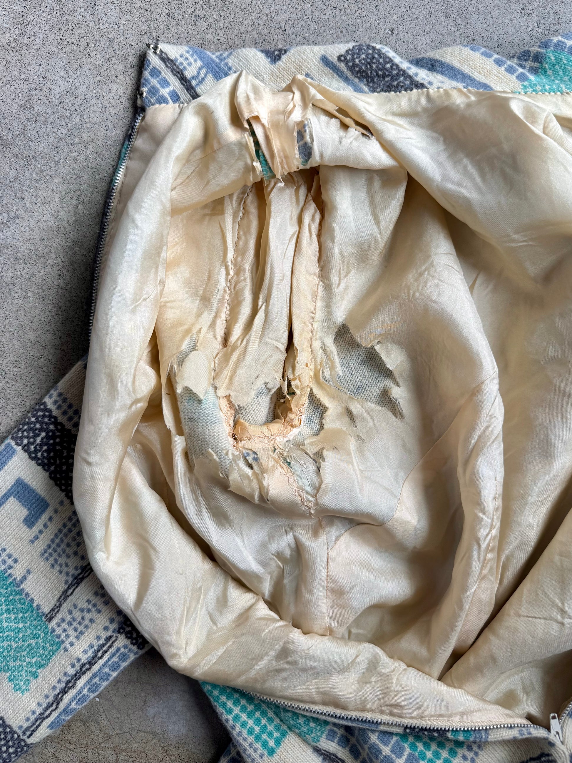 Item Condition - There are a few faint stains throughout dress. Inside lining is ripped around underarm area (see photos).
