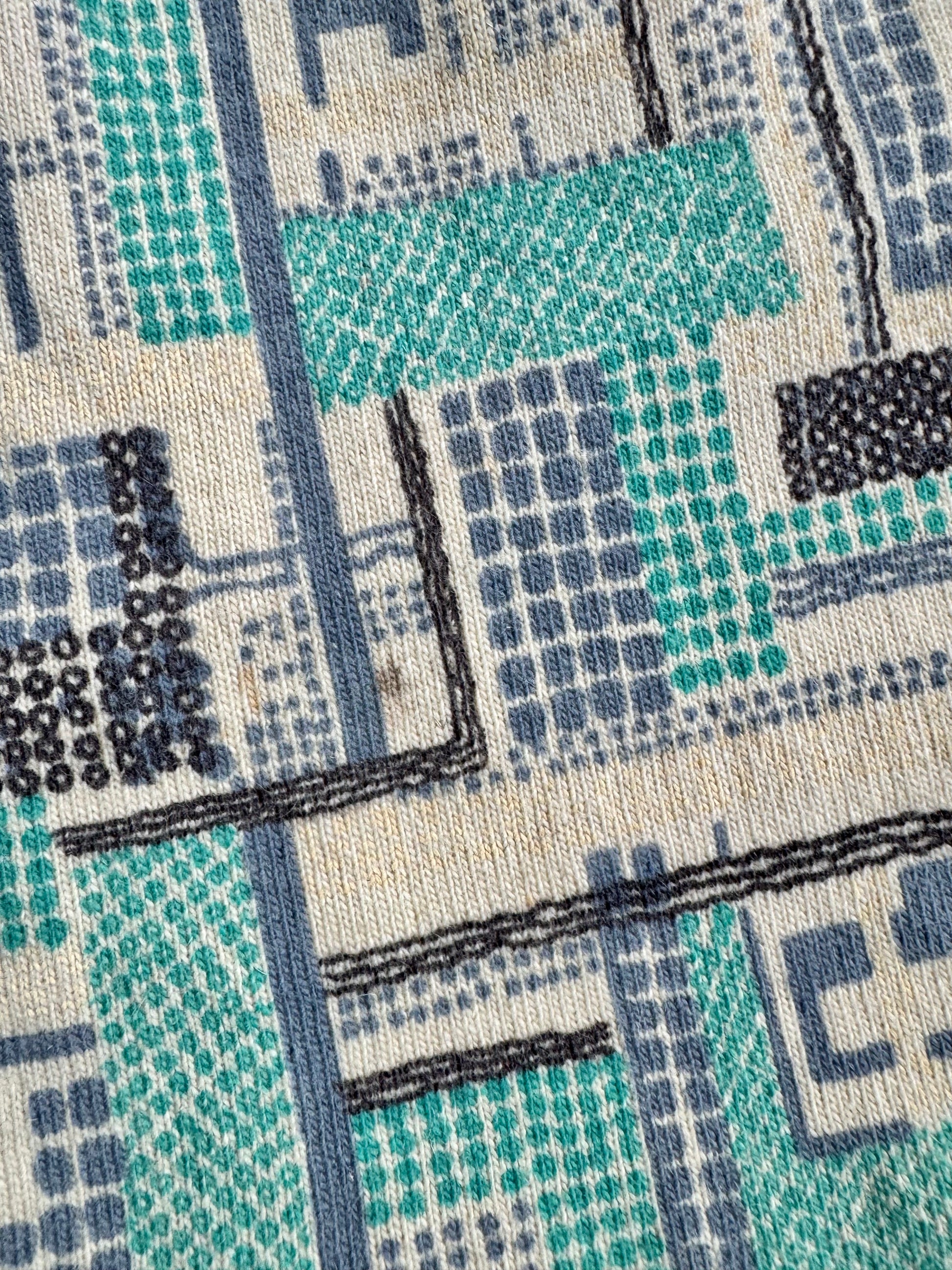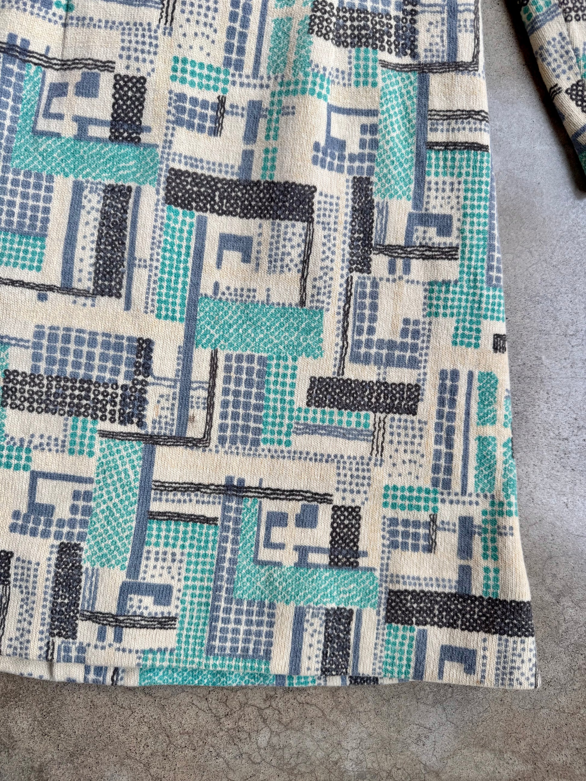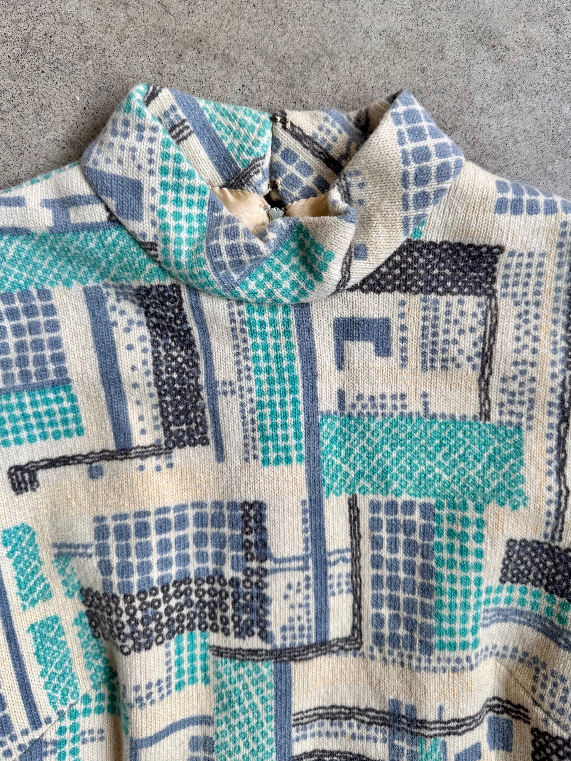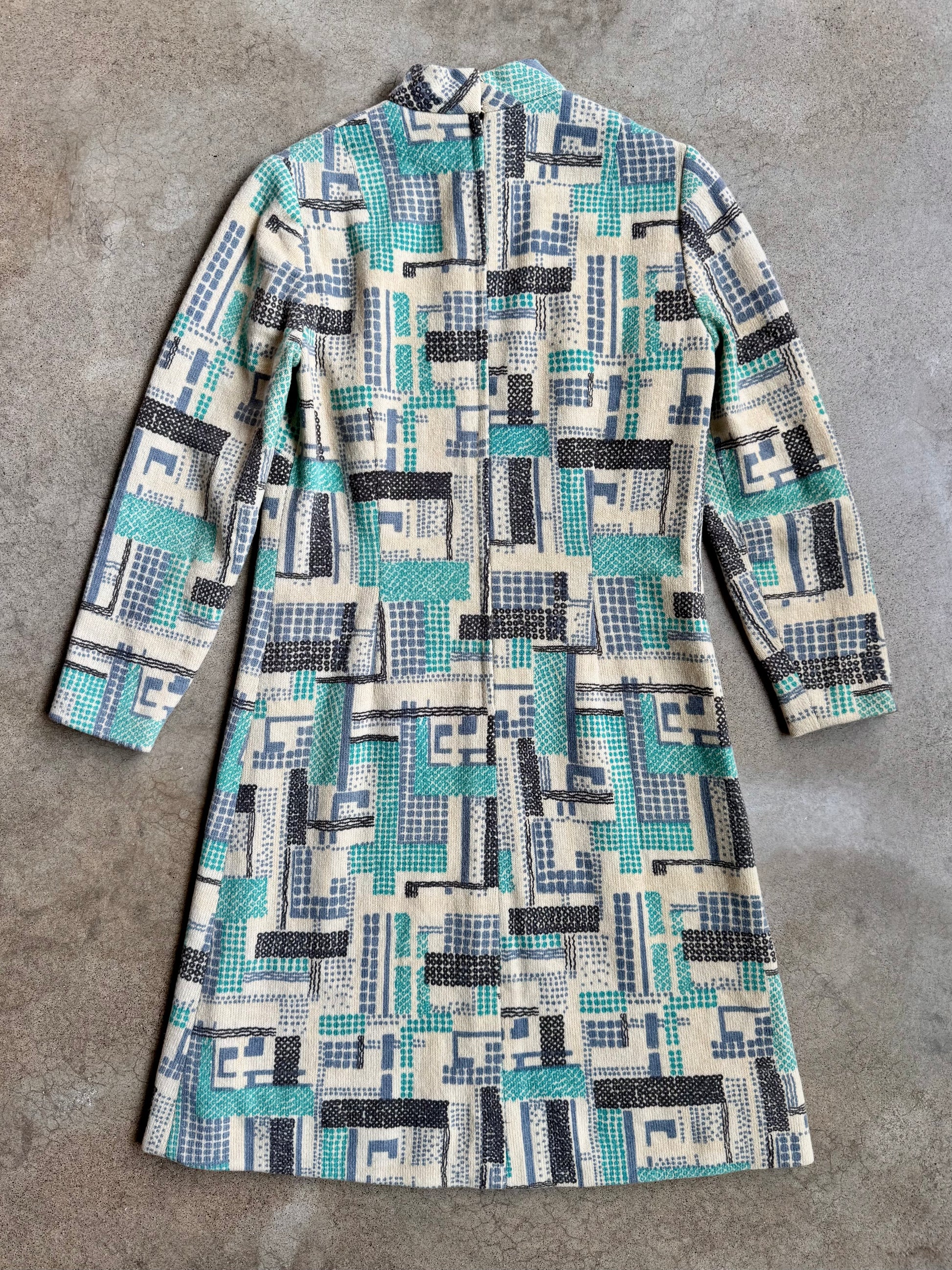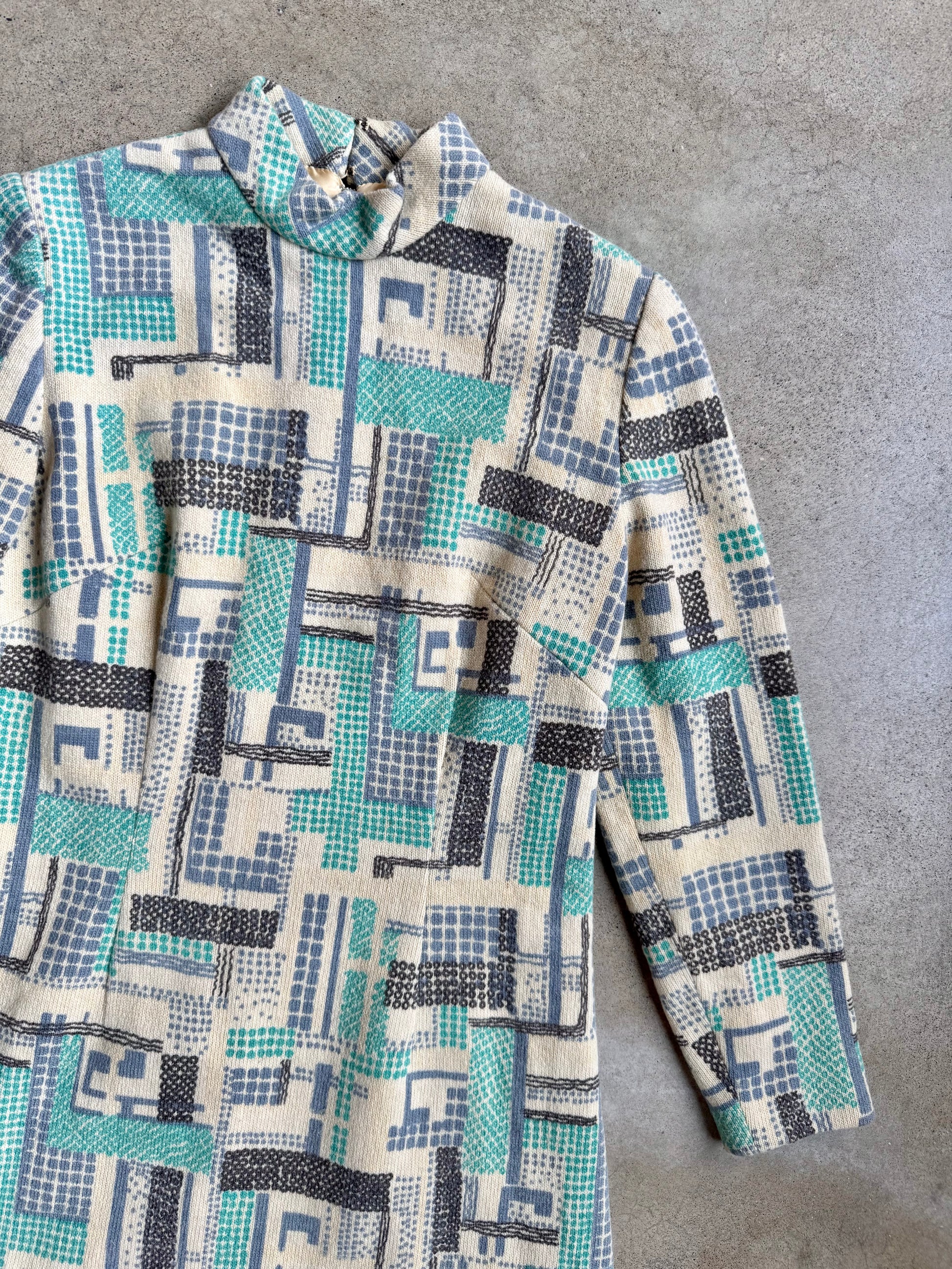 Vintage 1960s Mod Geometric Pattern High-Neck Long Sleeve Wool Dress | Medium