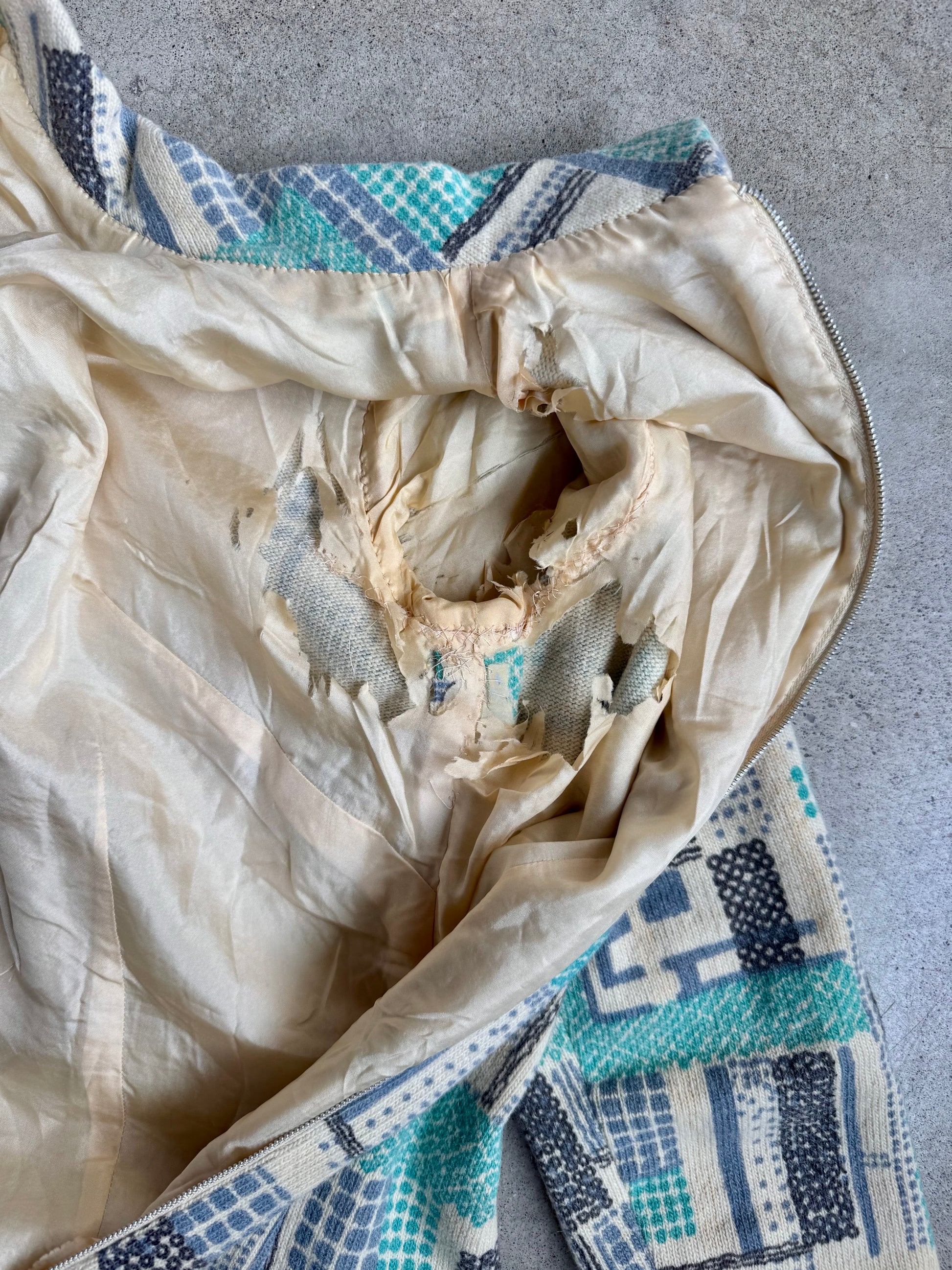 Vintage 1960s Mod Geometric Pattern High-Neck Long Sleeve Shift Dress. Features a zipper down the back w/ two hook & eye closures at back of neck. Thick wool fabric, fully lined.