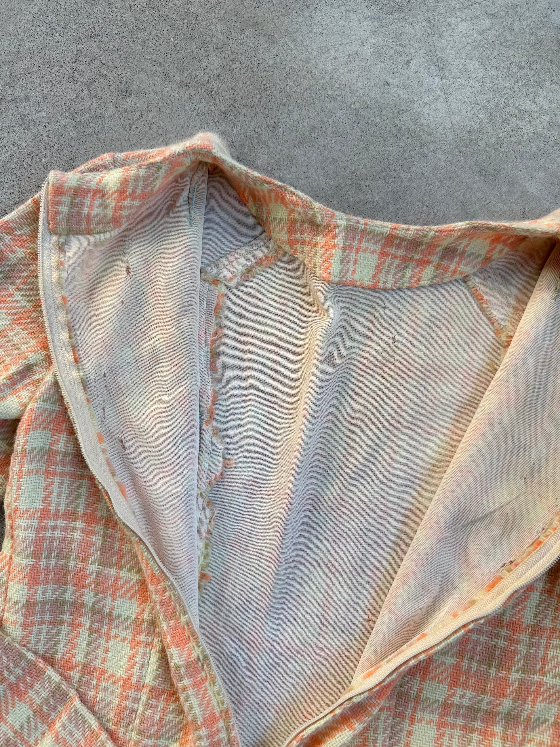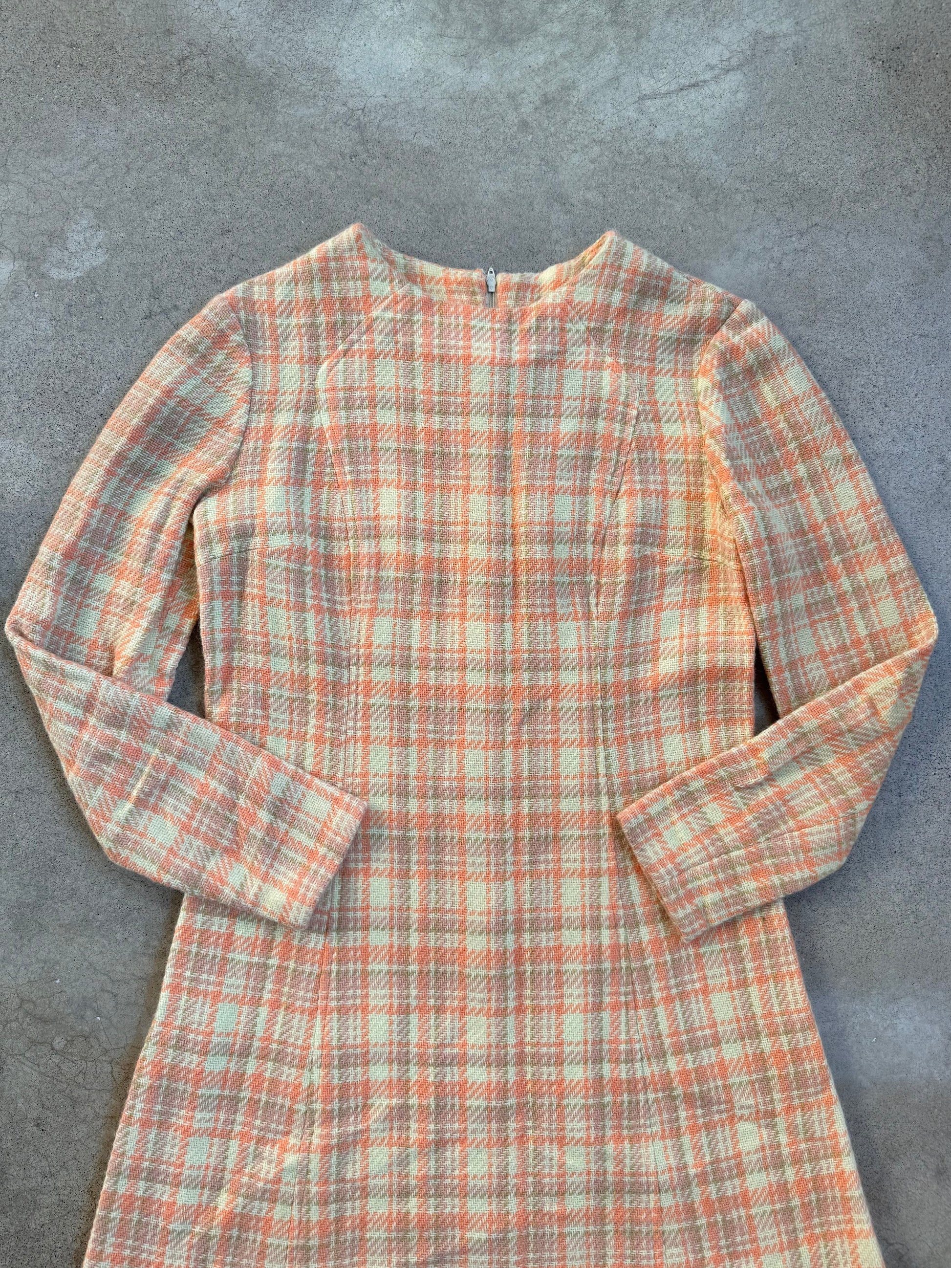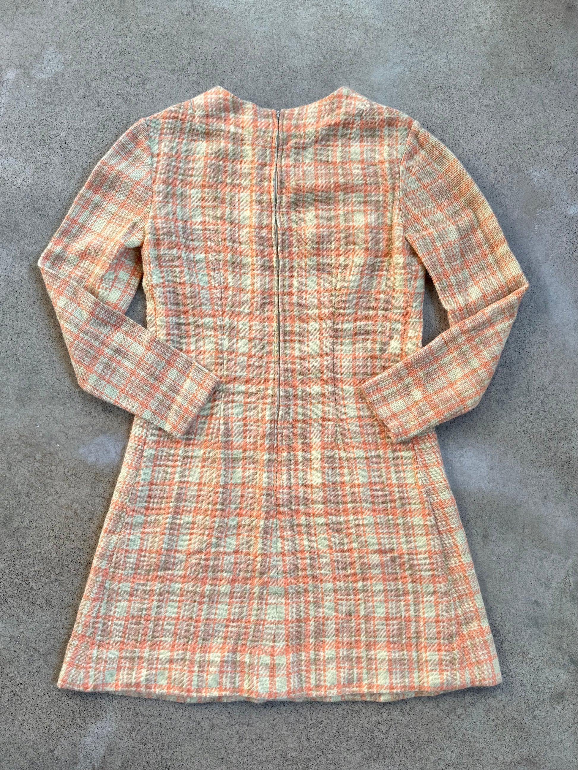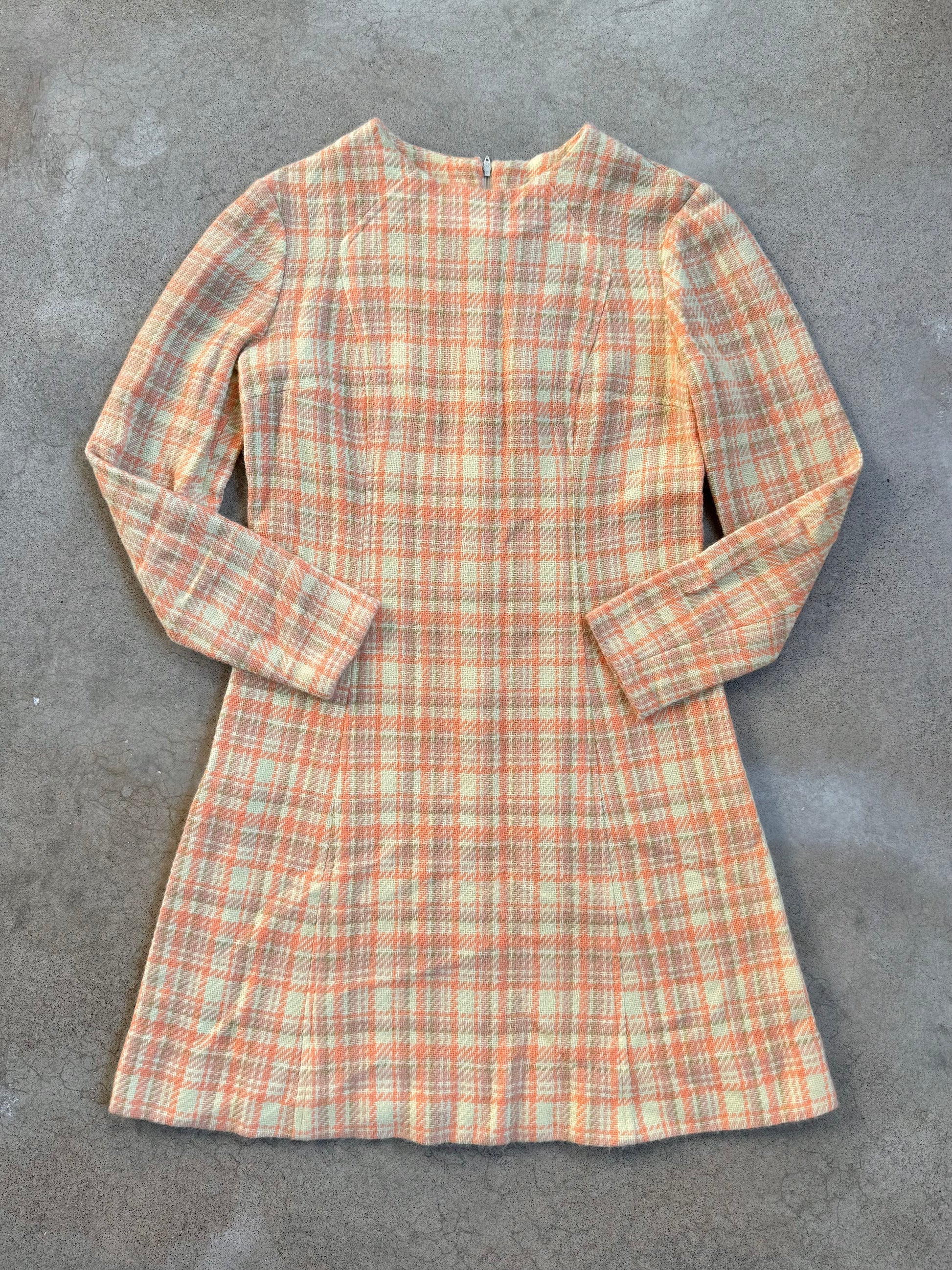 Vintage 1960s Yellow & Orange Pastel Plaid Long-Sleeve Mini Dress. Features a zipper closure at back. Wool-blend fabric, fully lined.
