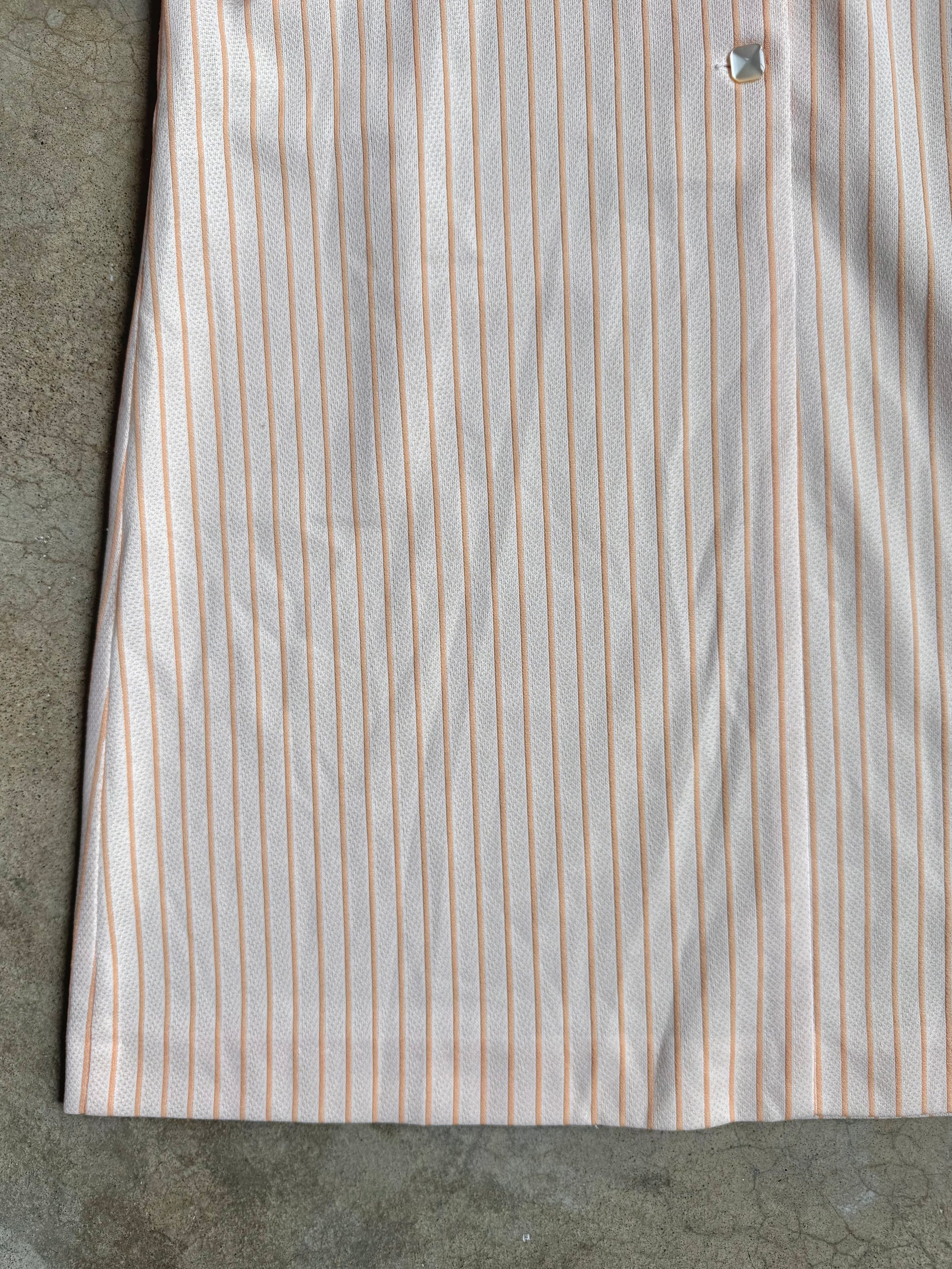 Vintage 1960s Muted Orange Striped Shift-Style Long Sleeve Shirt Dress. Features square button closures half-way down the front & pointed dagger-style collar. Polyester fabric.