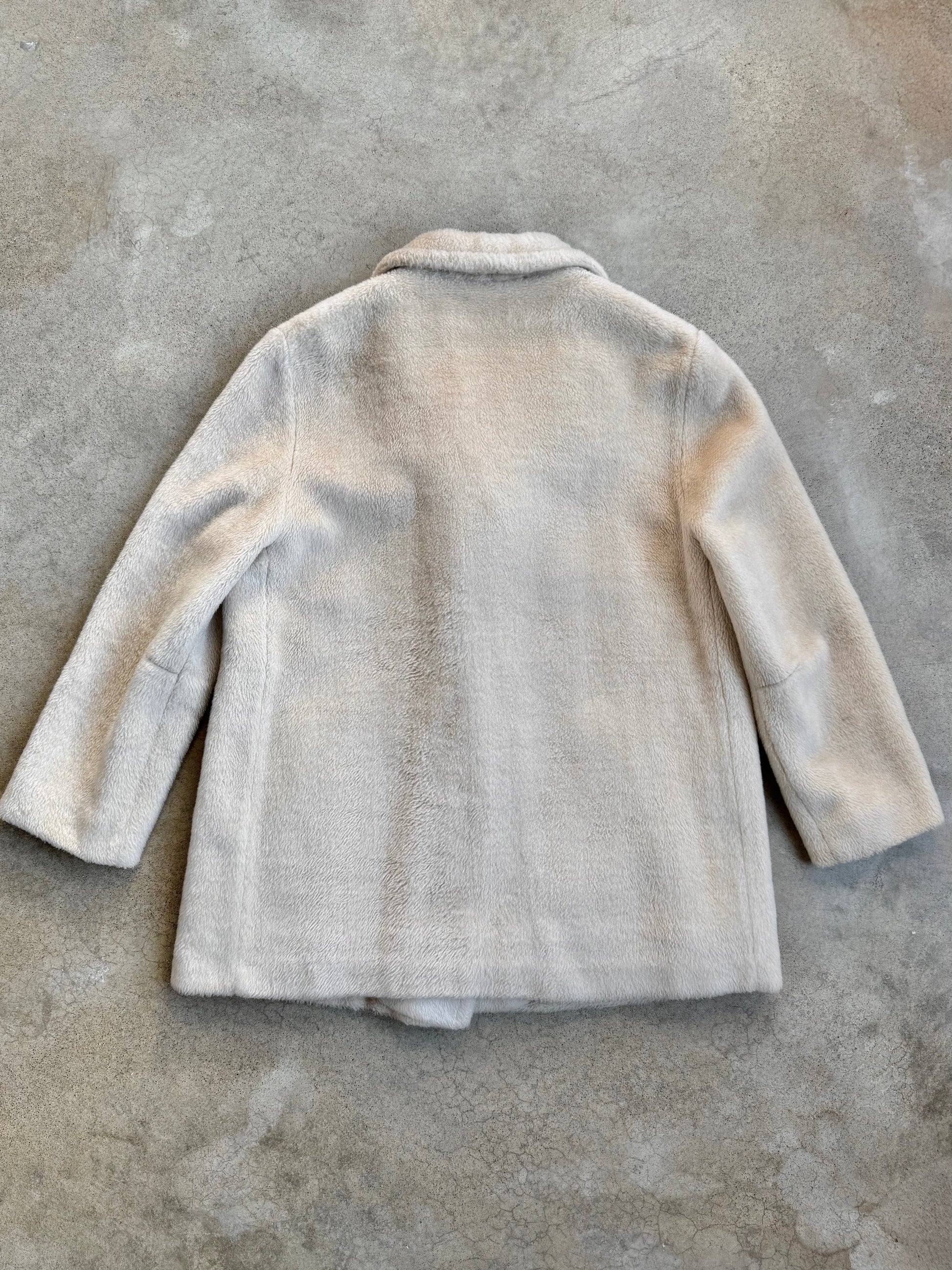 Vintage 1960s Sears Beige/Cream Faux Fur Peacoat-Style Double-Breasted Coat w/ Green Plaid Lining.