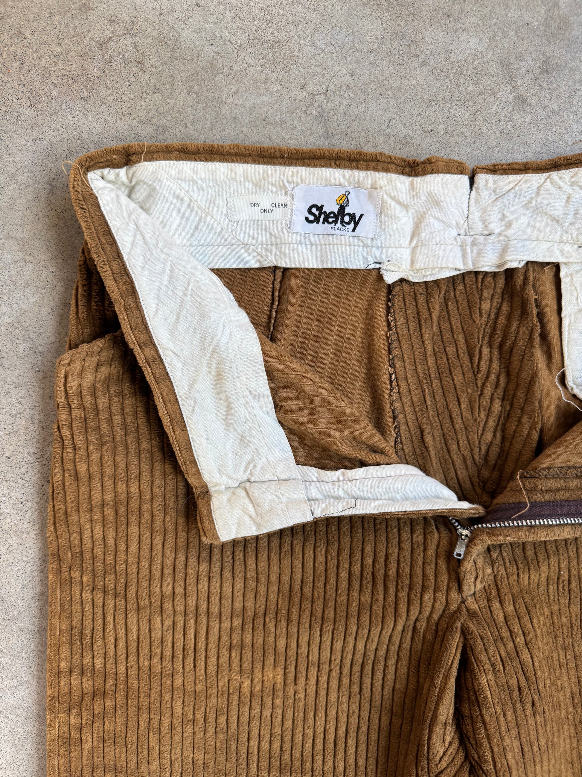 Vintage 1960s Shelby Slacks Brown Wide Wale Corduroy Bootcut / Flare Trousers. Features a zipper fly w/ clasp closure, front pockets & one buttoned back pocket.