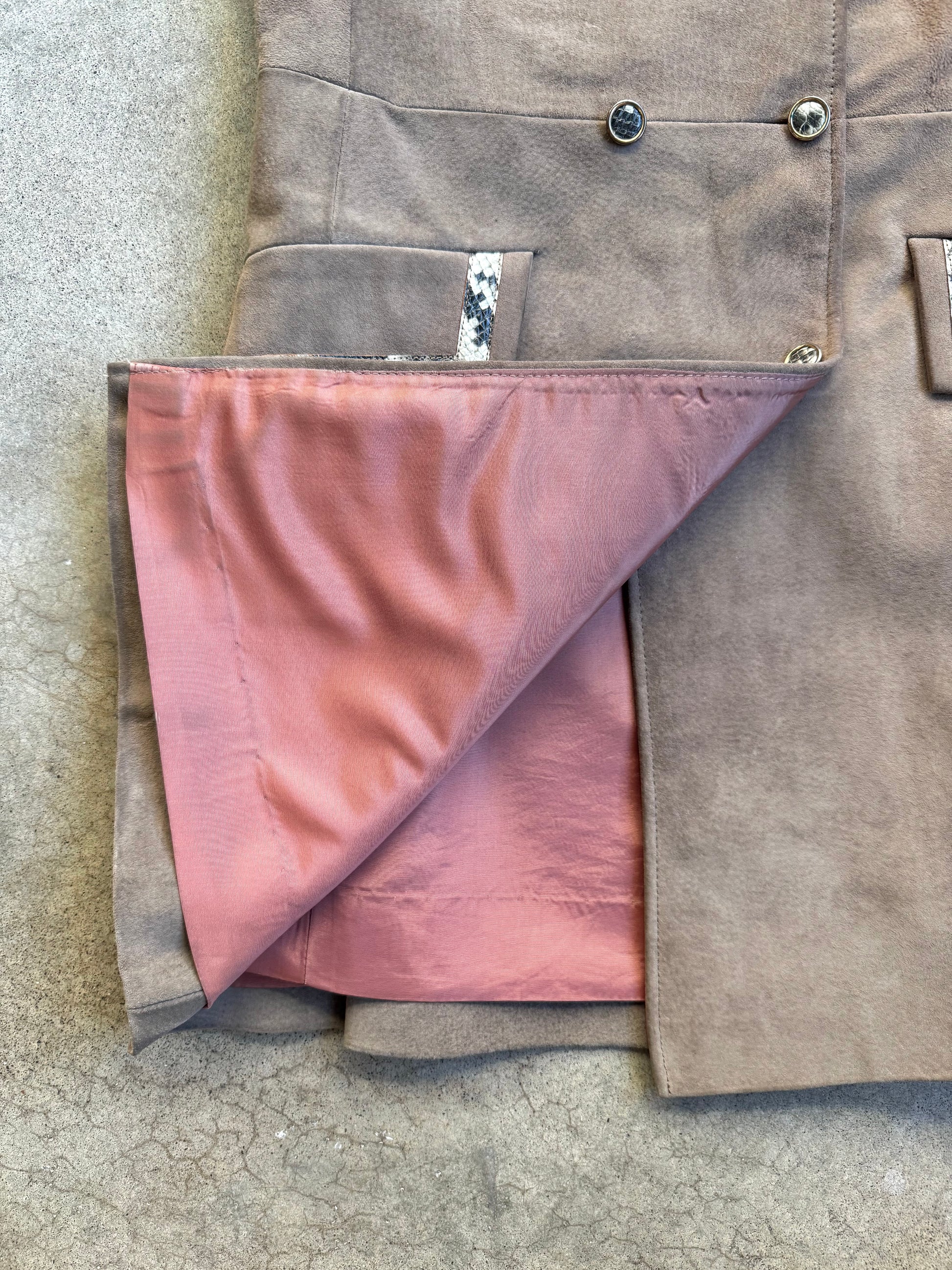 Vintage 1960s Taupe Suede Leather Button-Front Sleeveless Mini Dress w/ Faux Snakeskin Trim Detailing. Fully lined.