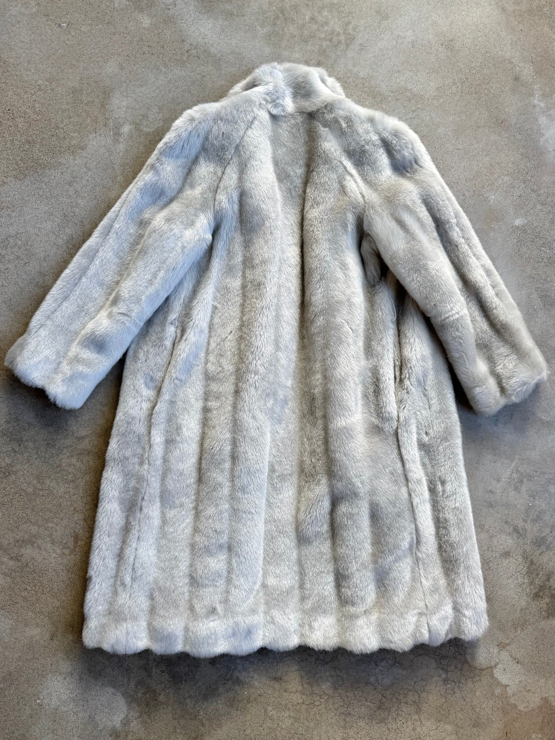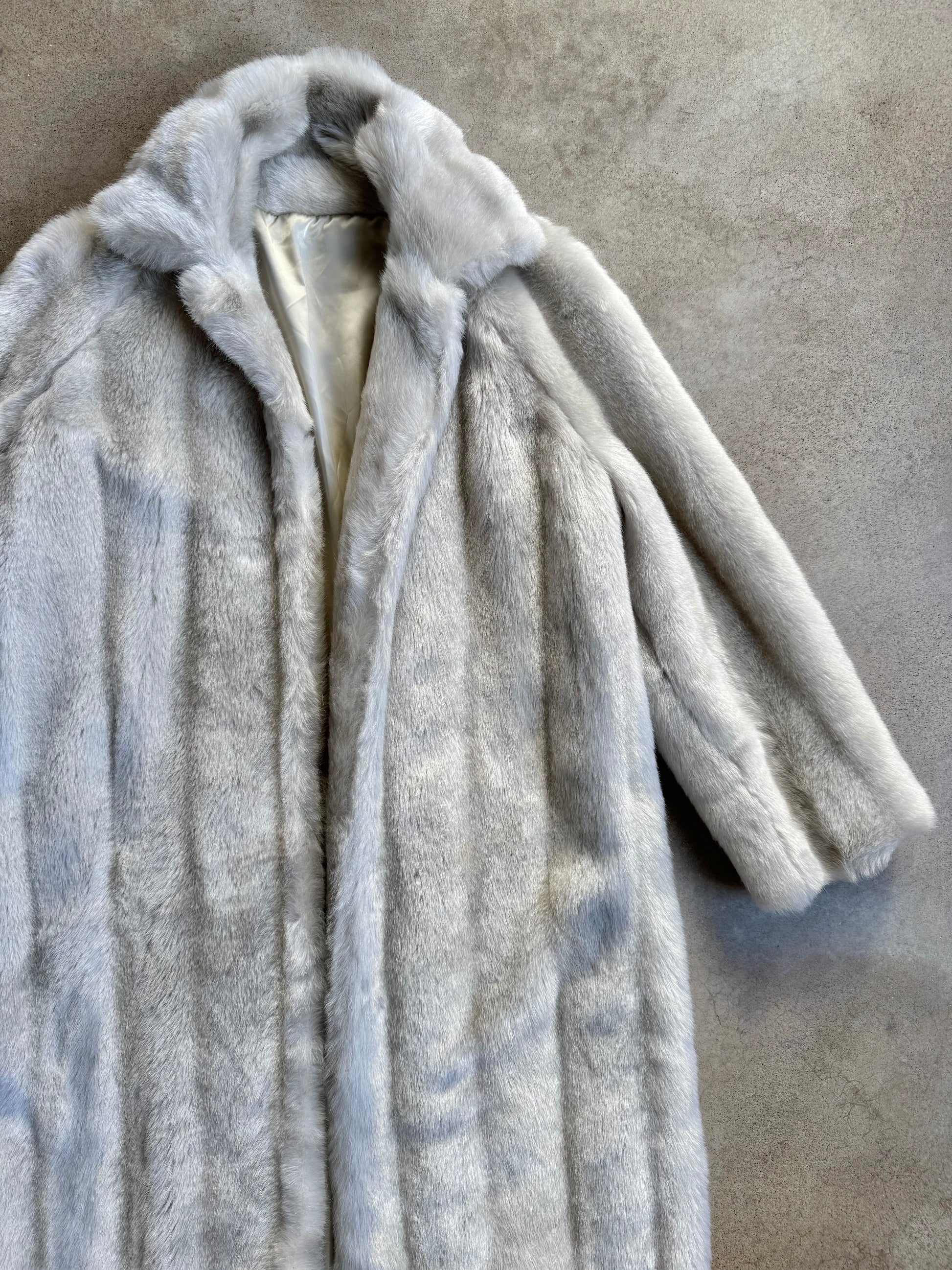 Vintage 1960s Grey-White Faux Fur Overcoat. Features two side slit pockets, no closures. Fully satin lined.