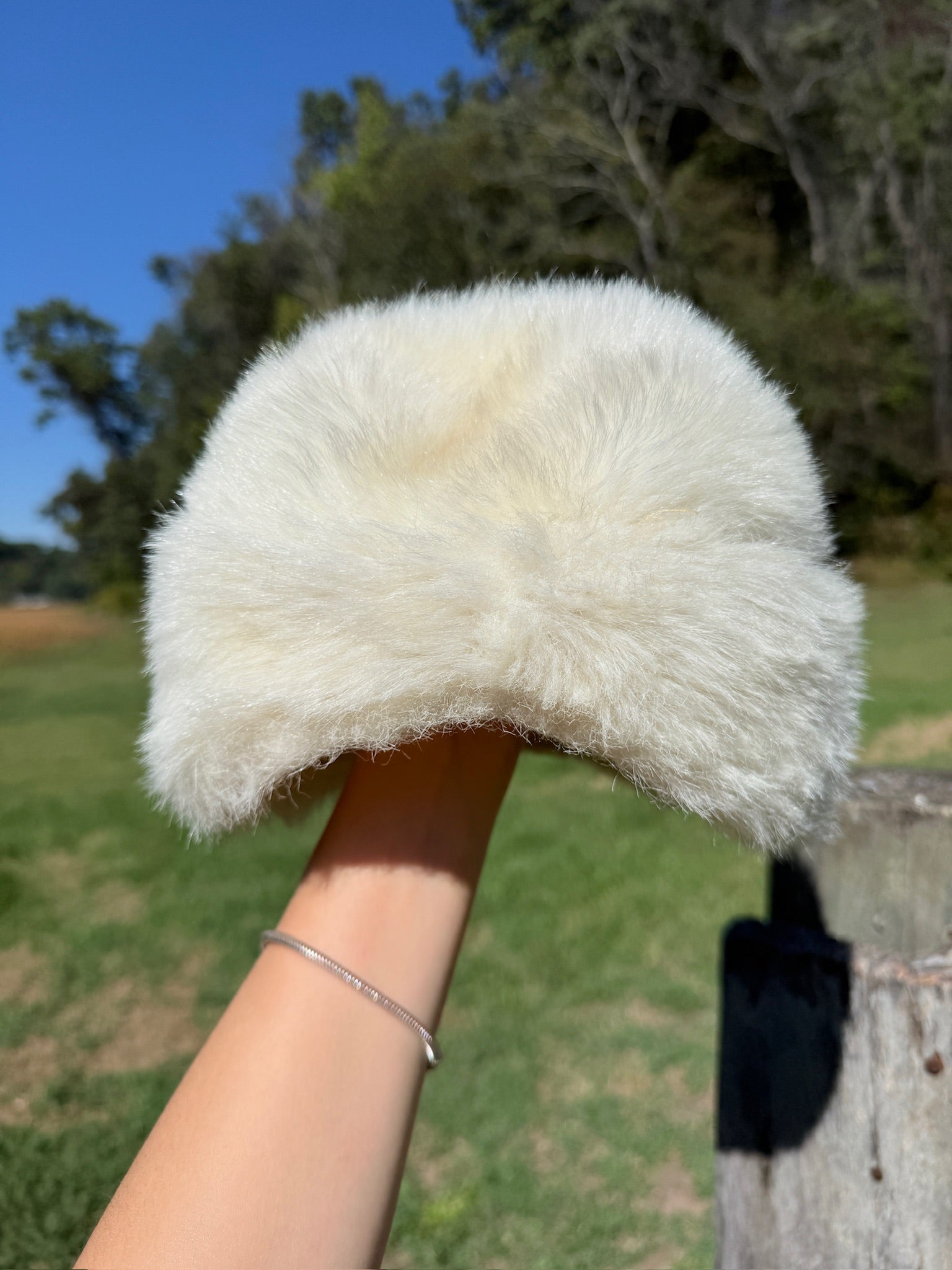 Vintage 1960s White/Cream Faux Fur Winter Pillbox Hat.
